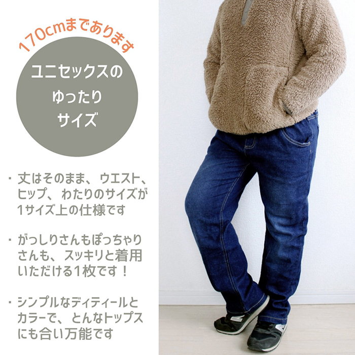 | 商品説明 | ・・丈はサイズ通り、ウエスト・ヒップ・わたりのサイズは1サイズ上のゆったり仕様! ・スッキリと着用いただける1枚でユニセックスで着用可能! ・しなやかストレッチデニムでやさしく快適な履き心地。ウエストはぐるっと総ゴムで着脱もラクラク。 ・どんなTOPSにも合わせやすく、通園・通学に便利。しっかり手の入るポケット付。 |