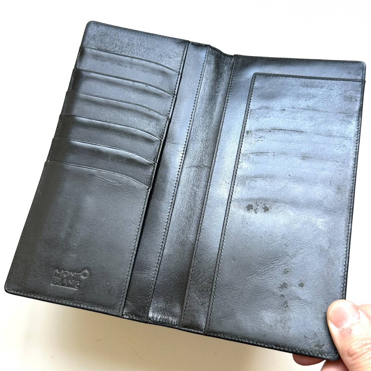 商品説明 | ご覧いただき誠にありがとうございます。 モンブラン Mont Blanc 長財布 お札入れ になります。 色はブラックです。 こちらは小銭入れがないタイプになります。 ご注意ください。 全体的に使用感があります。 特に内側にはスレ傷が見られます。 付属品(箱等)は揃っております。 白い箱には破れがあります。 仕様 縦19cm、横10cm、厚さ1cm、お札入れ、カード入れ×6、フリーポケット×3 |