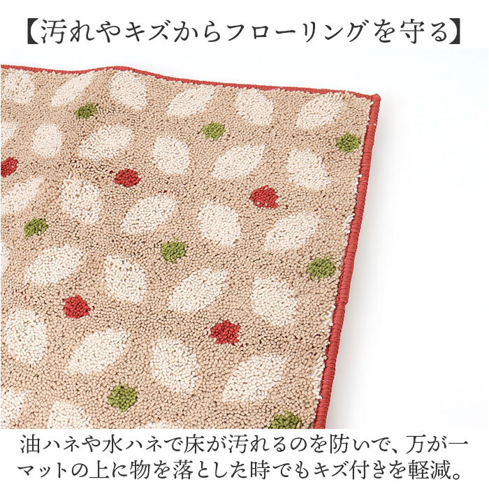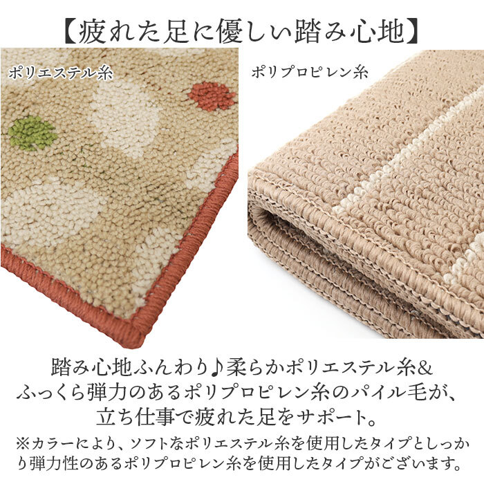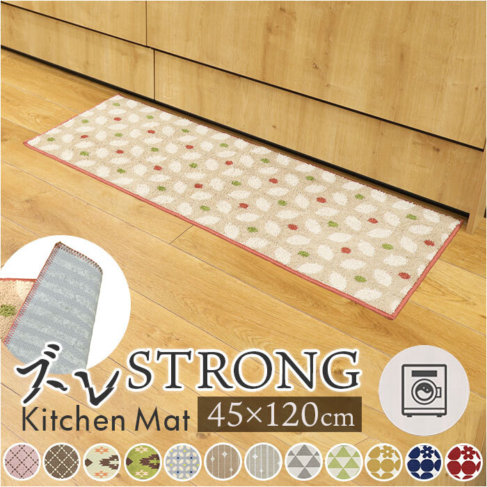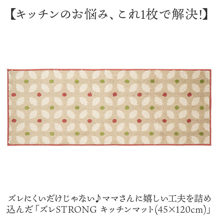 | 商品説明 | ・・【キッチンのお悩み、これ1枚で解決!】 ・ズレにくいだけじゃない♪ママさんに嬉しい工夫を詰め込んだ「ズレSTRONG キッチンマット(45×120cm)」 ・【汚れやキズからフローリングを守る】 ・油ハネや水ハネで床が汚れるのを防いで、万が一マットの上に物を落とした時でもキズ付きを軽減。 ・【ふんわりソフトな踏み心地】 ・踏み心地ふんわり♪柔らかポリエステルのパイル毛が、キッチンでの立ち仕事で疲れた足をサポート。 ・【滑り止め効果3倍で、ズレに強い】 ・裏面は滑り止め効果の高いTPR素材のボーダー加工済み。掃除機をかけてもズレにくくストレスフリー。 ・※メーカー従来品に比べ、約3倍ズレにくい滑り止め加工を採用。 ・【床暖房にも、もちろん対応】 ・耐熱温度が比較的高いTPR樹脂で底面を加工してあるため、床暖房のフロアにもきちんと対応! ・【丸洗いできて、いつでも清潔】 ・パタパタと折りたたんで洗濯ネットに入れれば、洗濯機で丸洗いOK!日常のお手入れがもっと気軽に。 ・※ほかの物と分けたうえで必ず洗濯ネットを使用し、弱水流モードをお洗濯してください。 ・【収納に干渉しない、程よい厚み】 ・システムキッチンの引き出しが干渉せず、ロボット掃除機もスムーズに通過できる程よい厚みを追及。 ・【ミニキッチンにぴったりサイズ】 ・ワンルームのミニキッチンでも使いやすい45×120cmサイズで、シンク前スペースをピタッとカバー。 ・【いつものキッチンがパッと華やぐ】 ・レトロ可愛いお花柄やラグ風のオルテガ模様等、優しい色彩とPOPな絵柄でより個性的なキッチンに。 |