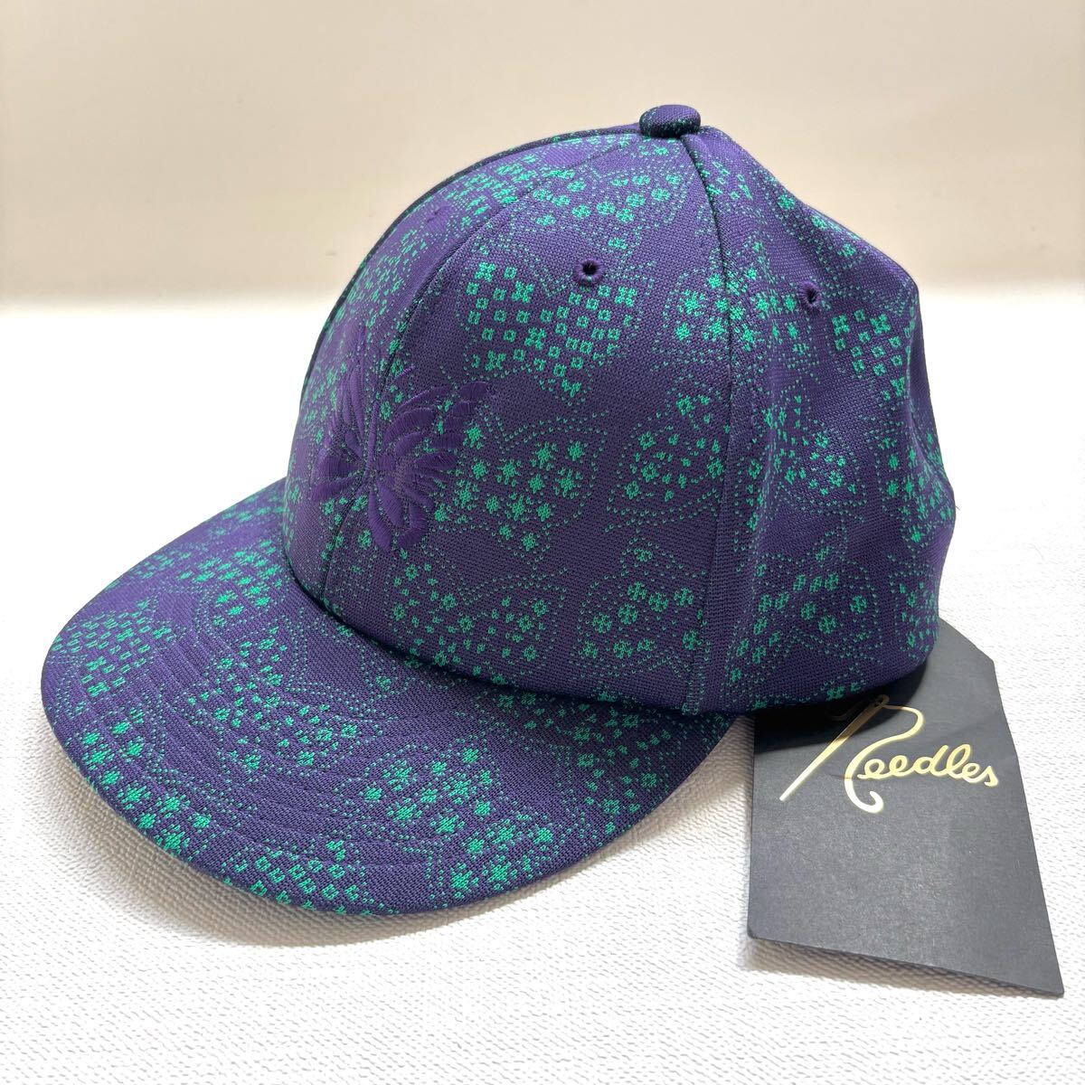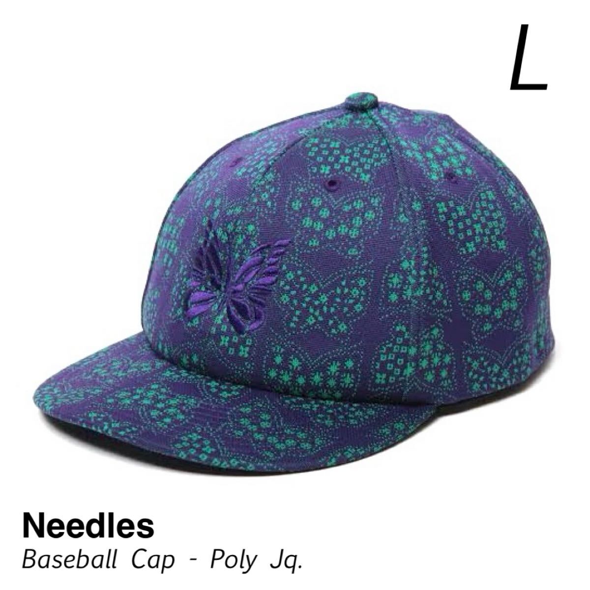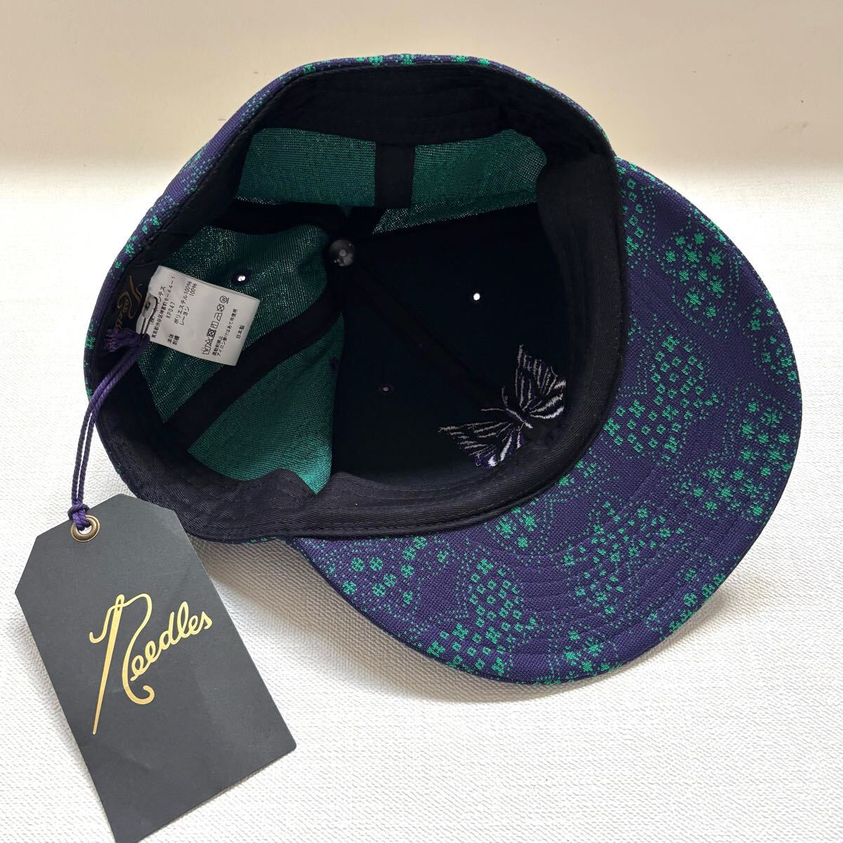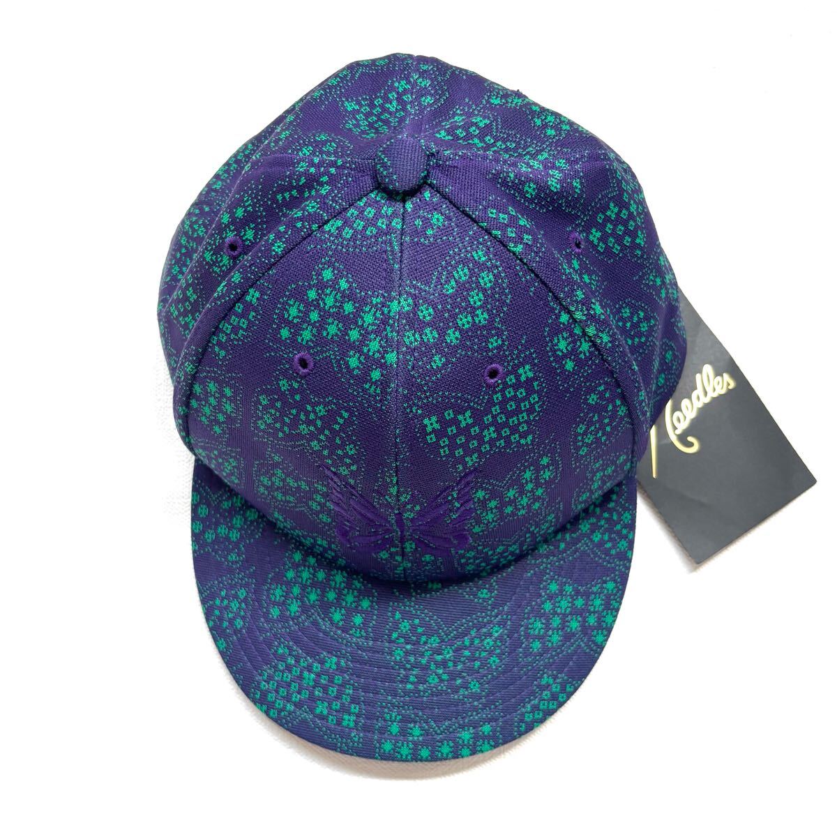 Needlesのオリジナリティ溢れるPAPILLON柄のポリエステルジャカード素材のボディに、パープルカラーのパピヨン刺繍が施されたベースボールキャップ。