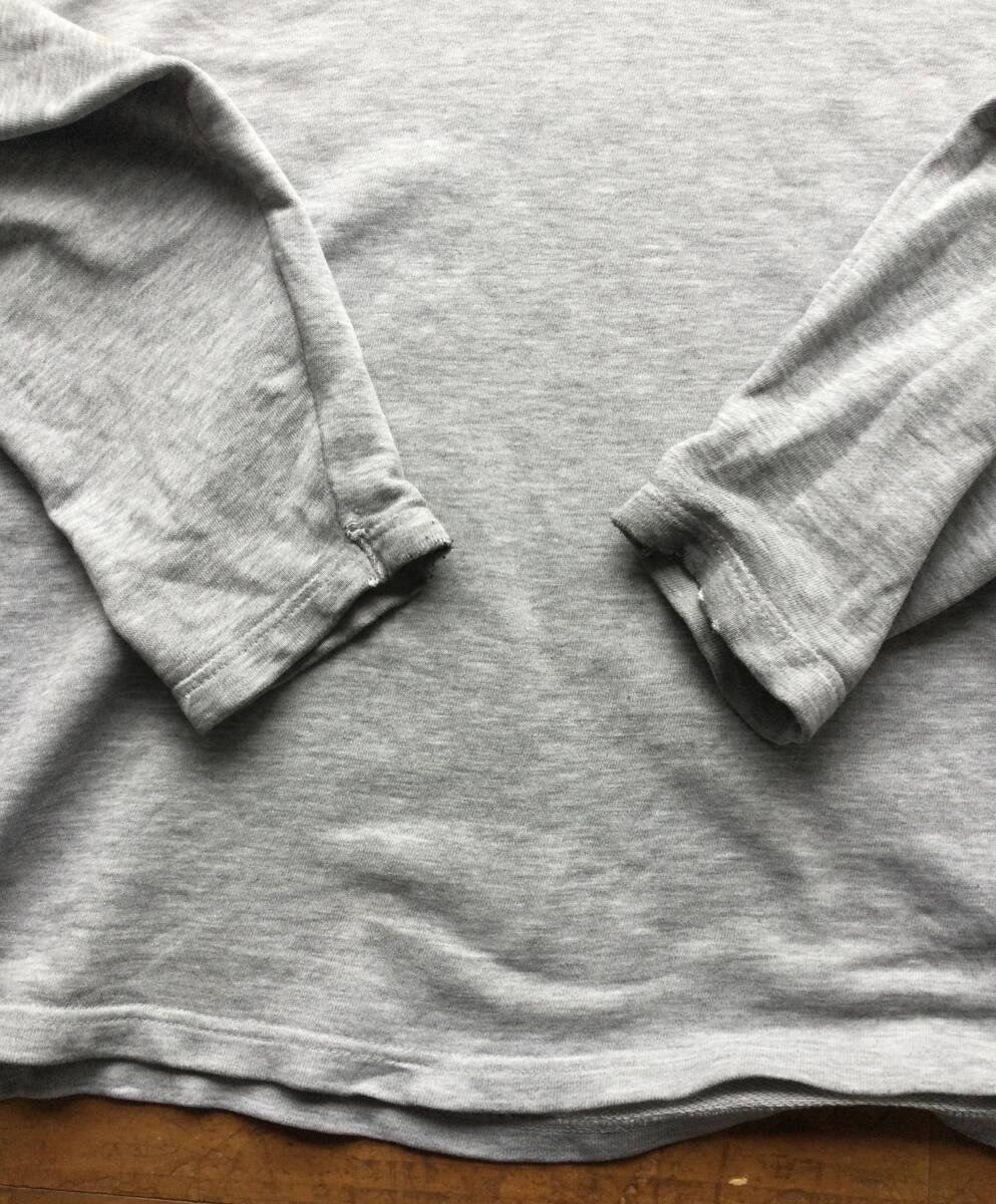 色は定番のグレー系で、品番、サイズはタグが消えて不明です。素材は 綿100%と推測、トレーナータイプです。キャンプ等のアウトドアやハーレー等バイカーやアメカジに似合うシャツです。