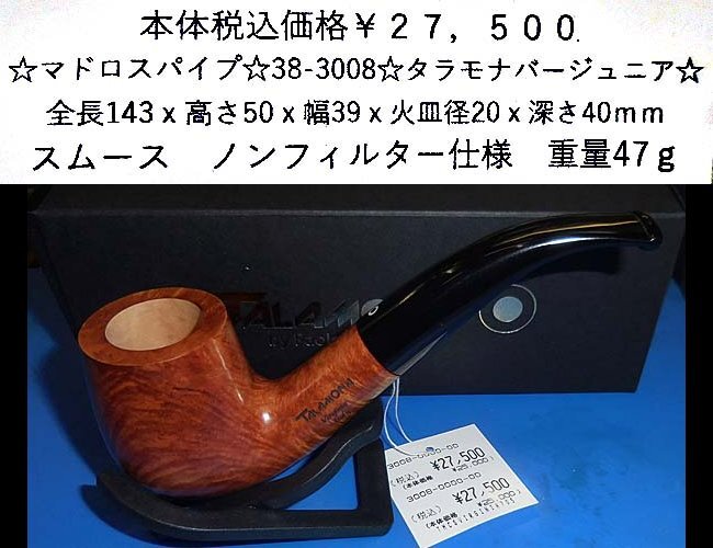 現物を写真撮影、お手元にこの写真の品が届きます。タラモナバージュニア スムース ベントパイプ。火皿はノーカーボンの為吸いなれ方にお勧めなパイプです。ノンフィルタータイプでタバコの味をそのまま愉しめる。ビンゴが出品している全ての商品は、店頭販売、オークション販売、ショッピング販売等重複し販売しております。時間差で売れ切れや、出荷点検検等で傷が付いていたり破損している事もあります。従いまして、お買い上げ頂きましても出荷出来ない場合も有りますので、予めご了承の上お買い求め下さい。ご注文商品は他商品と同梱配送出来ますので、何個ご注文されても送料は1口分です。1.レターパック発送 ¥600 日時指定不可。(郵便レターパック)。2.宅配便発送税込み ¥880日時指定必須(沖縄/離島は別途価格)。必ず 受取日時 をご指定下さい。(例:15日 18~20 時必着)再配達防止の為。 (業者は当社にお任せ)。3.代金引換発送引手数料税込み ¥1、210 日時指定必須(沖縄/離島は別途価格)。 必ず 受取日時 をご指定下さい。(例:15日 18~20 時必着)再配達防止の為。(業者は当社にお任せ)。