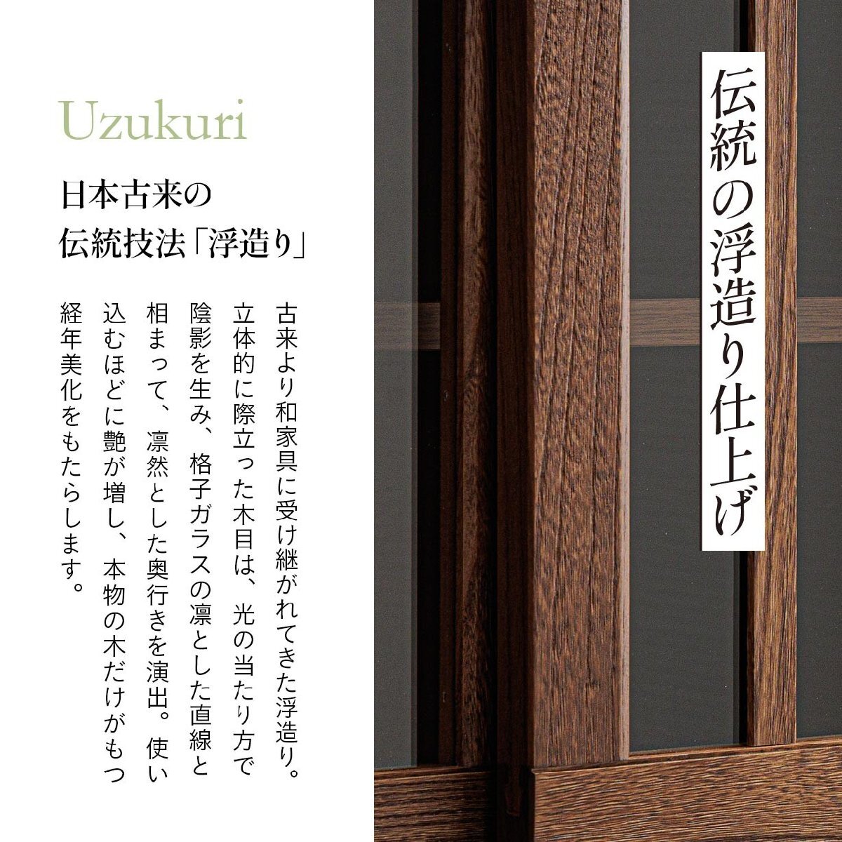 木材の表面をブラスト処理し、木目に凹凸をつけ、年輪を浮かび上がらせる仕上げ方法。表面の木目を浮き立たせる(早材部と晩材部の凹凸)ことにより、表面が固くなり傷がつきにくく、磨耗が少なくなる特徴があります。「木目の美しさ」と「掘りの深さ」が際立ち、光の陰影が醸し出す天然木の風合いをお楽しみいただけます。