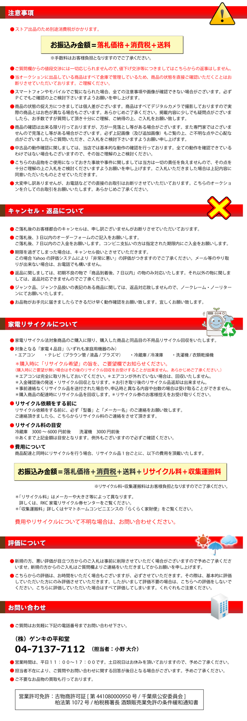 ◇領収書の発行が可能となっております。商品発送完了後、当店より「取引ナビ」にメッセージを送信いたします。メッセージ内のリンクより必要に応じ、明細付き領収書をダウンロードしてください。 (※コンビ二決済の場合はコンビニからお受け取りの領収書・受領書が、正式に領収書となります。) ◇実店舗での販売と併売させて頂いている商品もございます。その場合ご入札頂いたタイミングによっては、稀に売り切れにより、在庫切れになってしまう場合がございます。ご了承ください。 ◇商品画像は明るさを調整しております。 パソコン上で表示される色は各モニターの性能や設定により異なり、実物と画像の色合いが多少違って見える場合がございます。 ◇商品の確認は出来る限り行っておりますが、汚れやダメージの見落としがある場合がございます。必ず商品画像もご覧のうえ、ご不明な点やご心配な点がございましたら、ご質問いただけますようお願い申し上げます。 ◇当店で取り扱っている商品はすべて買取品となっております。新品をご希望の方は、誠に恐れ入りますが、ご入札をご遠慮くださいますようお願い申し上げます。 | |