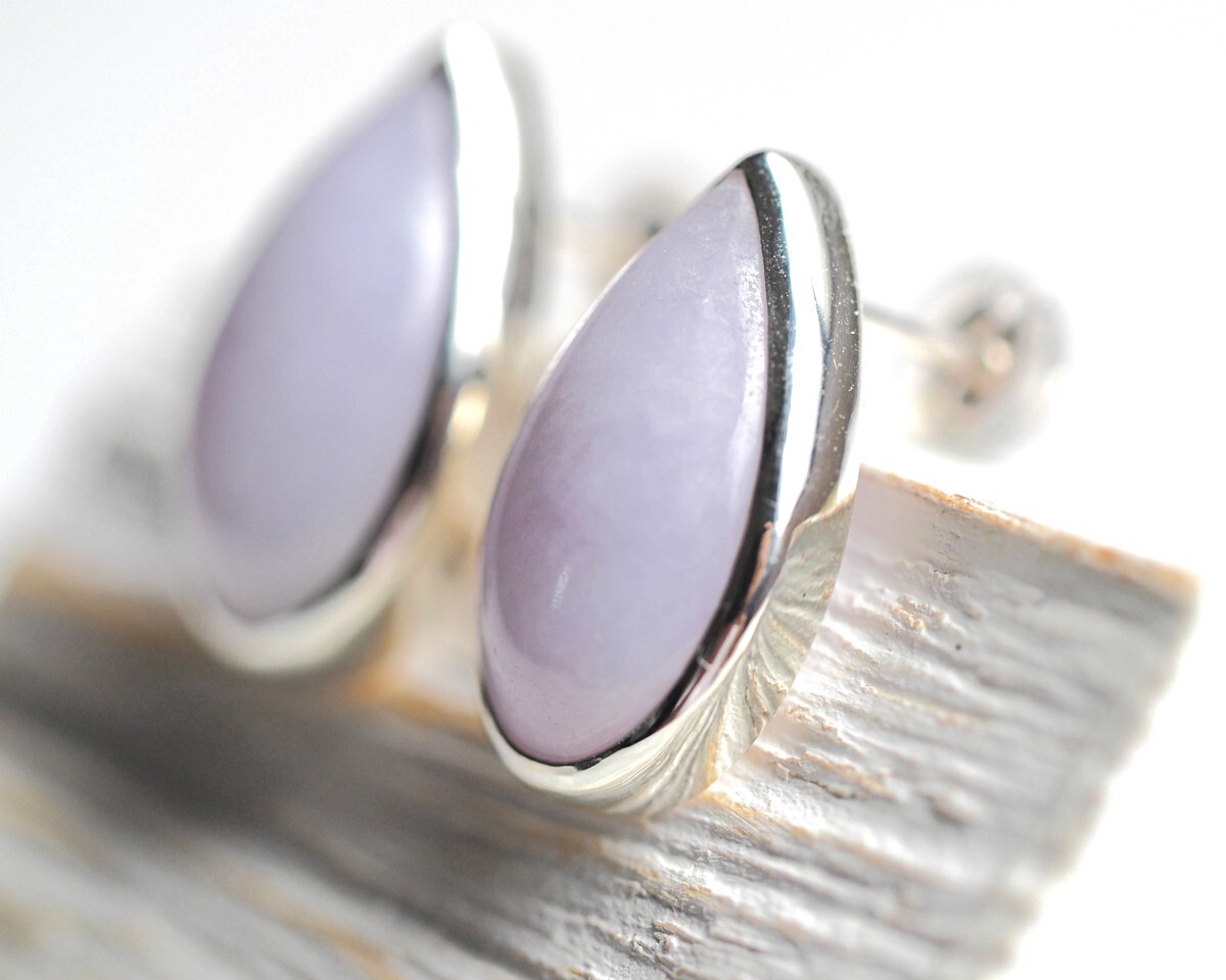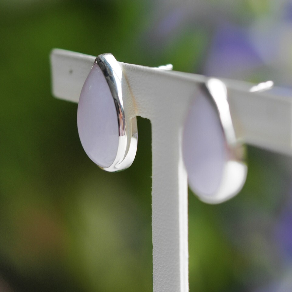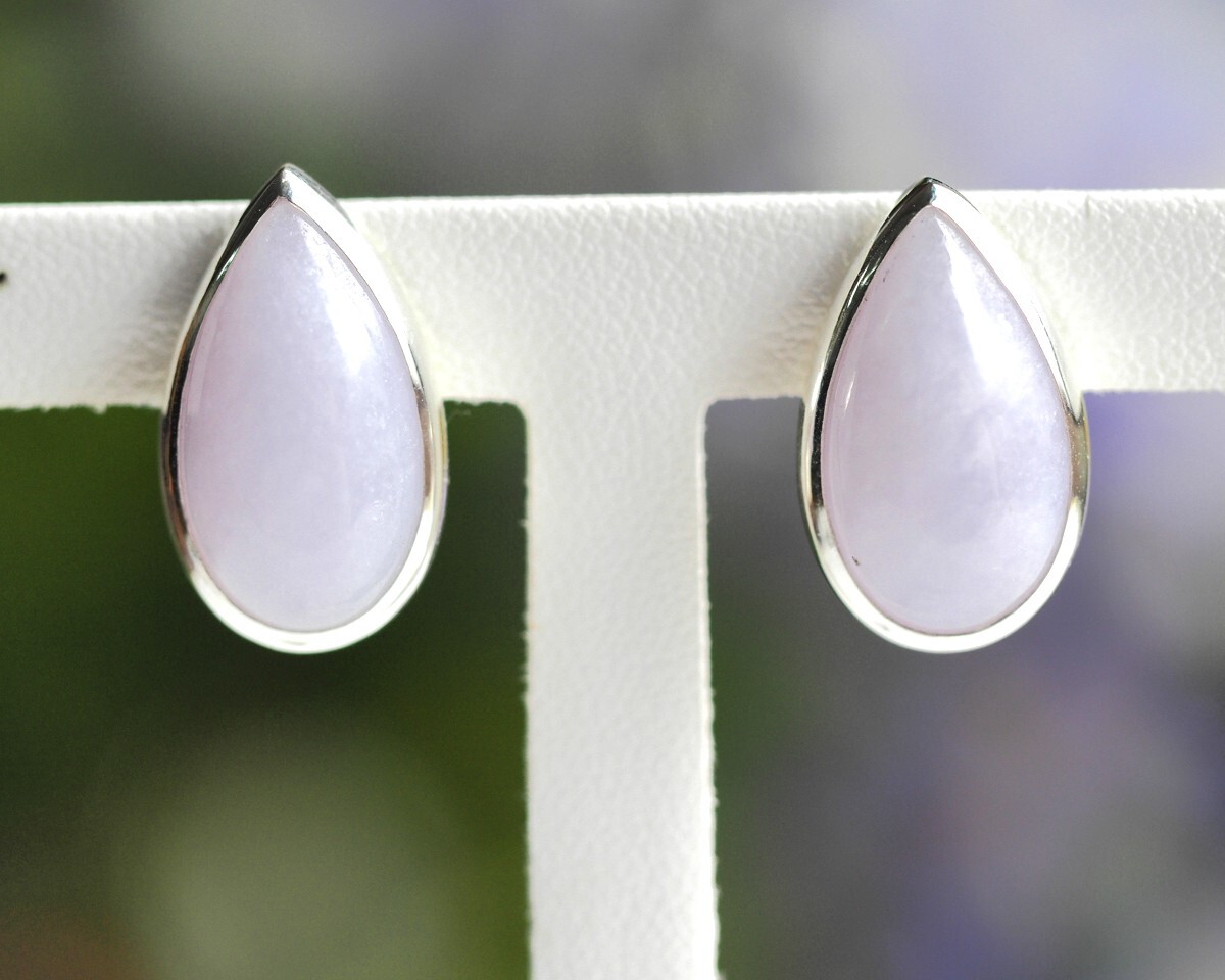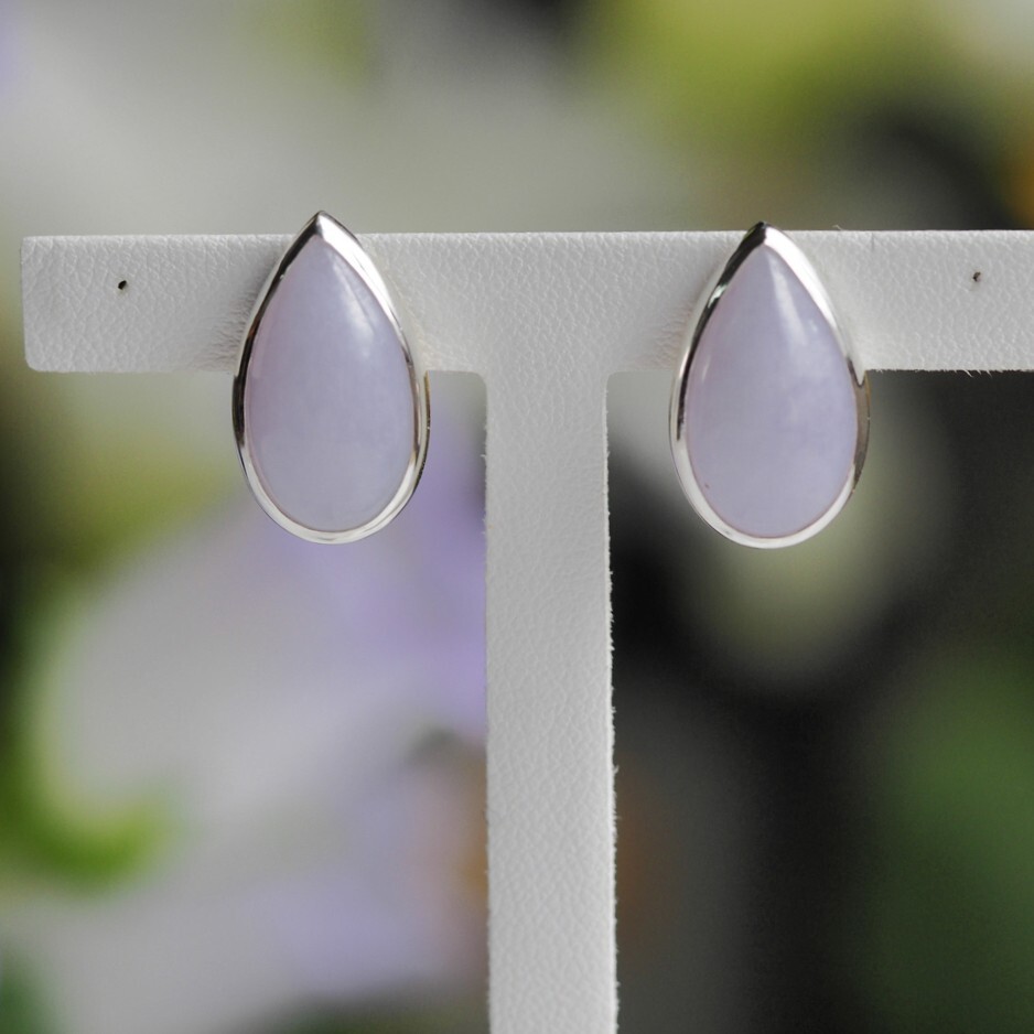 こちらはホワイトにわずかなラベンダーを混ぜ込んたナチュラルカラーの糸魚川翡翠を使用してシンプルなピアスに仕上げしております。