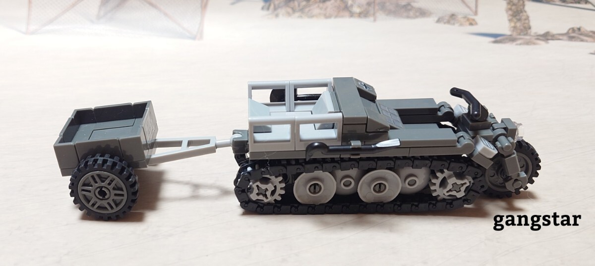 第二次世界大戦中にドイツを中心に使われました、ケッテンクラート 軍用トラクターのミリタリーブロック模型です。 付属として、兵士2名、牽引トレーラー、テント、木箱、土嚢、アクセサリー類等が付属いたします。