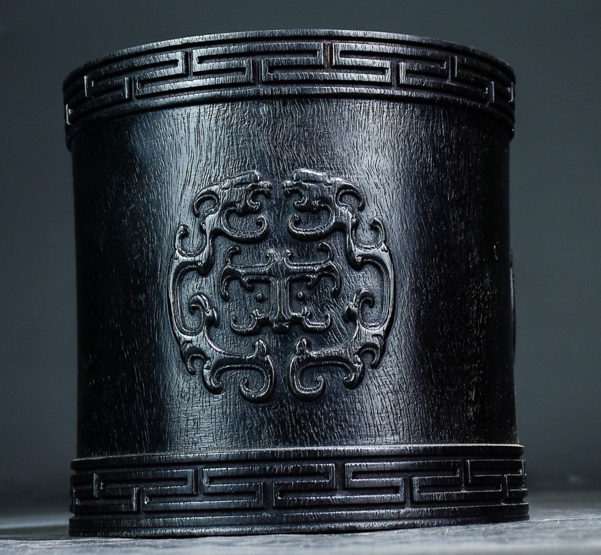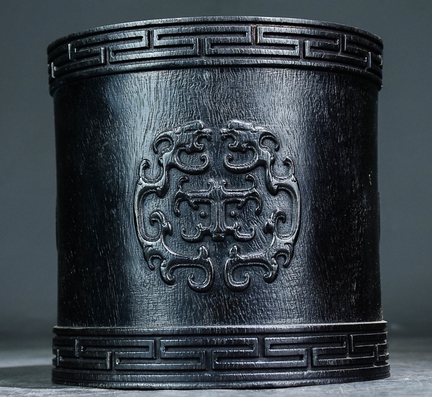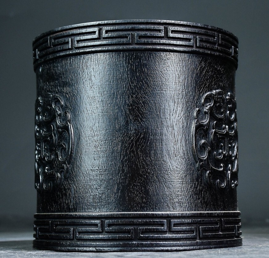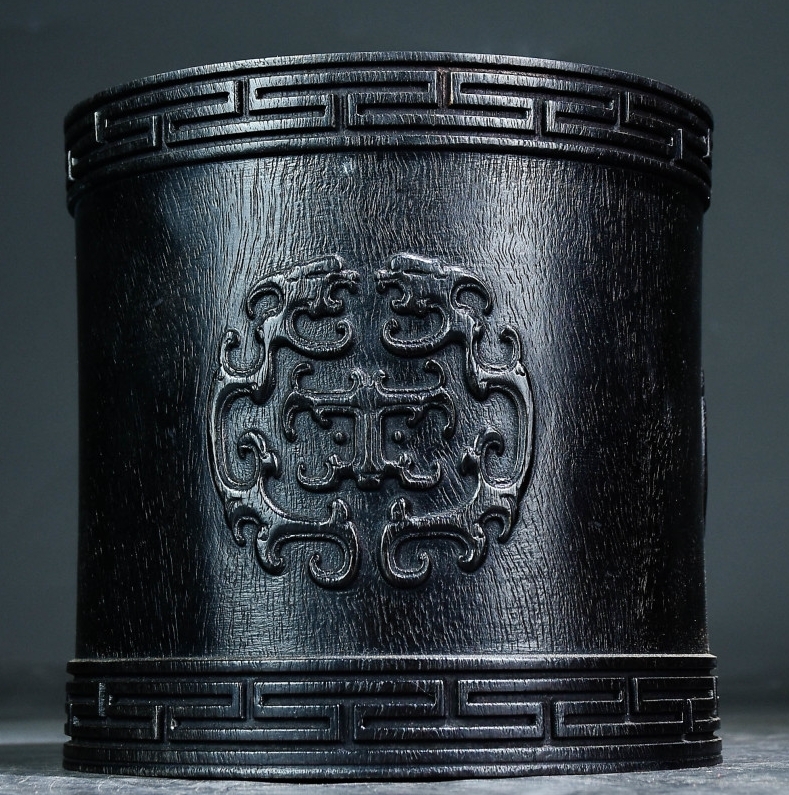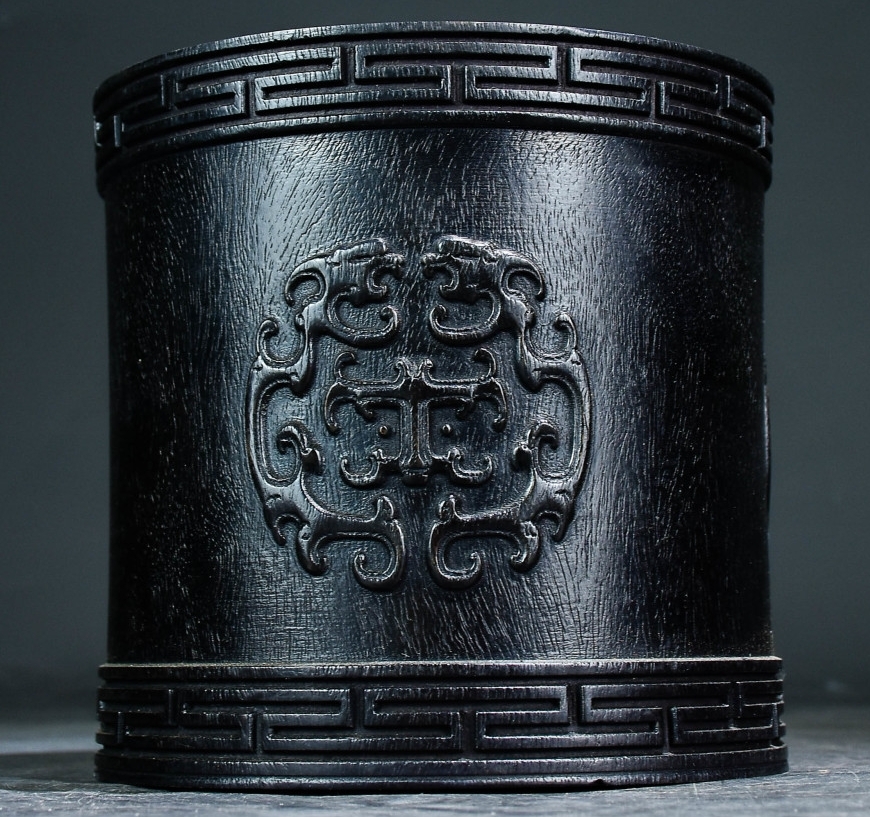 *珍品旧蔵* 清 木材細密彫 血檀 彫刻 キレート竜紋 筆立て 筆道具 文房具 置物 極細工 唐物 中国古玩 骨董品 古美味 H45