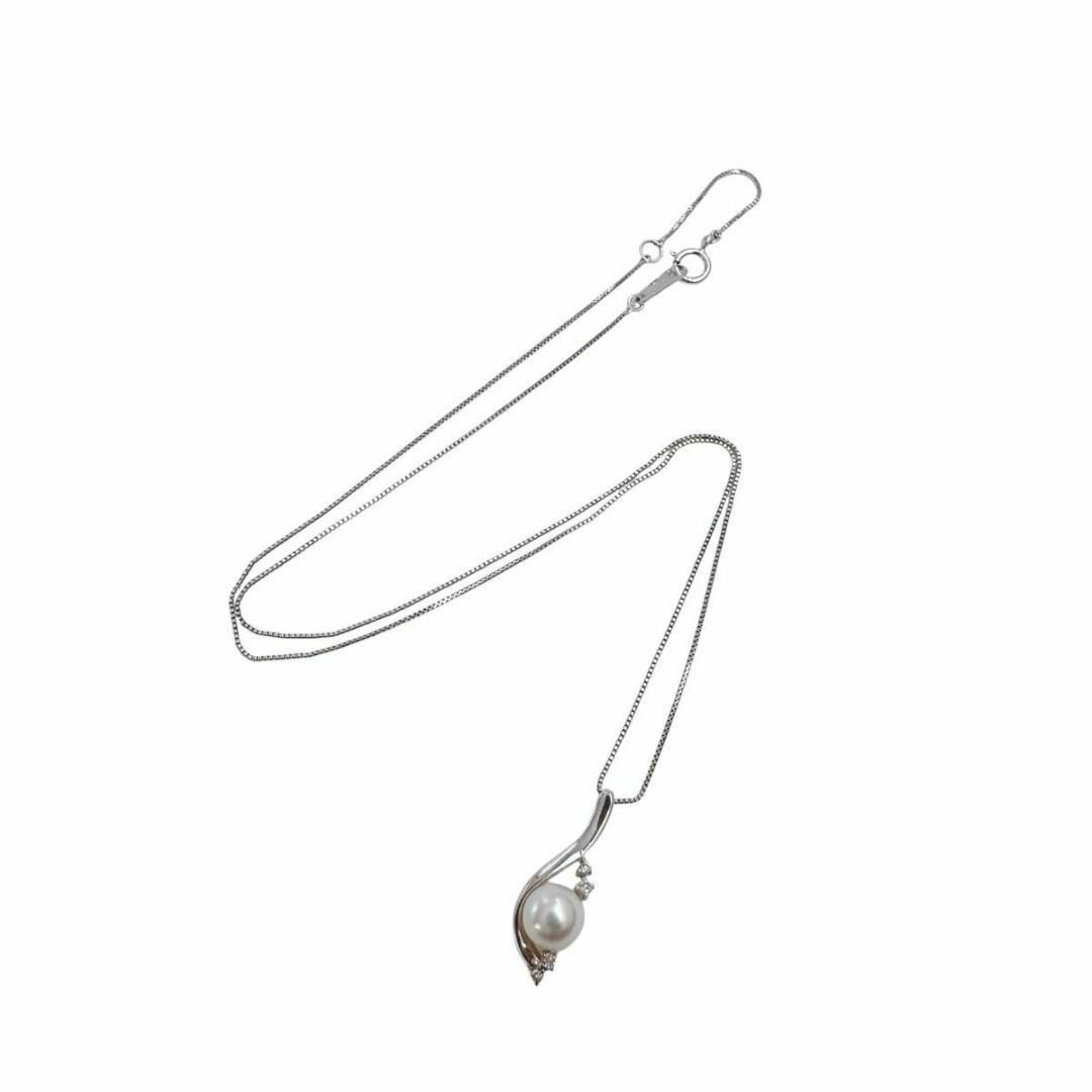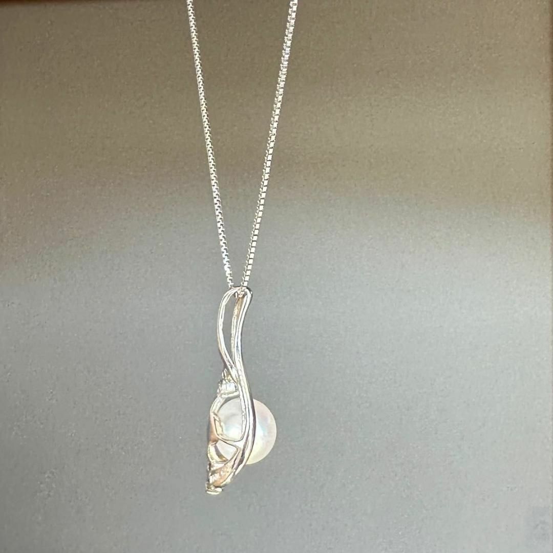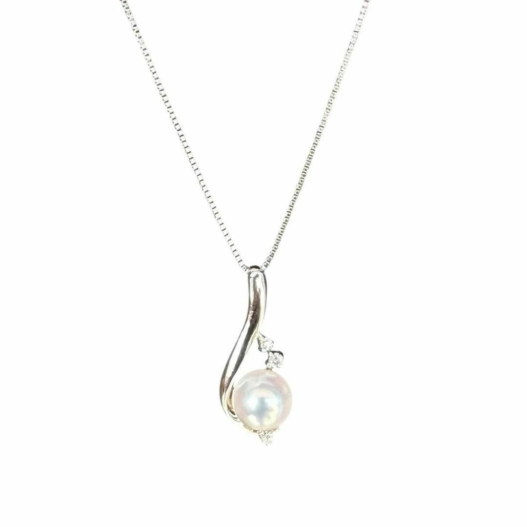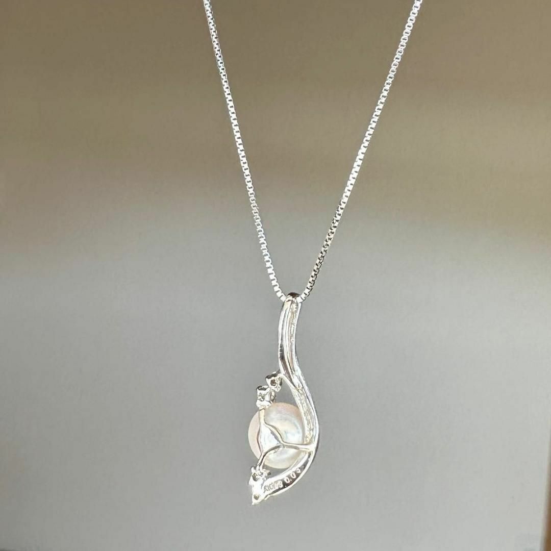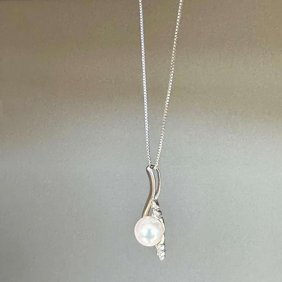 ドロップ型のホワイトゴールドに本真珠、ダイヤモンドのコントラストが非常に綺麗で、胸元を上品に演出してくれます。