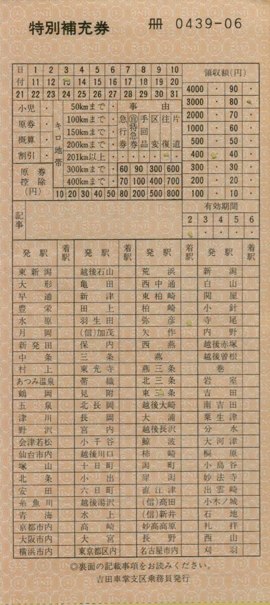 ◎ 国鉄 【 車内補充券 】 駅名選択 吉田車掌支区乗務員発行 越後線 他 車補