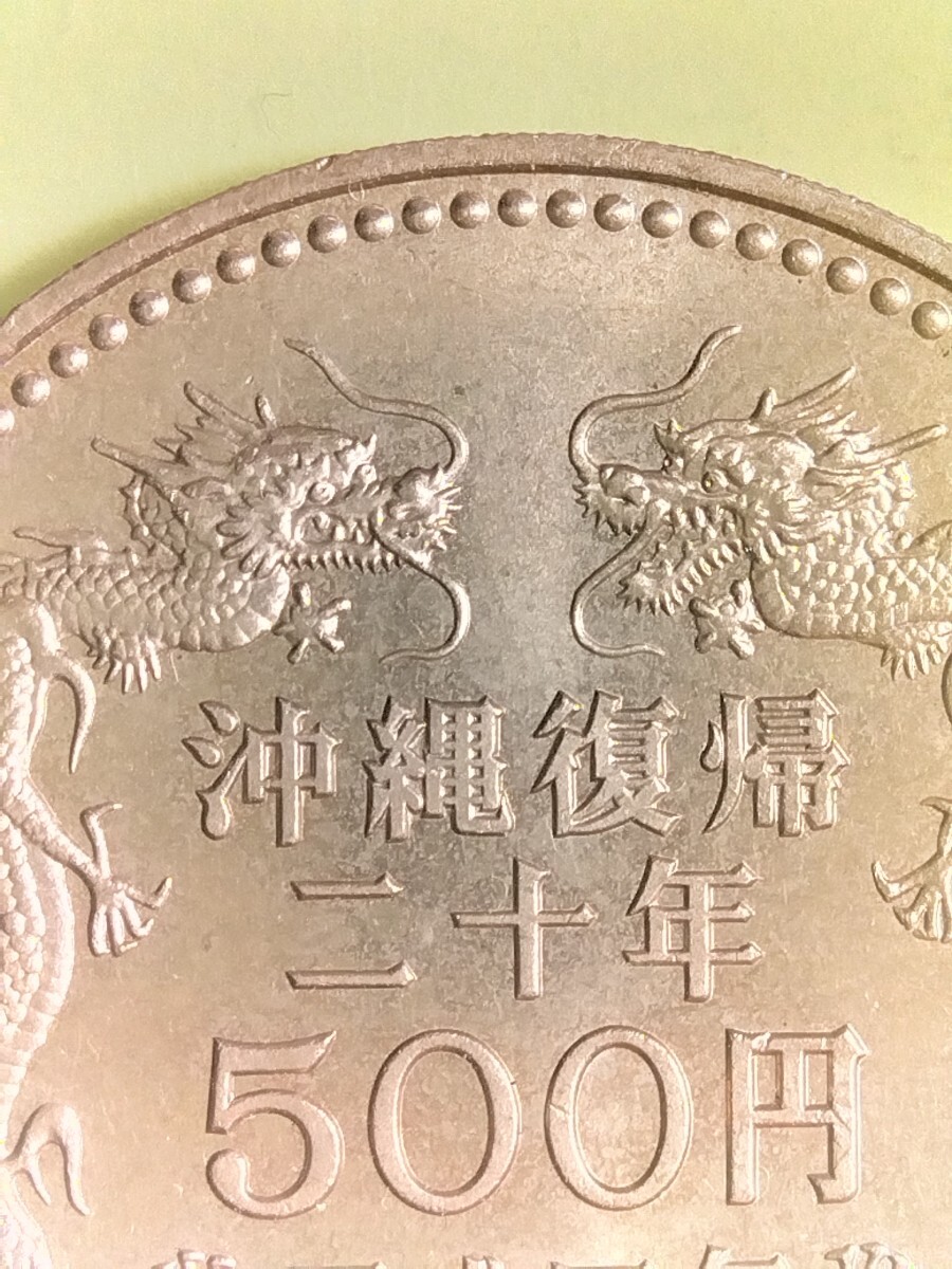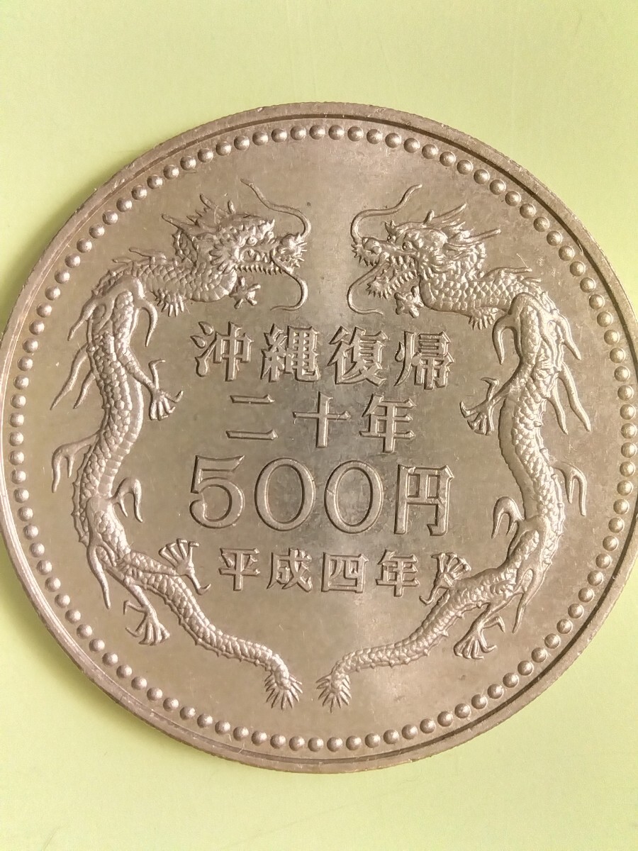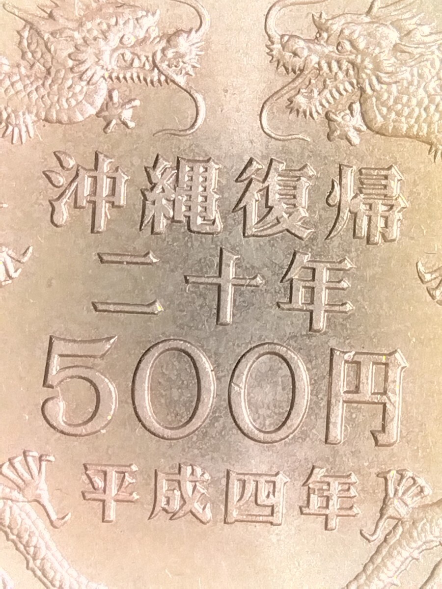 「沖縄復帰二十年」「500円」「平成四年」の文字が刻印されています。