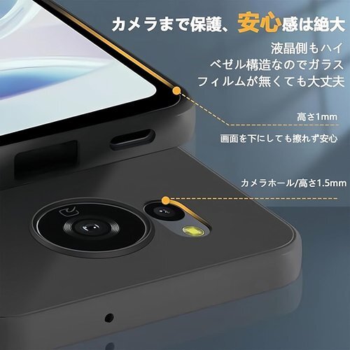 【全面保護】優れた保護性能,耐久性に優れた、キズがつきにくい,衝撃吸収性の高いTPU素材,衝撃やキズ、埃などからしっかりとスマホの背面を守ります。で落下衝撃から本体をしっかりと守ってくれます。フチをわずかに高く設計することで、日常生活の消耗に耐えしっかり保護できる、スマホへのキズつけを防止します。スマホを落としてしまっても衝撃を最小限に抑えるケース。専用にオリジナル設計しているためぴったりとフィットし、保護性能には欠かせないポイントとなっています。携帯 本体の薄さを維持しつつ、ケースカメラ部分にはカメラレンズより0.5mm高く、カメラレンズの周りを保護し、レンズのキズつきを防止できます。