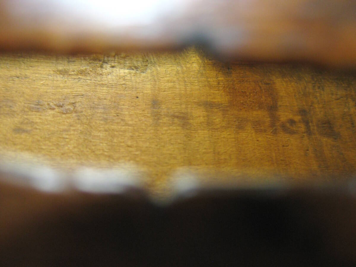 オールドらしく数多くの修理跡(ペグ穴ブッシング、継ぎネック、魂柱パッチ、エボニークラウン、クラック貼り合わせ補強等)が見られ、ひと通り修復済みとなっております。