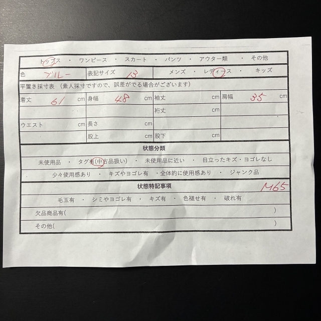 個人採寸ですので、誤差がある場合がございます。