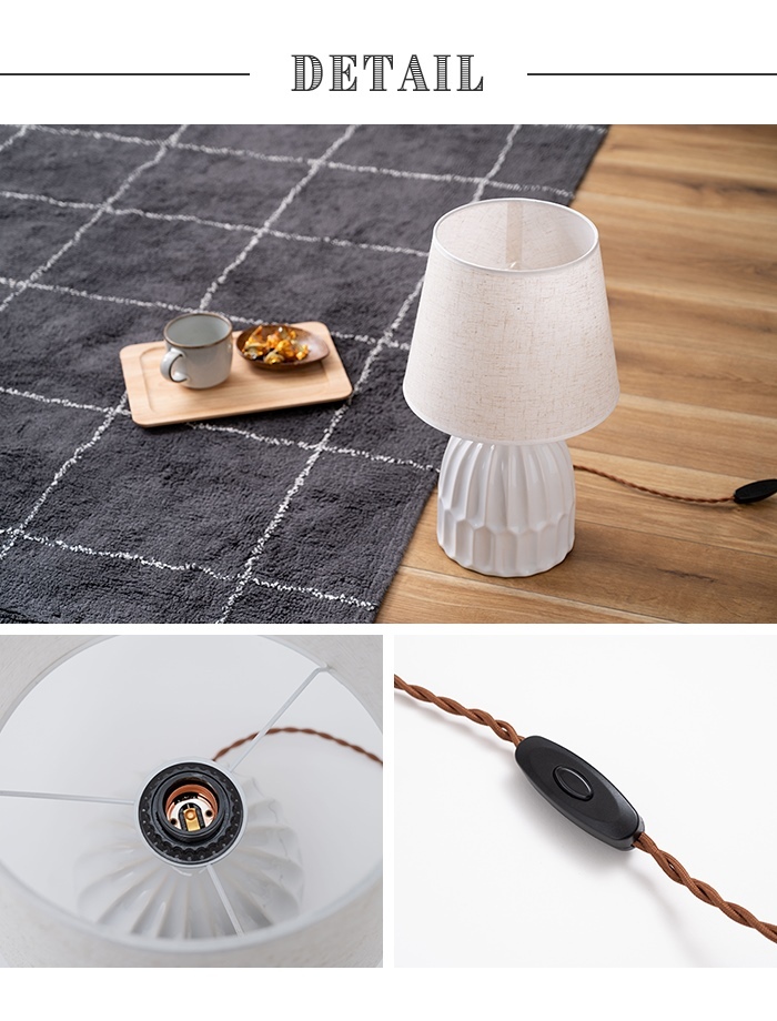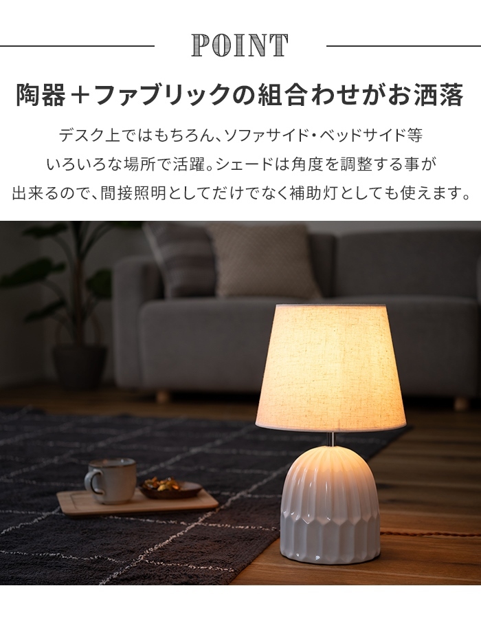 ありそうで無かった「陶器+ファブリック」の組合わせがお洒落なテーブルライト。 デスク上ではもちろん、ソファサイド・ベッドサイド等いろいろな場所で活躍。 シェードは角度を調整する事が出来るので、間接照明としてだけでなく、補助灯としても使えます。 読書タイムの空間を落ち着かせてくれるだけでなく眼にも優しいので、おやすみ前のリラックスタイムにもぴったり。 リラックスタイムが終わったら、手元のスイッチですぐに消灯できます。 テーブルライトは夜間だけでなく、日中のインテリアにも最適。ちょっと物足りなかった空間も、置くだけでグレードアップ。 テーブルライトをお部屋に取り入れて日々の生活をワンラックUP。 |