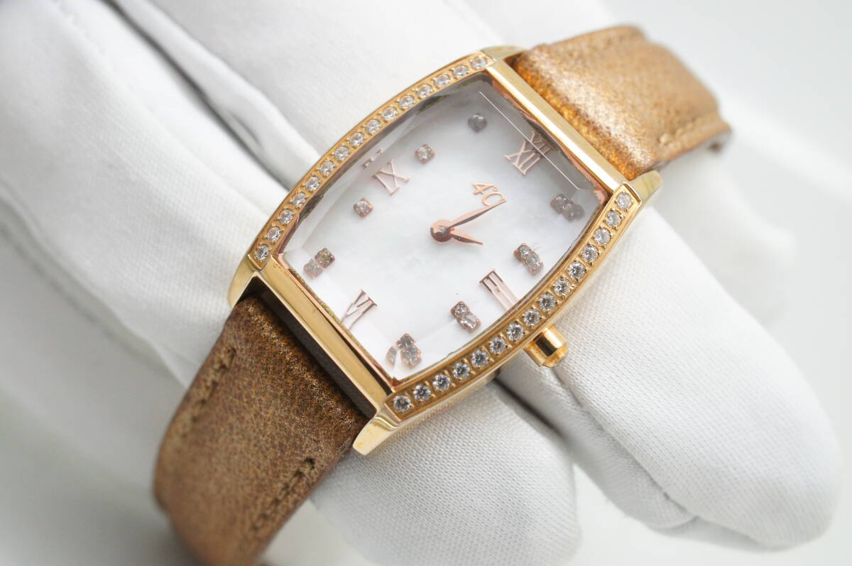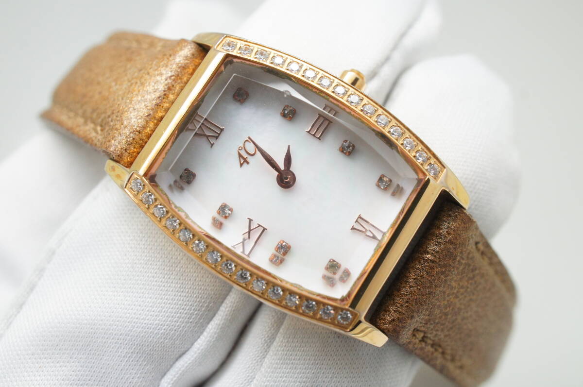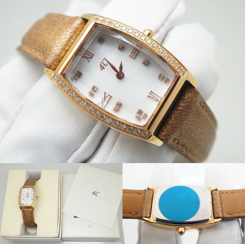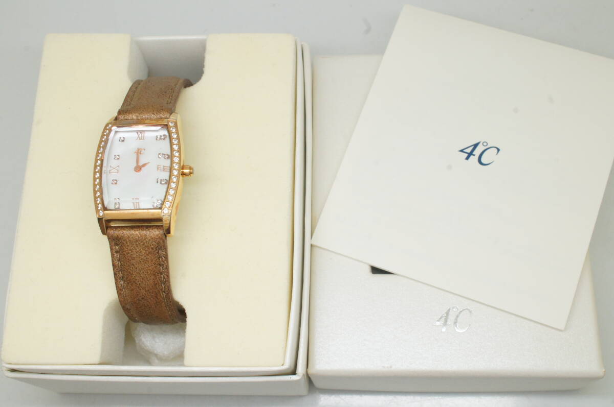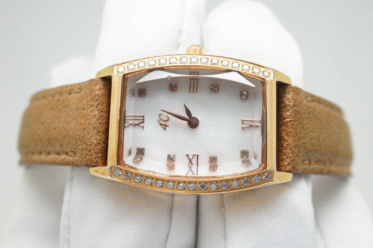 E130●作動良好 箱付 4℃ ヨンドシー ラインストーン シェル文字盤 トノー型 レディース腕時計 ゴールド金 お洒落 クォーツ