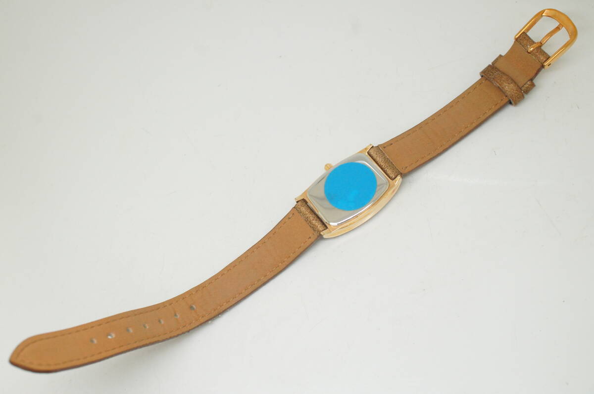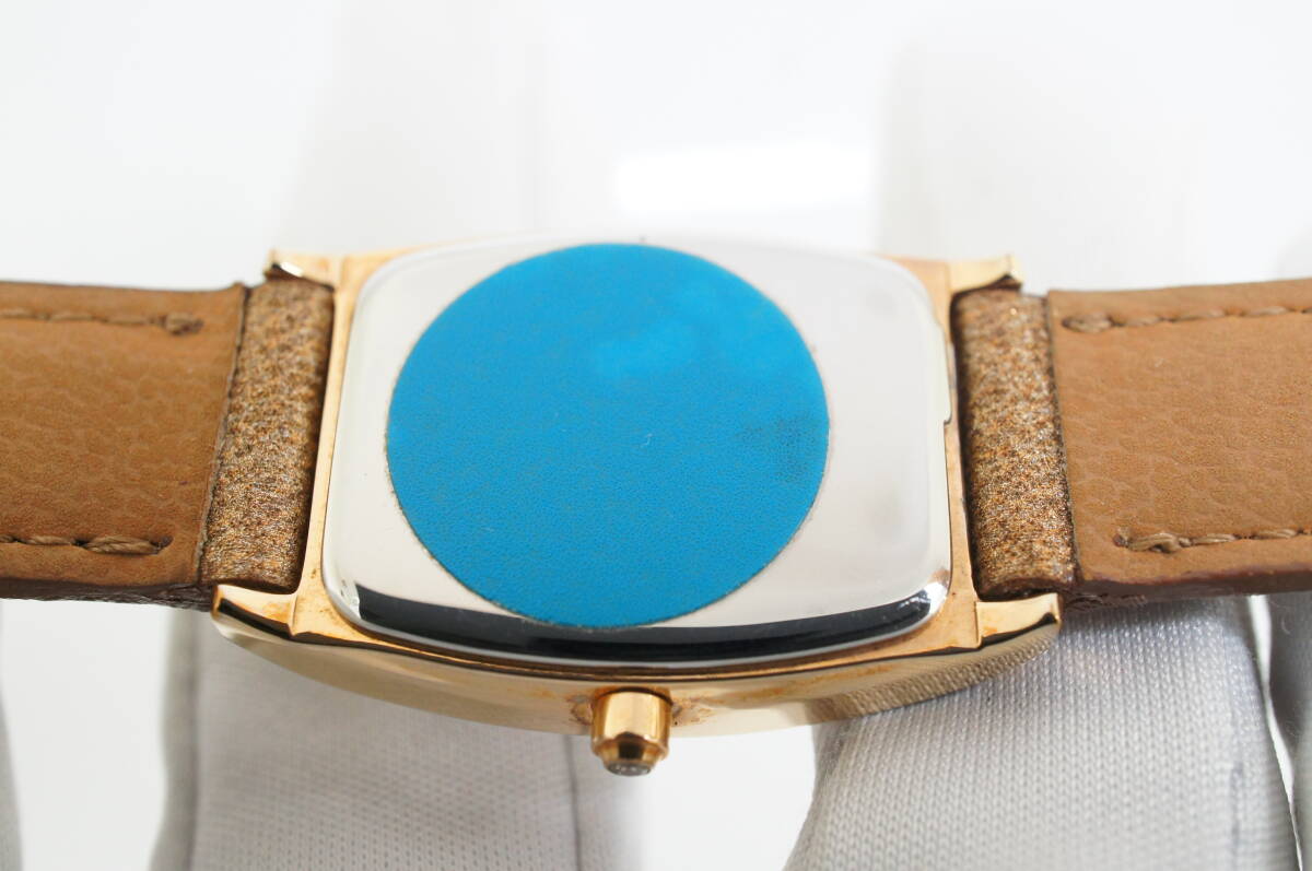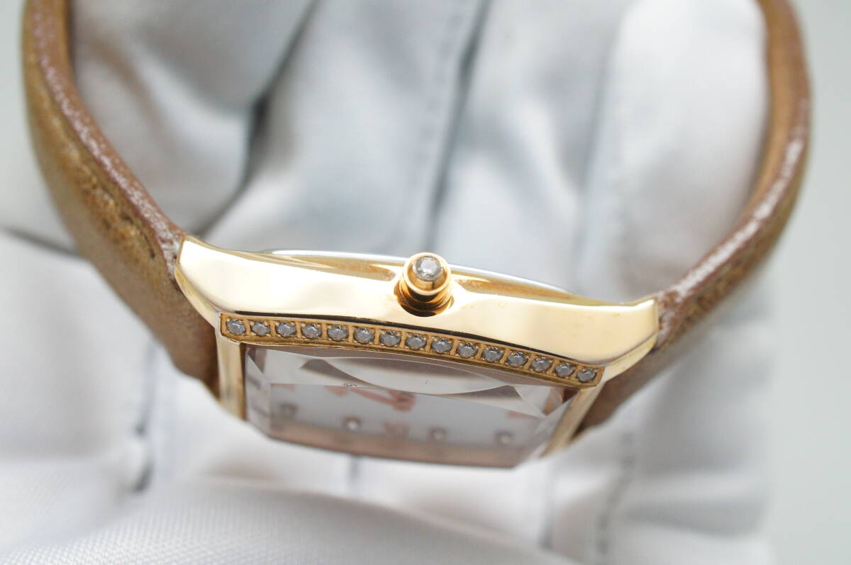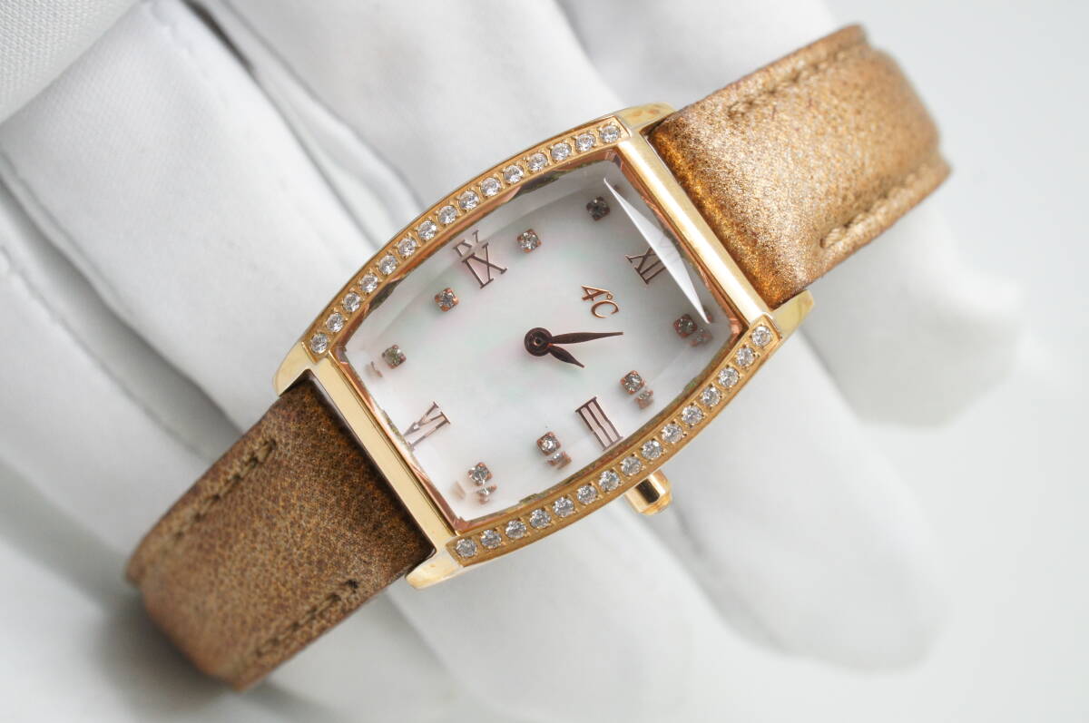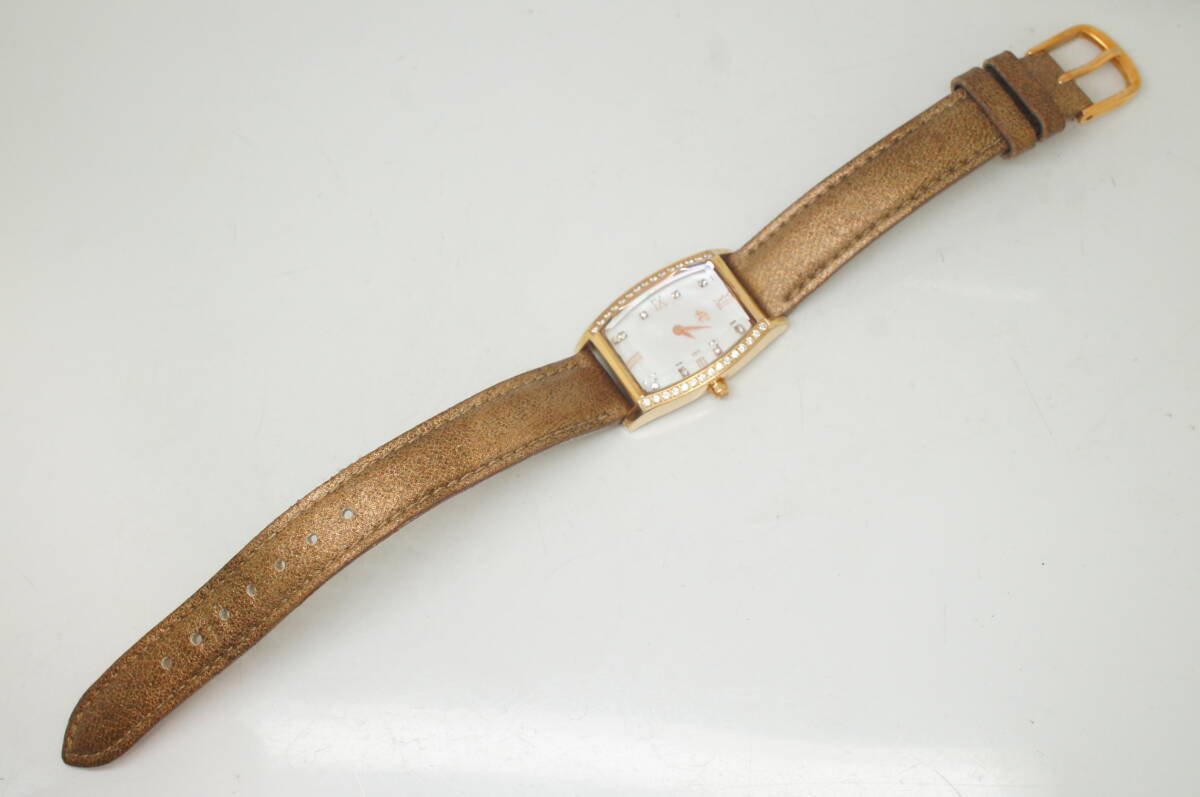 E130●作動良好 箱付 4℃ ヨンドシー ラインストーン シェル文字盤 トノー型 レディース腕時計 ゴールド金 お洒落 クォーツ