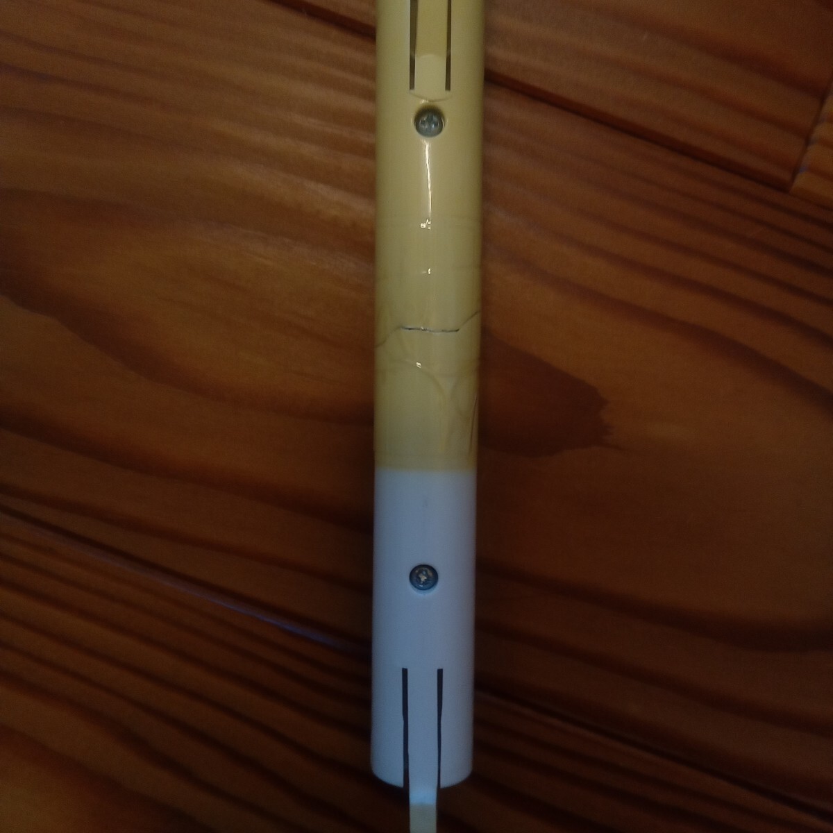 画像にもありますが、背当て兼押し手の片方が割れていてテープで補修してあります(以前の持ち主の方が補修しており当方は使用しておりません。また、箱付きですが説明書及び押し棒用のビスが欠品しております。ハンドル部分のボタンの接触も所によって、良くない所もあります。