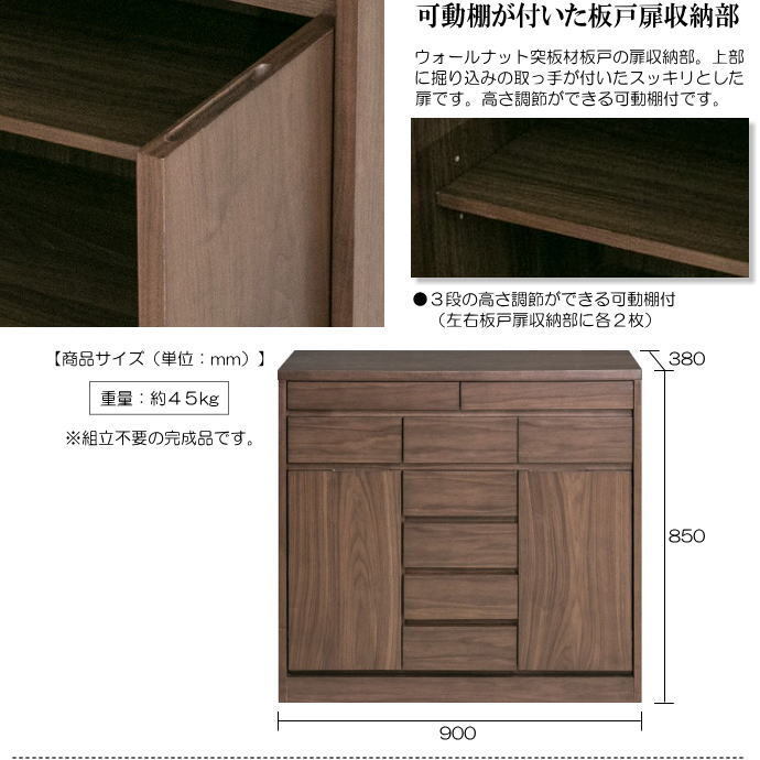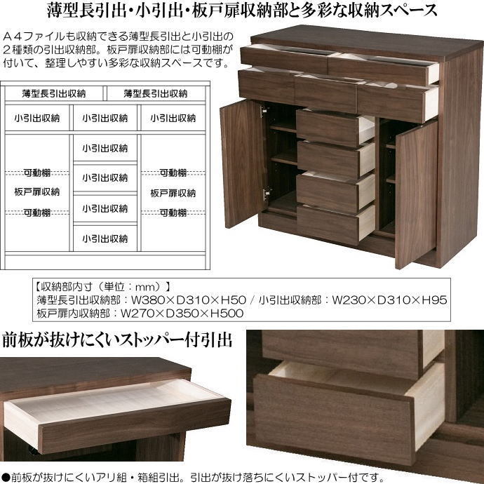 | 【商品特徴】 | ・表面材にウォールナット突板材を使用したナチュラルモダンスタイルのキャビネット。2種9杯の小引出が付いて整理しやすく、ナチュラル感があります。 ・A4ファイルも収納できる薄型長引出と小引出の2種類の引出収納部です。 ・引出は、前板が抜けにくいアリ組・箱組のつくり。引出が抜け落ちにくいストッパー付です。 ・ウォールナット突板材板戸の扉収納部。上部に掘り込みの取っ手が付いたスッキリとした扉です。3段の高さ調節ができる可動棚が、左右の板戸扉収納部に各2枚付いています。 ・背面は共柄のプリント化粧板で仕上げています。 ・組立不要の完成品です。 | |