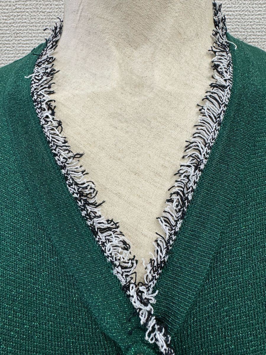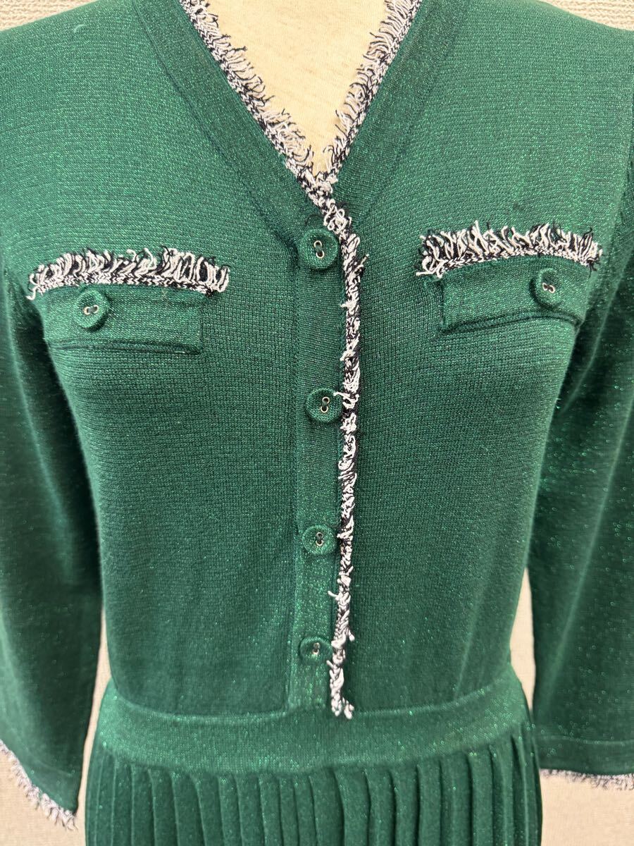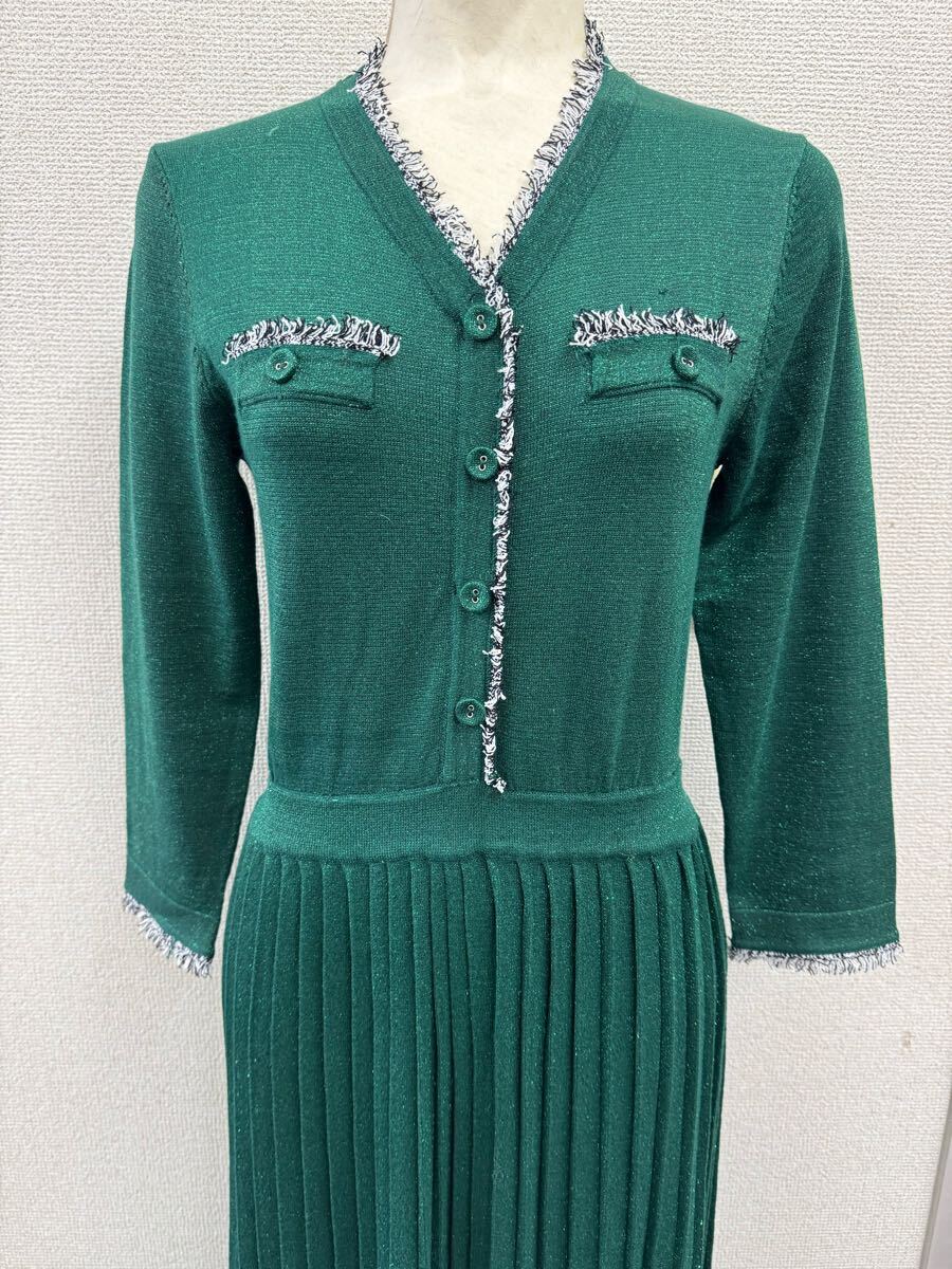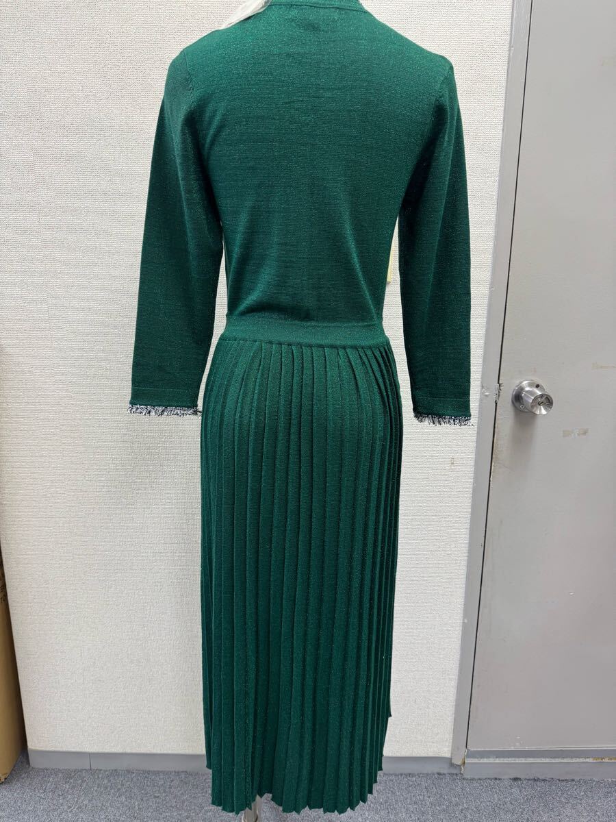 フリル装飾のグリーンニットワンピース、長袖、プリーツスカートデザイン。