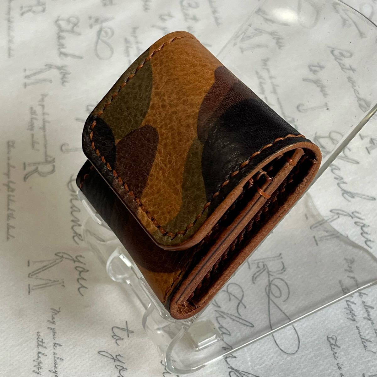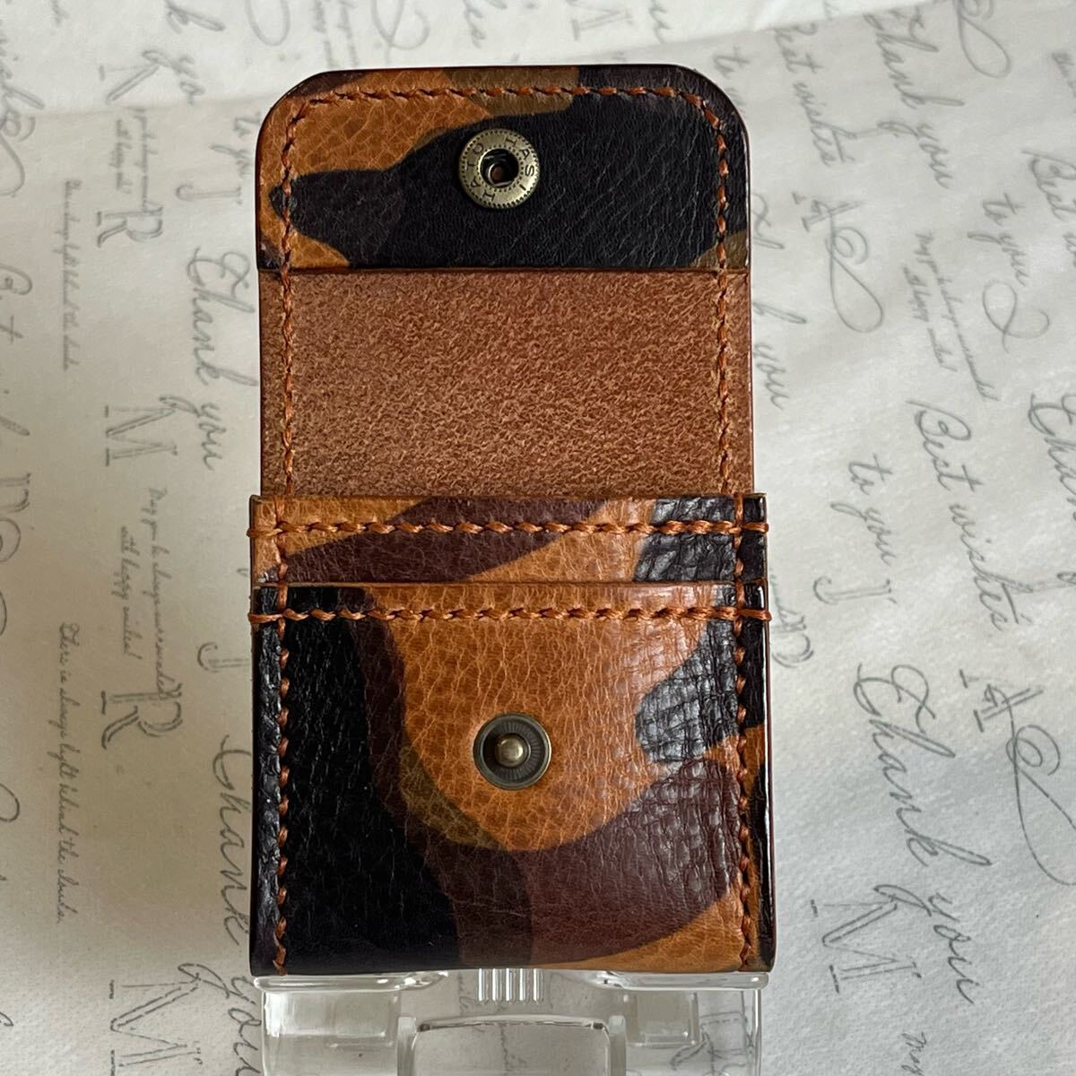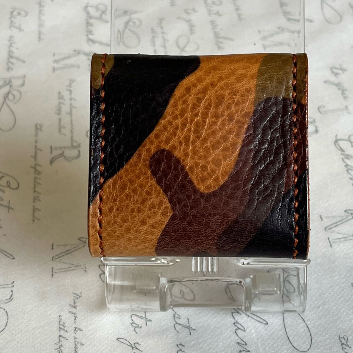 この牛ヌメ革は、芯通し染料仕上げの革をベースに迷彩柄のプリント加工を施しています。オイルを多く含んでおり、しっとりとした肌触りが魅力です。迷彩柄の濃淡、革の色味、シボ感などがイレギュラーなため使い込むと味わい深い艶や独特なエイジングが楽しめます。