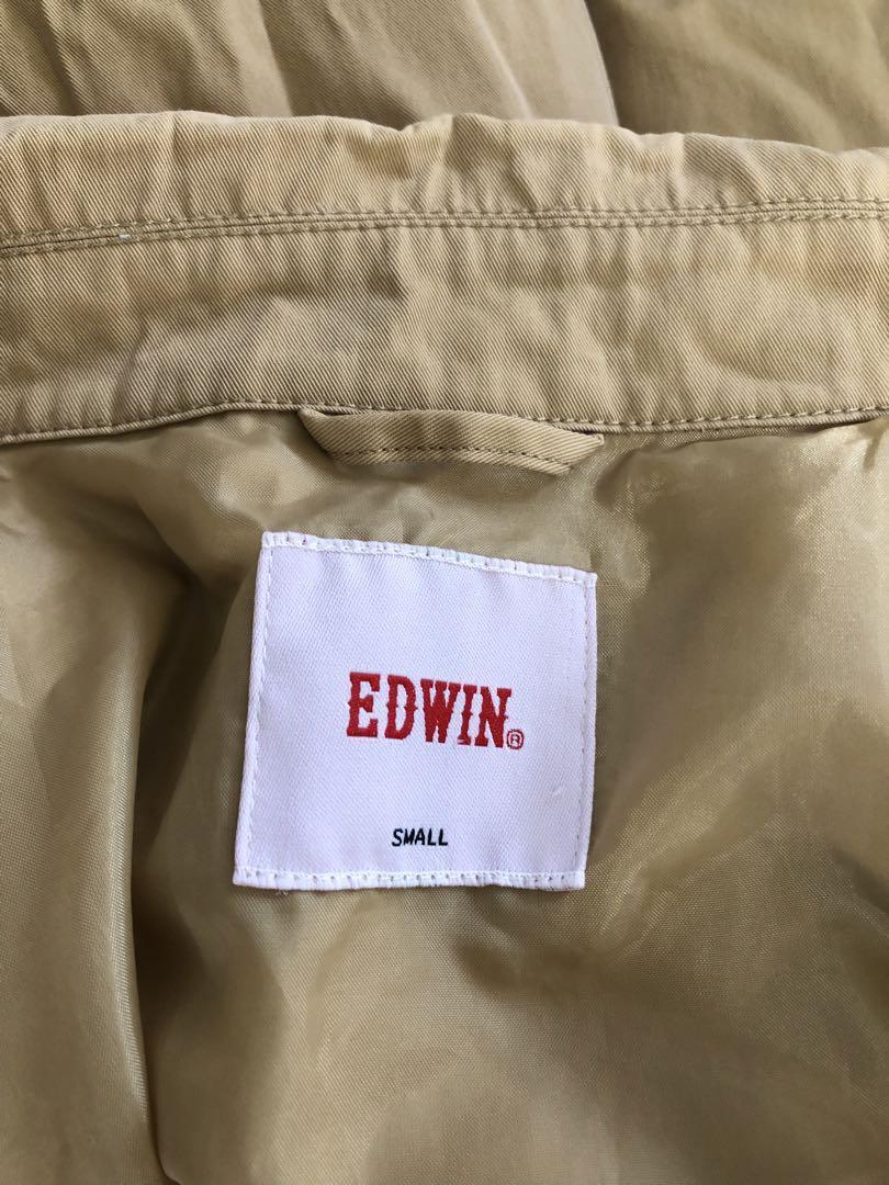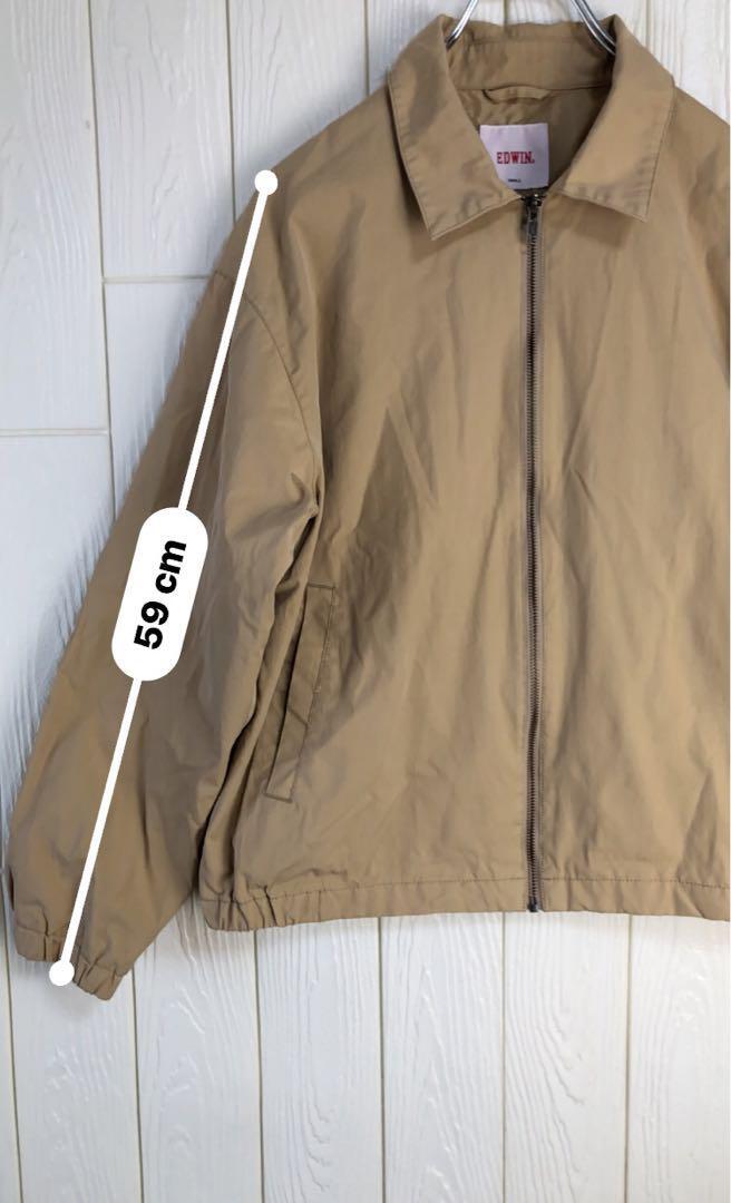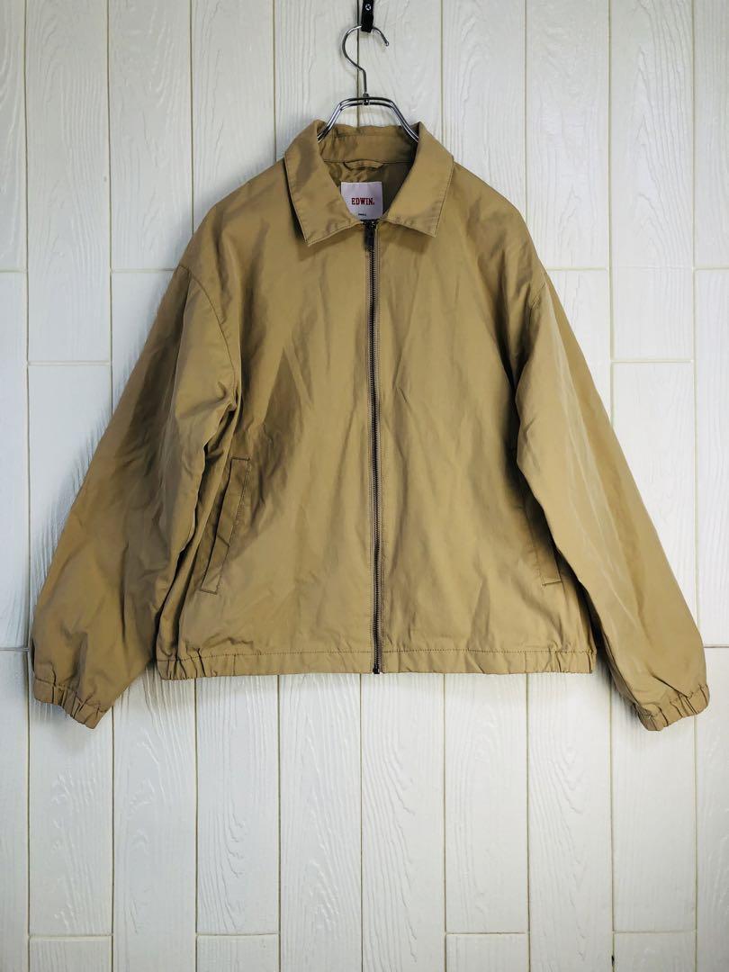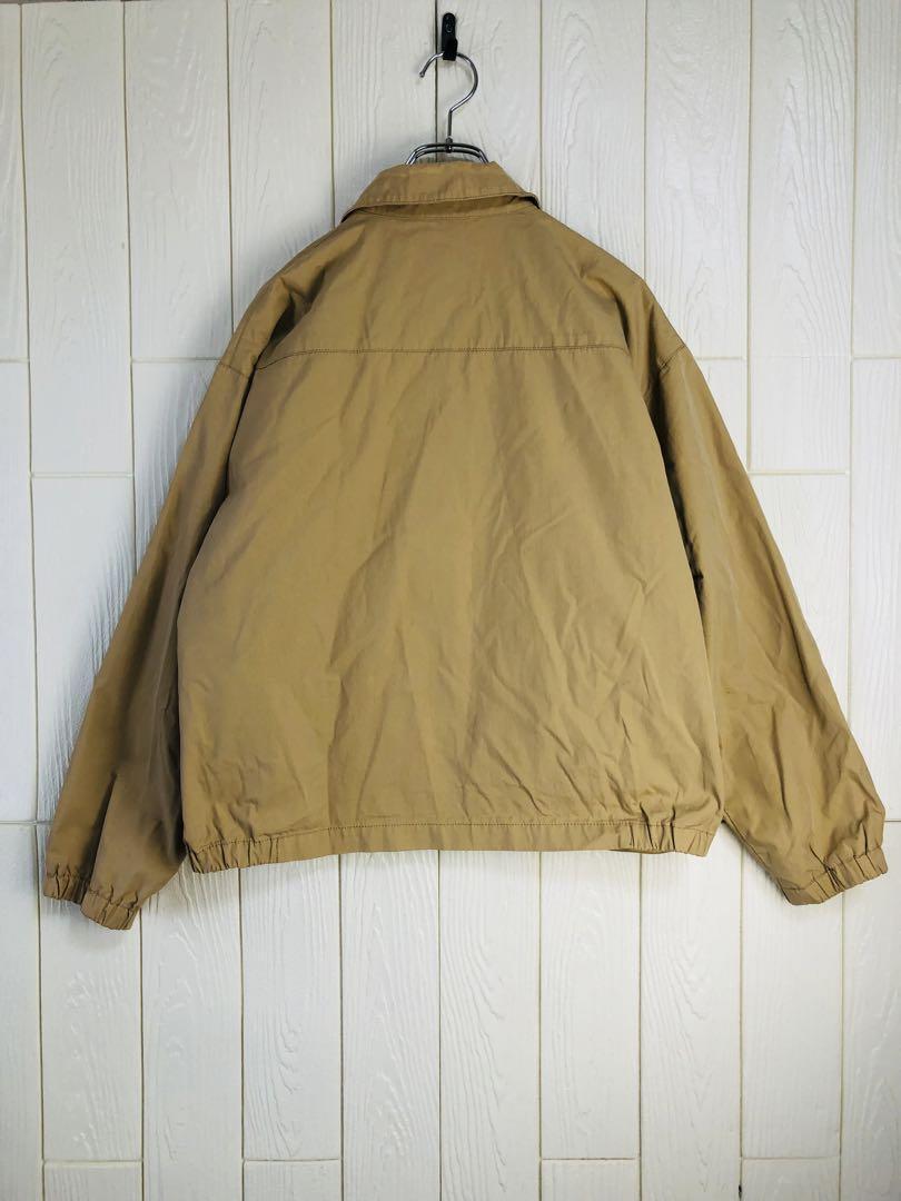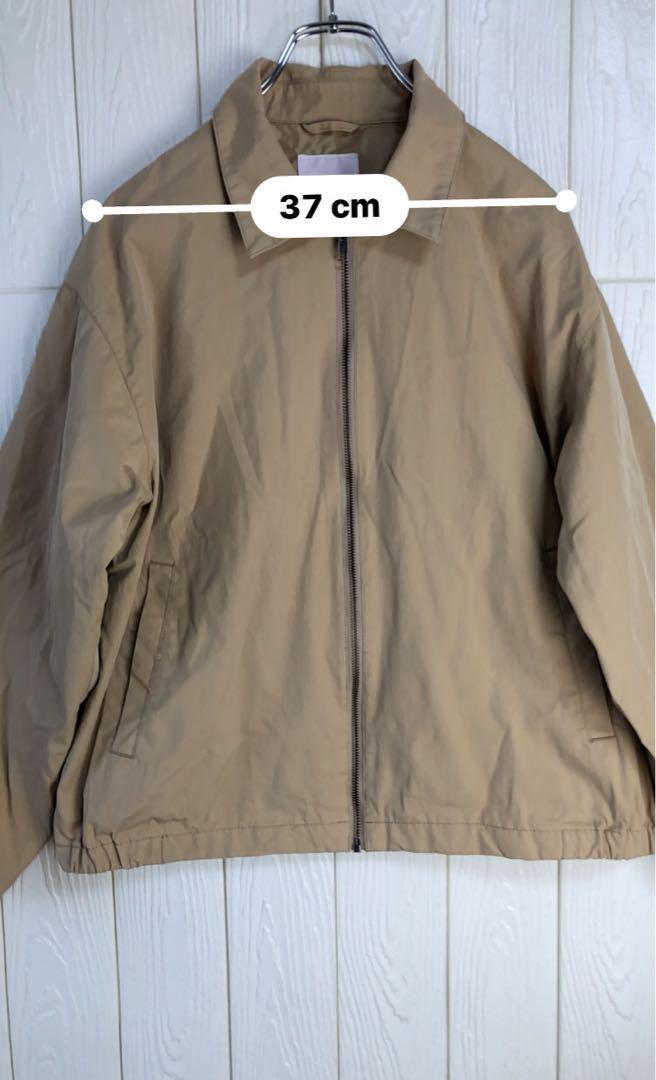 ジッパー式のベージュジャンパー、スタンドカラーと両サイドポケット付き。