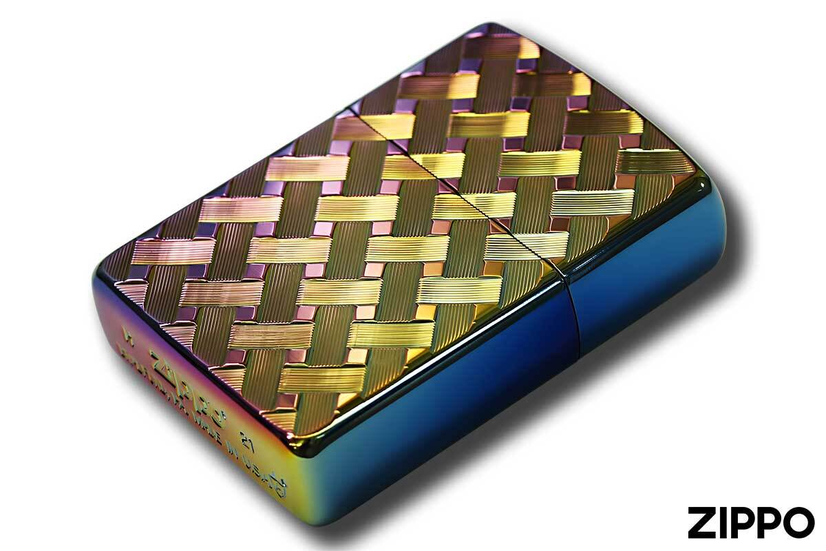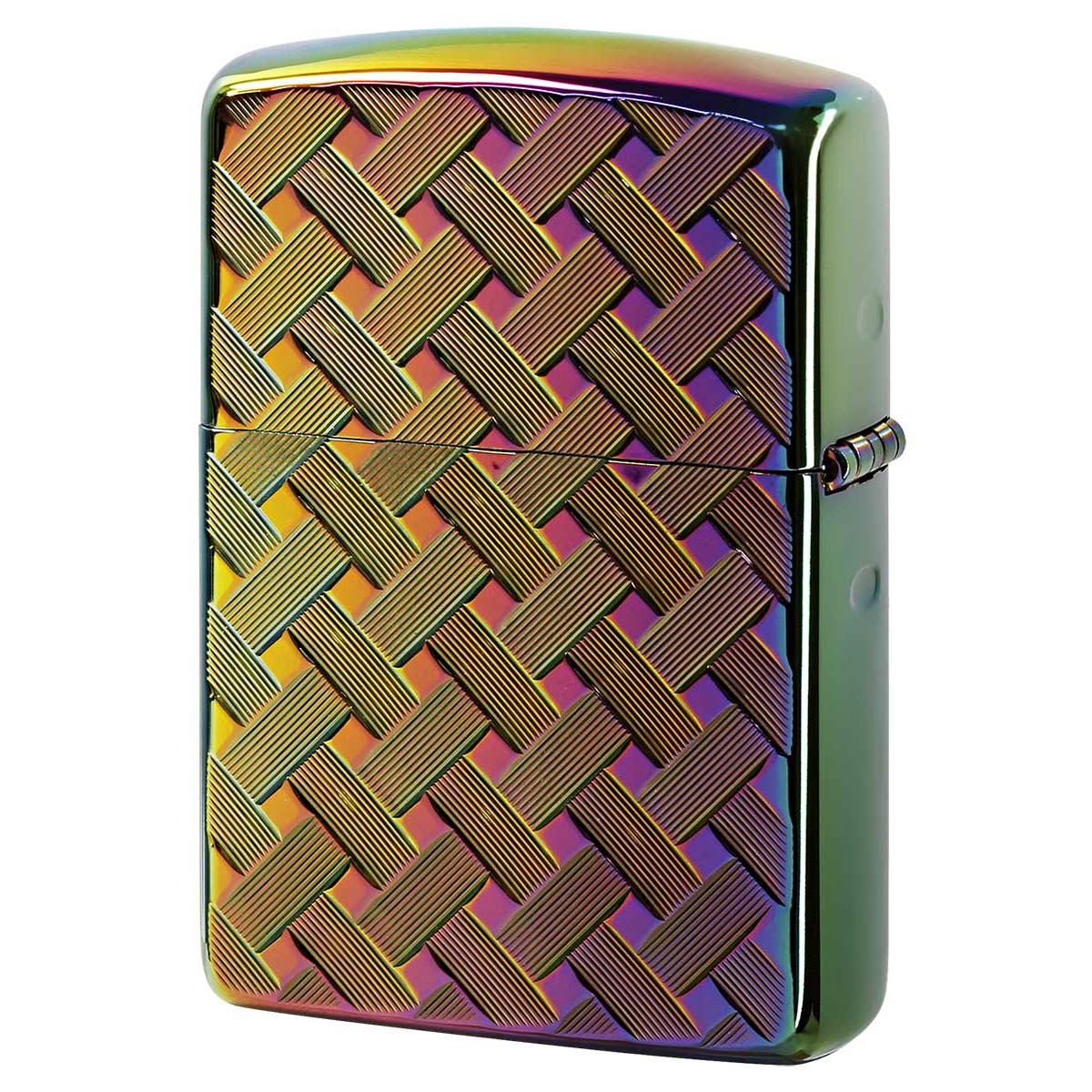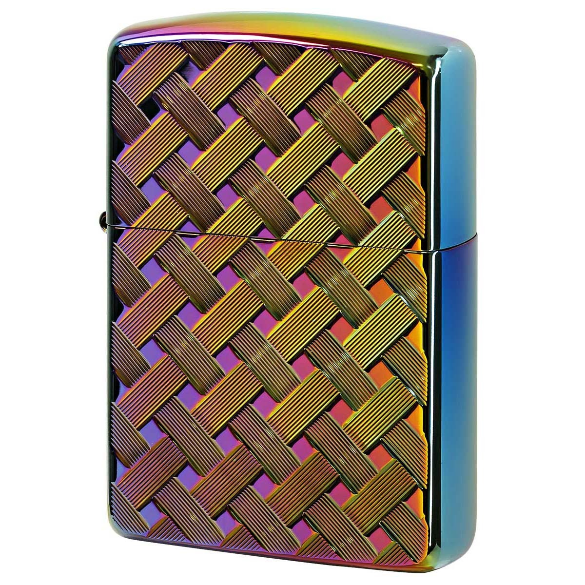 通常の1.5倍の厚みを持つアーマーケースだからこそ許される超深彫加工。どこから見ても煌びやかなデザインで、光の反射を見て楽しめるZippoです。さらに、贅沢な両面加工!編み目上に彫刻されたデザインは、実際に編み込まれたように見え立体感がGood!!男女ともにお勧めです。レインボーの色味は、表面の仕上がりに個体差がございます。予めご了承下さい。