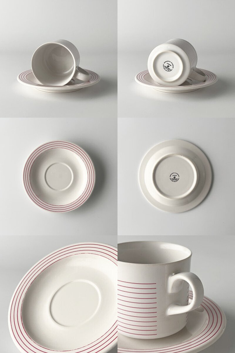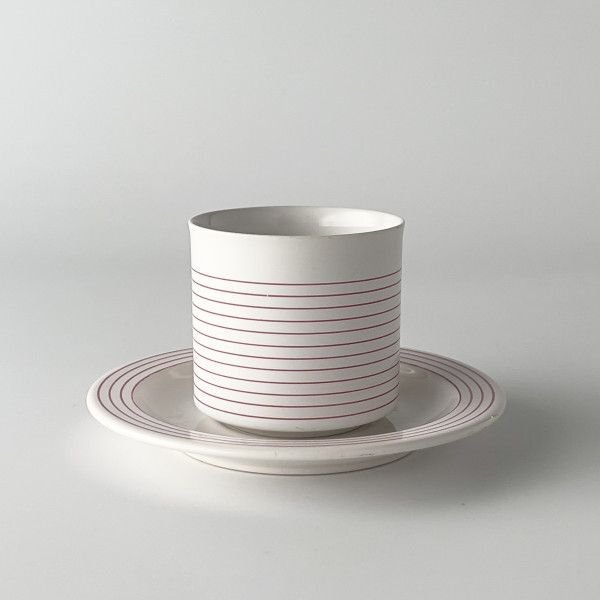 シンプルな直線パターンが施されており、当時流行していた「ミニマル&モダン」なスタイルを反映してます。ベースはマットな白磁器に、グレー系の直線模様(細い横線や格子柄のバリエーション)が描かれています。主張しすぎない美しさ」があり、現代の北欧風・ナチュラルインテリアにもよく合います。
