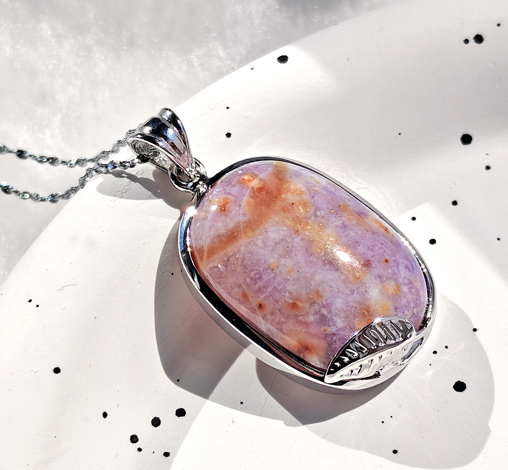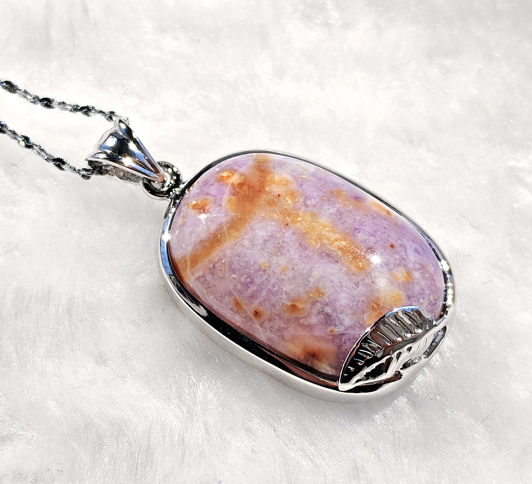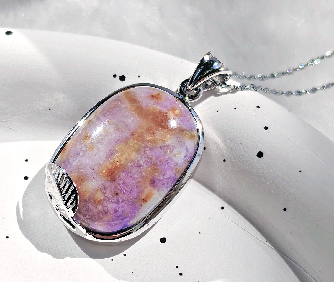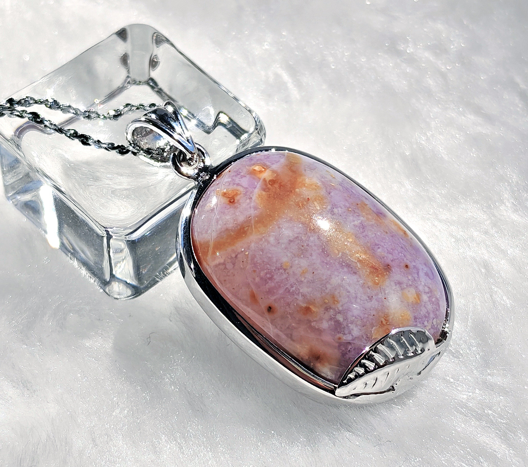 ○簡単説明:ティファニーストーンは、アメリカ・ユタ州のトーマス山脈周辺で のみ産出される希少な石です。白いカルセドニやオパール紫のフローライトピンクのロードナイトなどが様々な鉱物が混ざりあった混合石です。