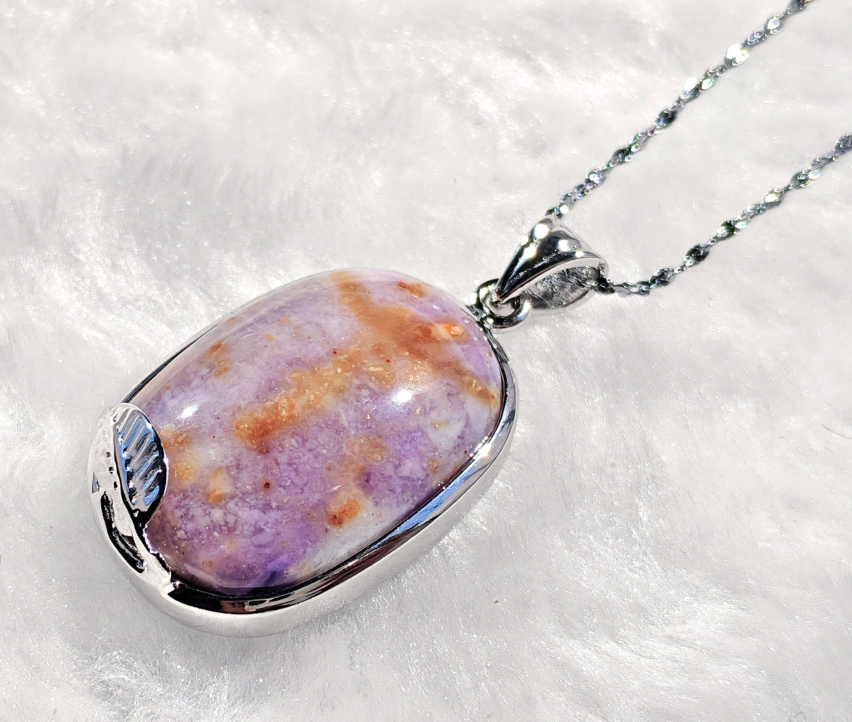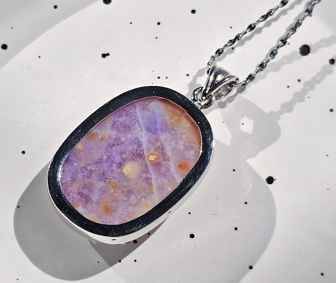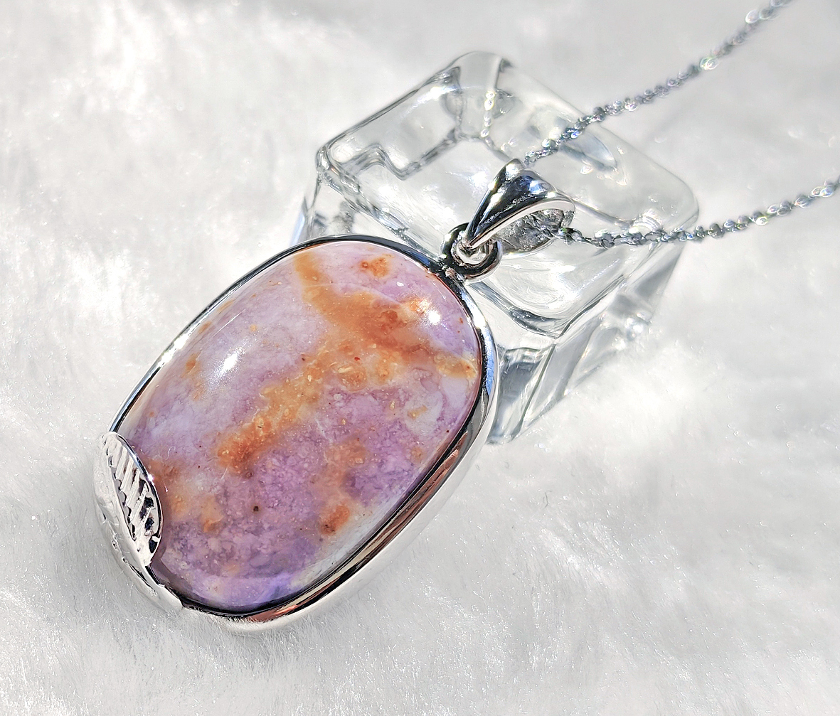○簡単説明:ティファニーストーンは、アメリカ・ユタ州のトーマス山脈周辺で のみ産出される希少な石です。白いカルセドニやオパール紫のフローライトピンクのロードナイトなどが様々な鉱物が混ざりあった混合石です。