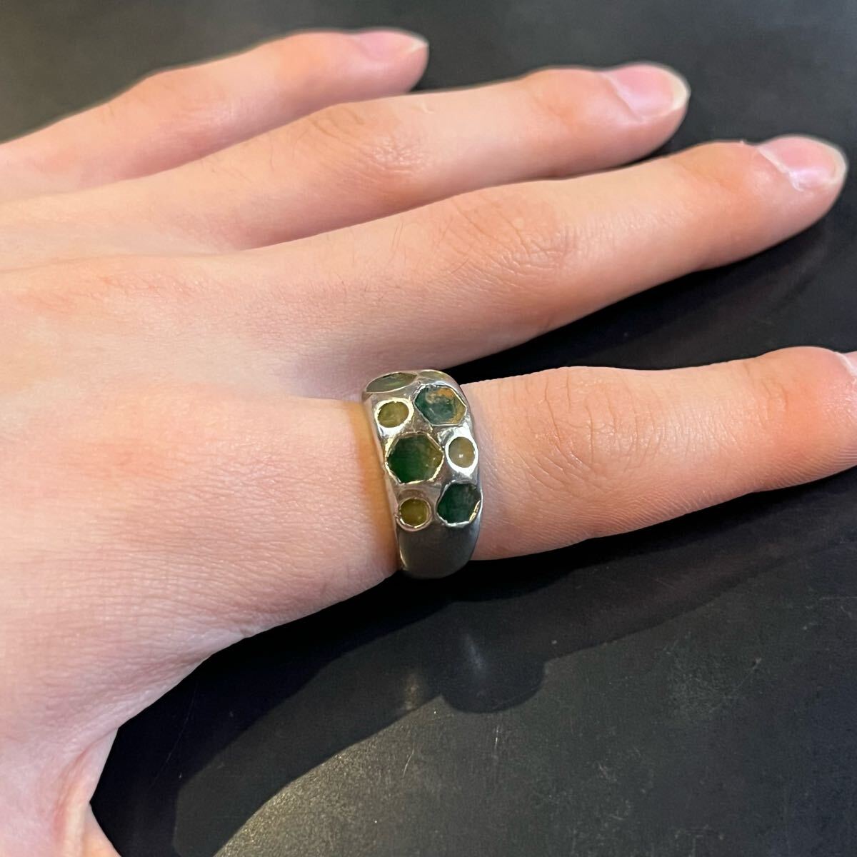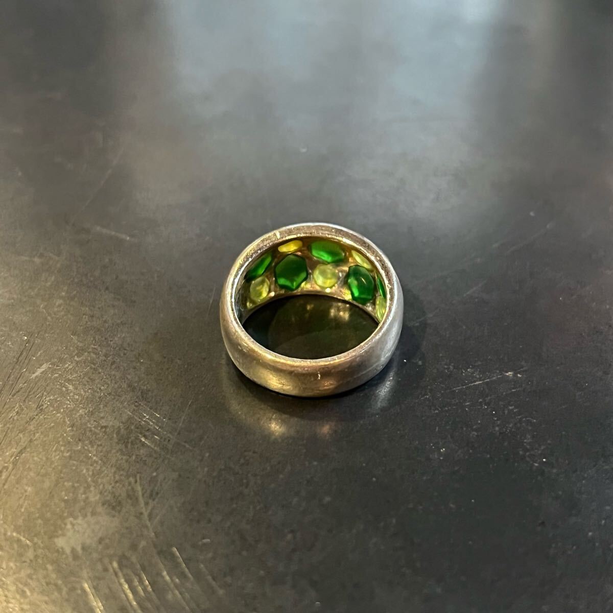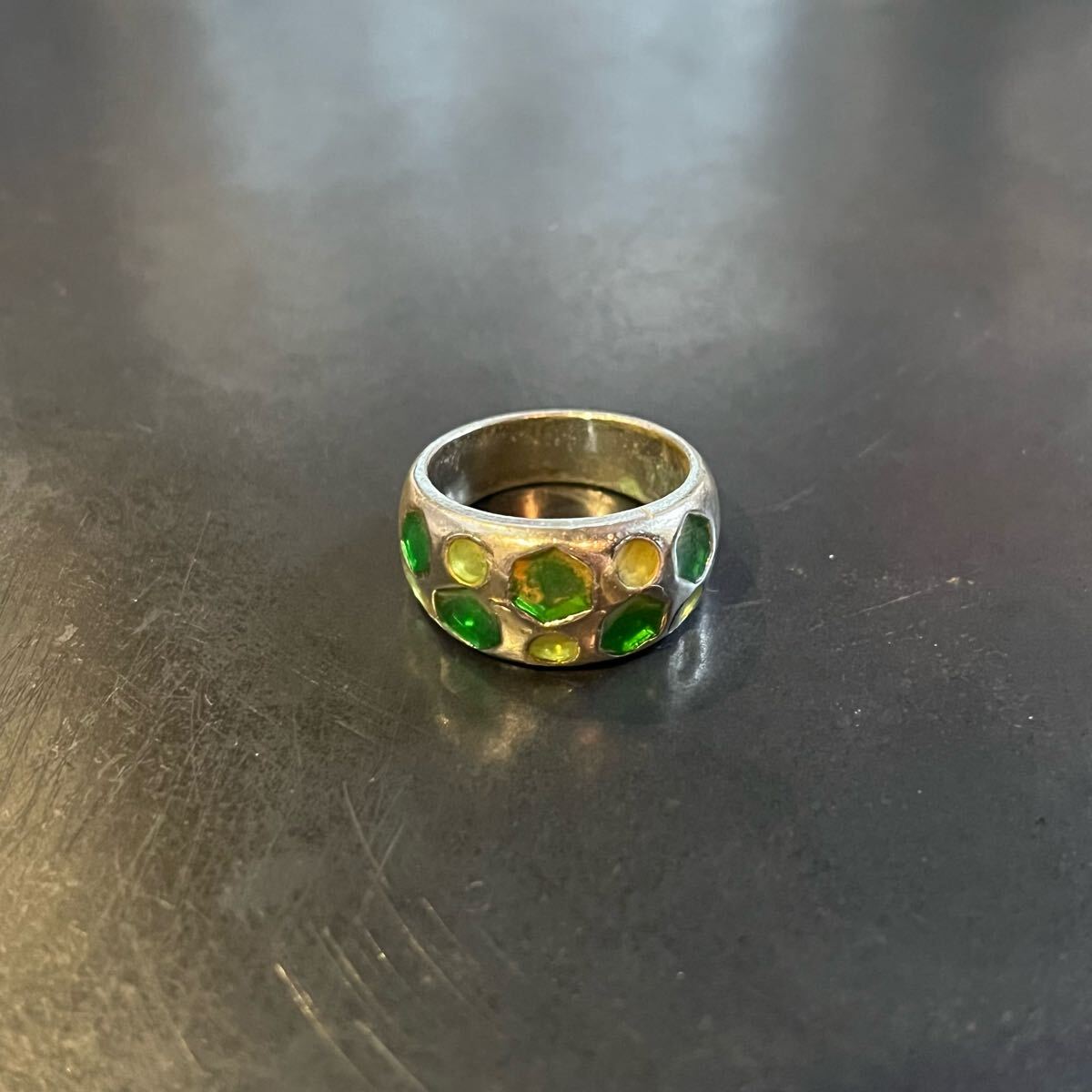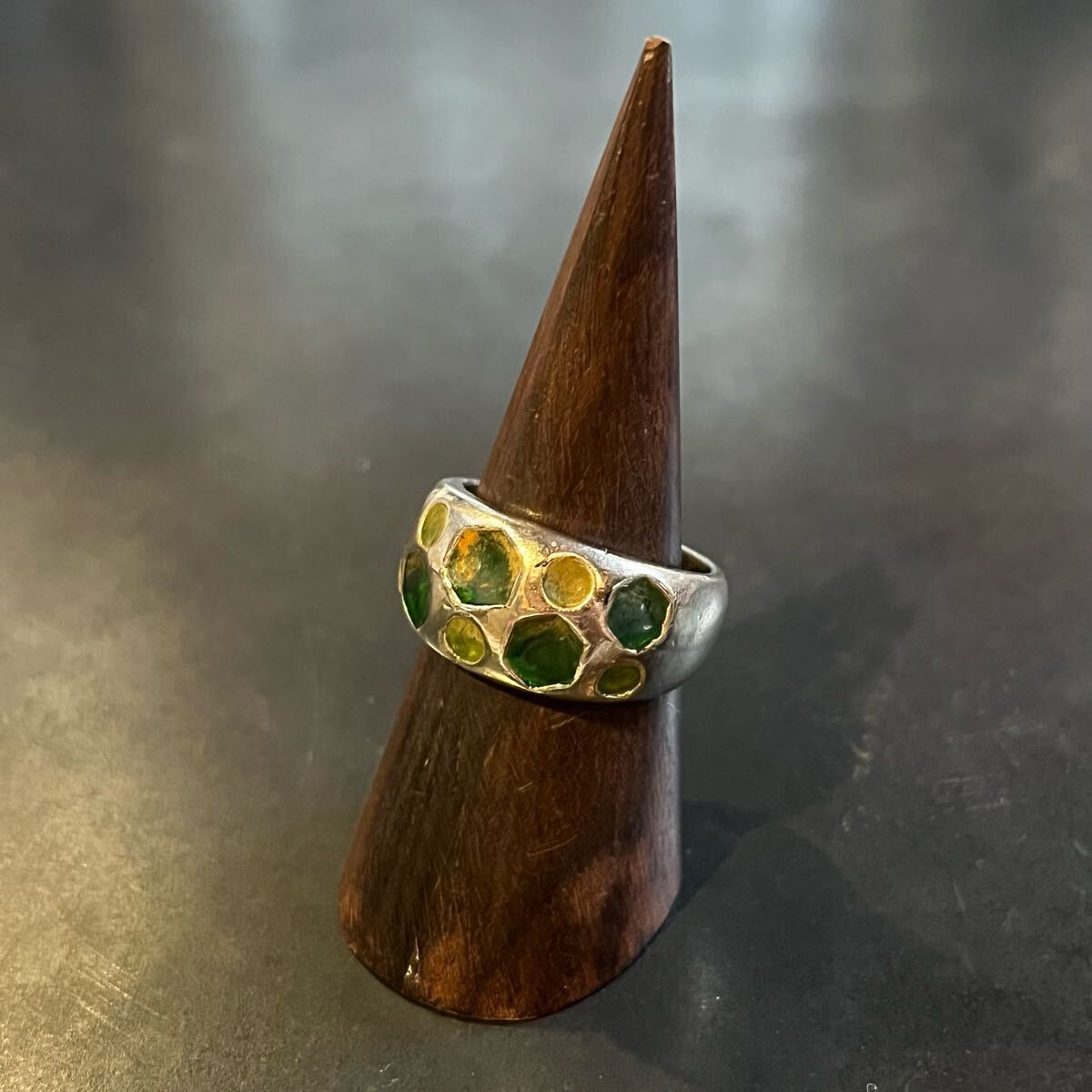 海外で買い付けたグリーンアンドイエロールーズリーデザインのシルバーリングです。