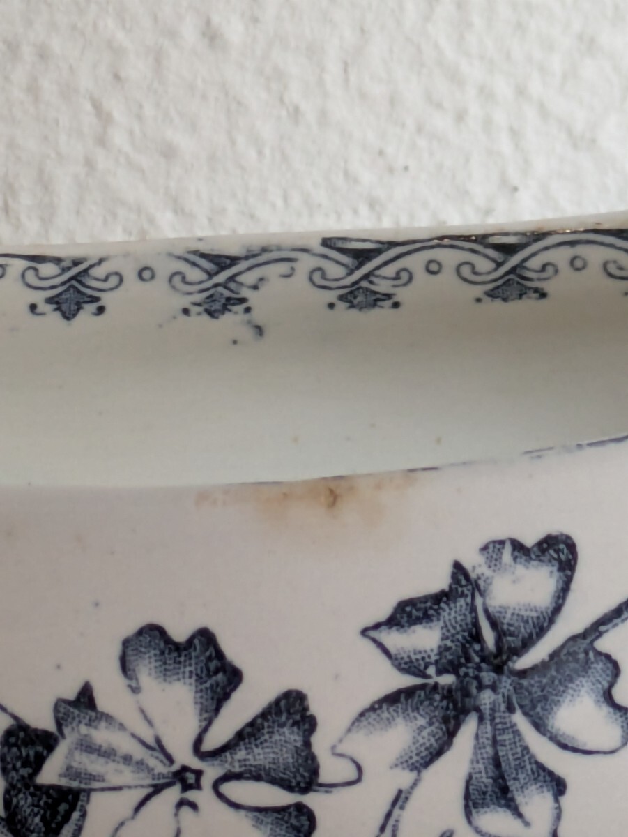 縁部分、汚れや傷が染みになっている箇所がございますので画像にてご確認ください。ほか、経年によるペイントのスレや釉薬の貫入はございますが特筆するダメージや使用感はみられず、アンティークとしては比較的よいコンディションかと思われます‥ご購入に際しましてはあくまでも中古品とご理解いただき少しでも気になる方は入札をお控えください。