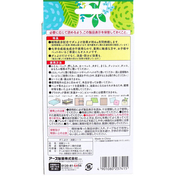 植物生まれの守るチカラでやさしく手軽にダニよけ♪ 植物生まれの守るチカラ(天然精油配合) 広い場所にも敷きやすいサイズ! 切っても使える! ・植物成分配合でダニよけ効果が約6ヵ月間持続します。 ※使用環境により効果・持続は異なります。 屋内塵性ダニ類の忌避効果を確認しています。 ・化学合成殺虫成分不使用なので、薬剤に敏感な方や、お子様やペットのいるご家庭にもオススメです。 ・ダニよけだけでなく、消臭・防カビ効果も。 ※製品と接した対象物の防カビ効果を確認しています。 ・無香性。 個装サイズ:100X195X80mm 個装重量:約110g 内容量:2枚入(90cmX90cm) 製造国:中国 【発売元:アース製薬株式会社】 【品名】 消臭シート 【用途】 屋内塵性ダニ類の忌避 【成分】 ダニよけ成分(天然精油、カルボン酸エステル)、消臭成分(緑茶エキス)、防カビ成分 【使用方法】 ・ふとん、ベッド、押入れ、カーペット、タタミ、まくら、クッション、タンス、おもちゃ箱等の下に敷いてください。 ・ふとん、ベッドに敷く場合はシーツやベッドパットの下に敷いてください。 肌に直接ふれないようにご使用ください。 (寝具を干すときや、洗濯するときは取り外してください。) ・シートに表・裏はありません。 ・使用場所の広さに合わせて、本品を切ってお使いください。 ・べニヤ等の上にシートを直接敷くと、油染みになるおそれがあるため、緩衝材等を敷いた上から使用してください。 ・プラスチック素材(衣装ケース)、ビニール床には使用できません。 【使用上の注意】 ・使用前に必ず製品表示を読み、十分理解した上で使用してください。 ・用途以外に使用しないでください。 ・定められた使用方法を守ってください。 ・本品はダニの駆除を目的にしたものではありません。 ・本品が皮膚についたときは、石けんを用いてよく洗ってください。 ・アレルギー症状やかぶれなどを起こしやすい体質の人は、使用に注意してください。 ・万一、体に異常が起きた場合は、医師に相談してください。 【保管および取り扱い上の注意】 ・開封後残った製品は袋に入れ、テープなどで封をしてください。 ・直射日光や火気を避け、子供の手の届かない涼しい所に保管してください。 注意事項 予告なく成分・パッケージが変更になることがございます。 予めご了承ください。 *予告なく成分・パッケージが変更になることがございます。予めご了承ください *ダンボールを使用して発送する場合には、入数以下の個数の場合、 中古ダンボールを使用する場合があり、ご注文の商品とは異なるダンボールになる場合があります。 あらかじめ、ご了承ください。 |