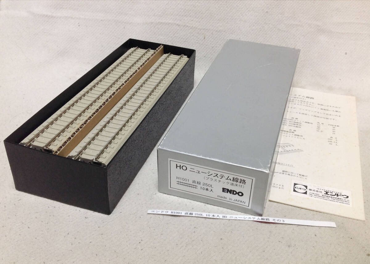 『エンドウ H1001 直線250L 10本入 ニューシステム線路 その3 道床に変色有り 走行確認 レールジョイナー&フィーダーコード取付金具外れ無し』です。出品商品は画像1の物が全てです。箱内部の線路仕切り(発砲スチロール製)が無いので、代わりに段ボール紙を入れて有ります(画像1参照)。走行動作確認はMPギア駆動20m車での走行確認です。状態は現状優先でお願い致します。写真は暗部が判るように多少明るめにしてあります。不明点は御質問をお願い致します。商品重量約507g