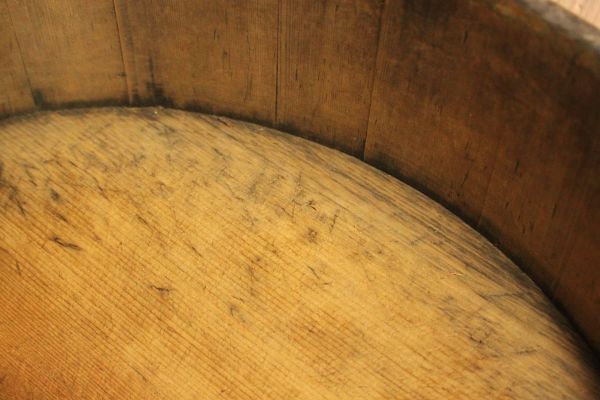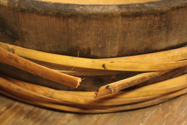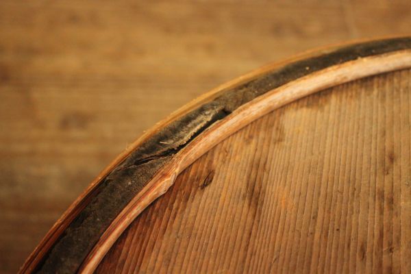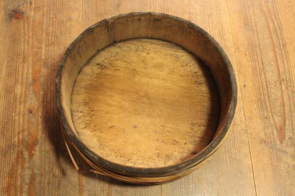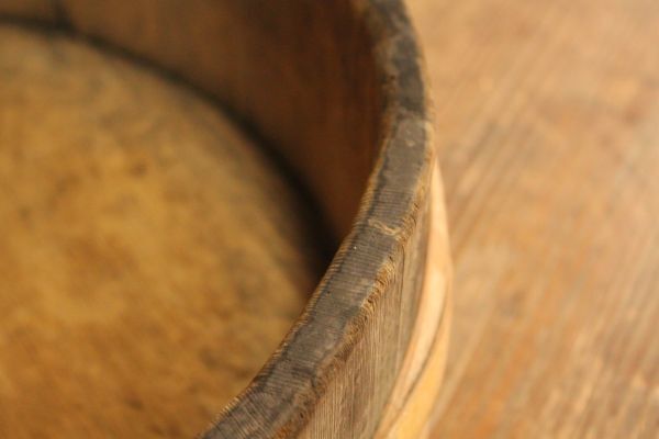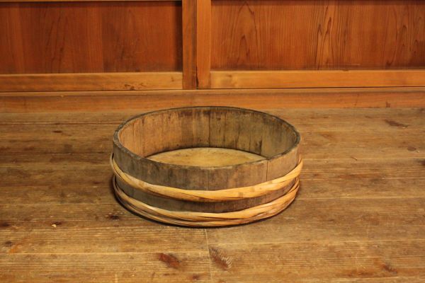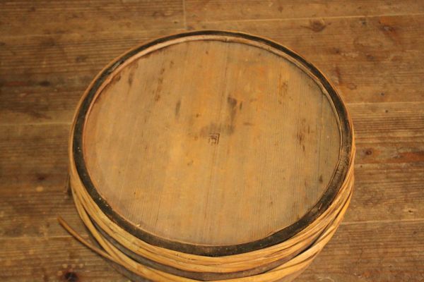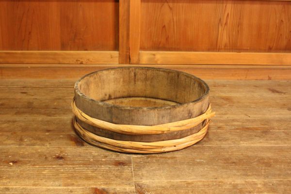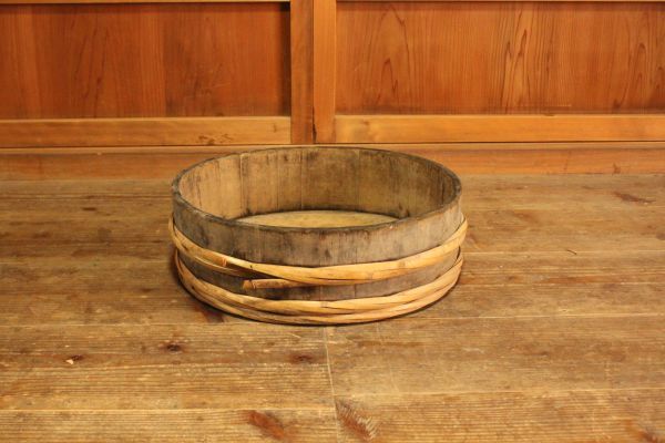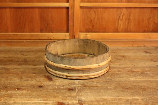 ※桶、たらいなどの木製の水回り用品について 落札いただいた後、「水を入れたら漏れた。」と問い合わせをされる方がおられますが、古い木製の商品が何の手入れもされず、乾燥状態で長期間保管されていたので、そのまま使用すれば当然のことながら水漏れいたします。 水漏れを防ぐためには、まず商品がすべてつかるくらいの水に浸け、半日から一日程度放置します。このとき、手で隙間がなくなるように整えながら浸け、浮き上がらないように重しを載せておくのがコツです。 その後引き上げ、水を張ってみて漏れなければ、以降乾燥を防ぎつつ使用してください。 水が漏れるようでしたら、よく乾燥させ、再度手で整えて隙間をなくし、また水に浸けてみます。 それでも古い商品なので、完全に水漏れしないものはないとお考えいただき、ご納得の上入札されますようお願いいたします。 格安スタート、売り切りにて出品いたします。 ◎状態:隙間、スレ、シミ、汚れ等あります。長期保管されていた古い商品です。その他、写真でご確認ください。 ◎大きさ(約.センチ):径49.0 高14.5 |