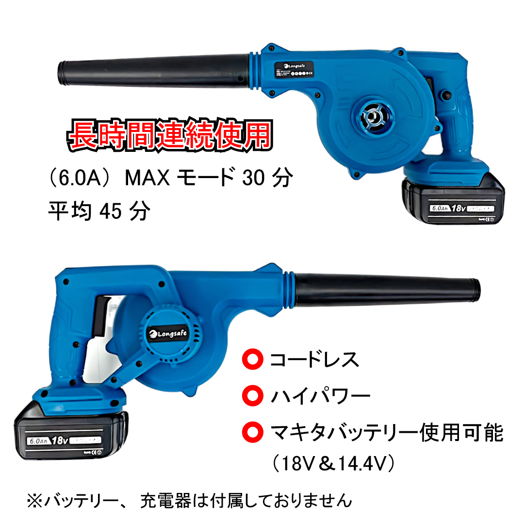 バッテリーを電源として使用する強力送風機です。屋外での落ち葉・芝などの吹き飛ばし、ホコリ・チリなどのゴミの吸塵、水切り等に使用可能です。