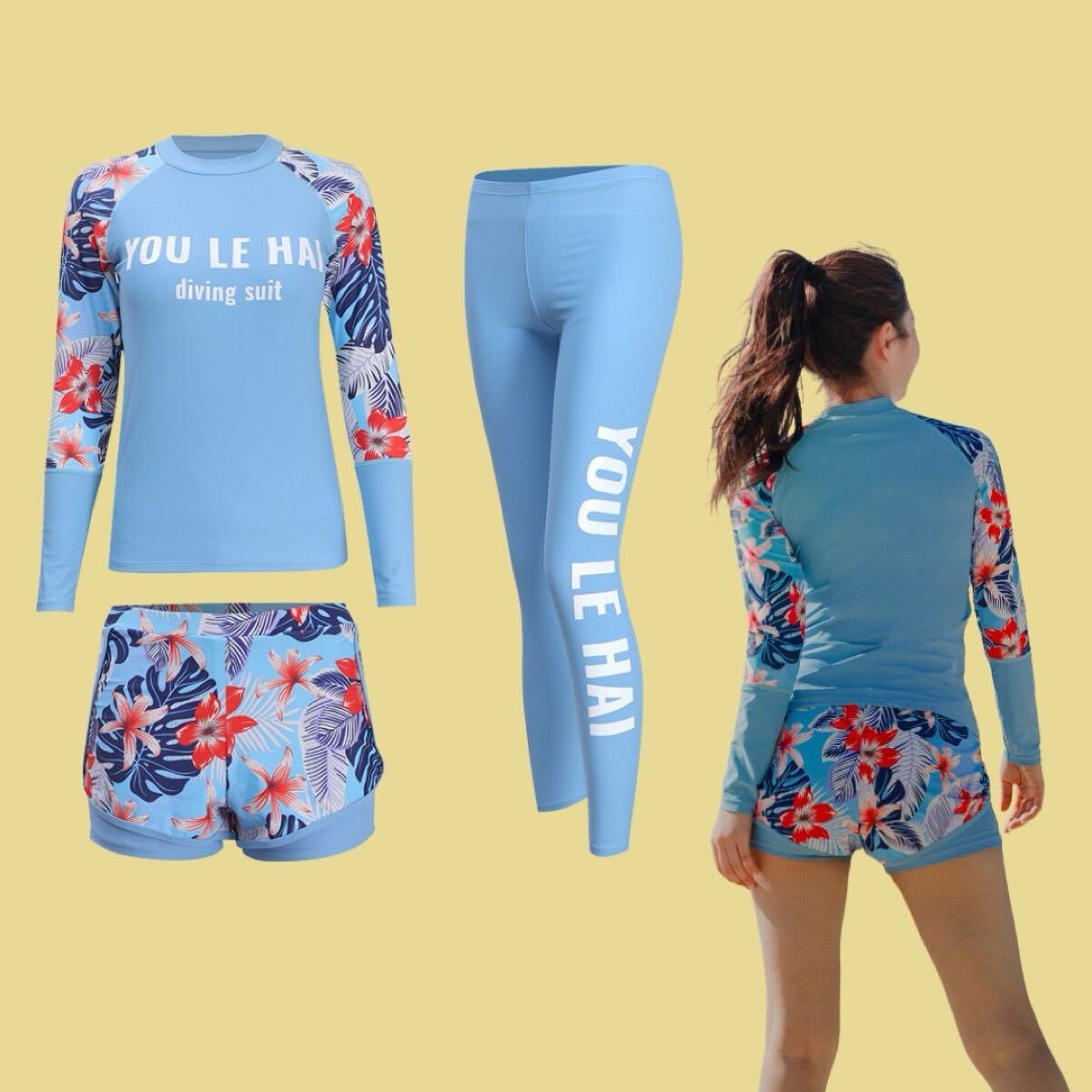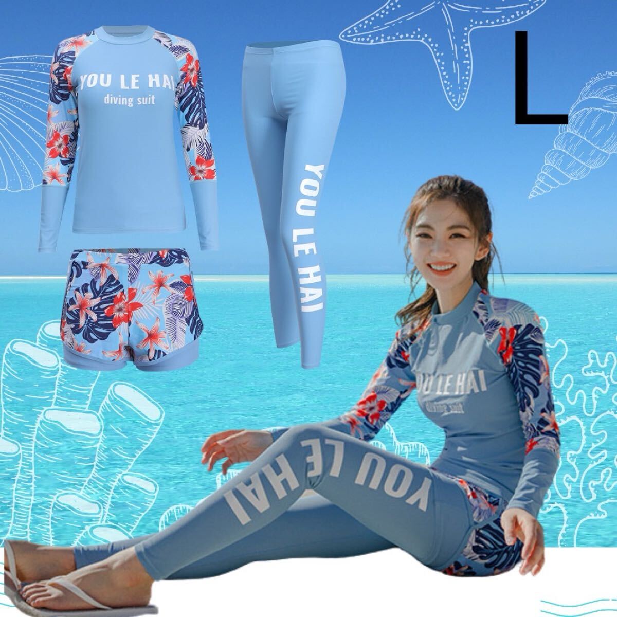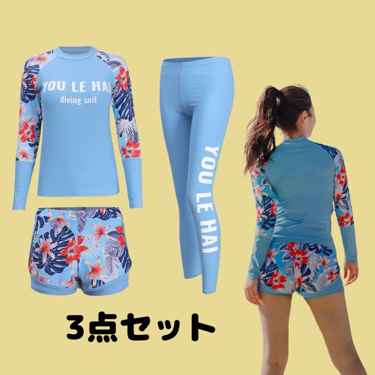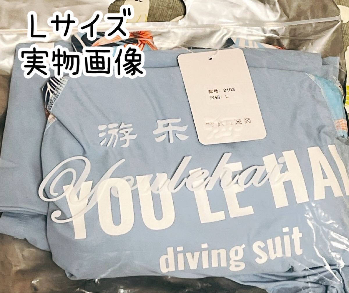 トロピカル 花柄 水着 ラッシュガード ダイビングスーツ マリンスポーツ サーフィン 3点セット スカイブルー ブルー 青 水色 Lサイズ L