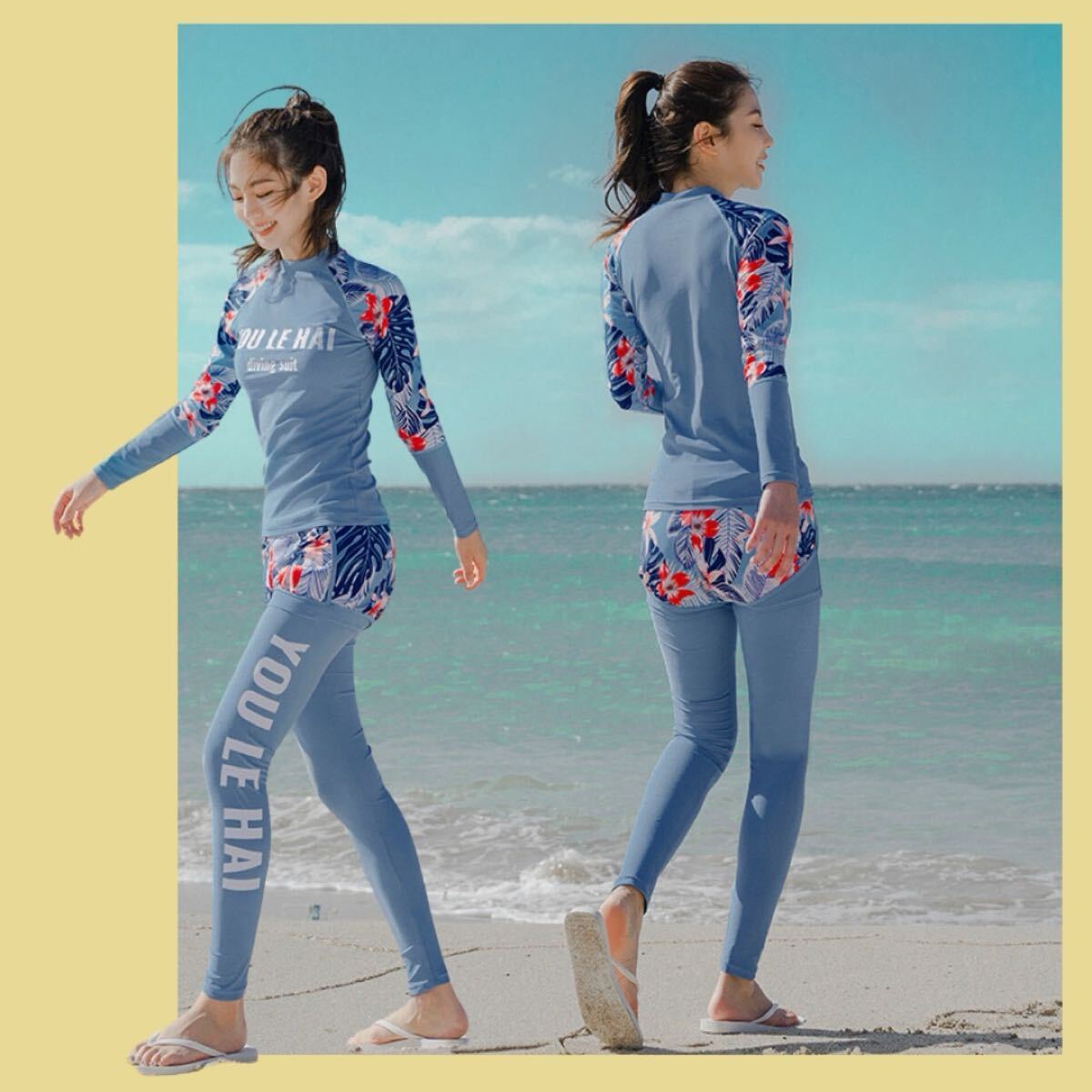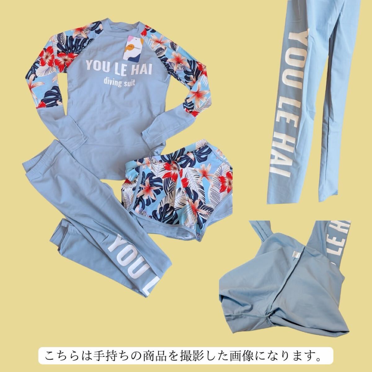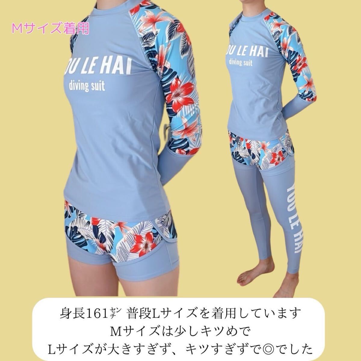 トロピカル 花柄 水着 ラッシュガード ダイビングスーツ マリンスポーツ サーフィン 3点セット スカイブルー ブルー 青 水色 Lサイズ L