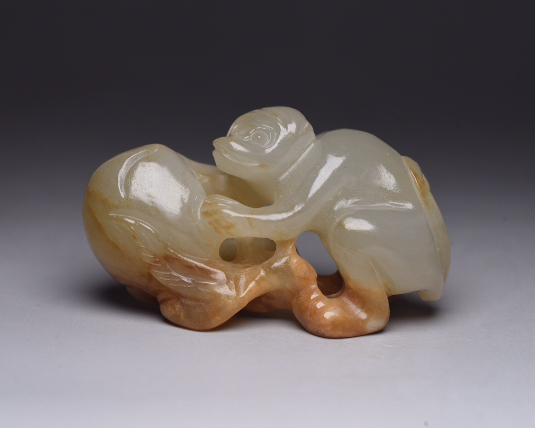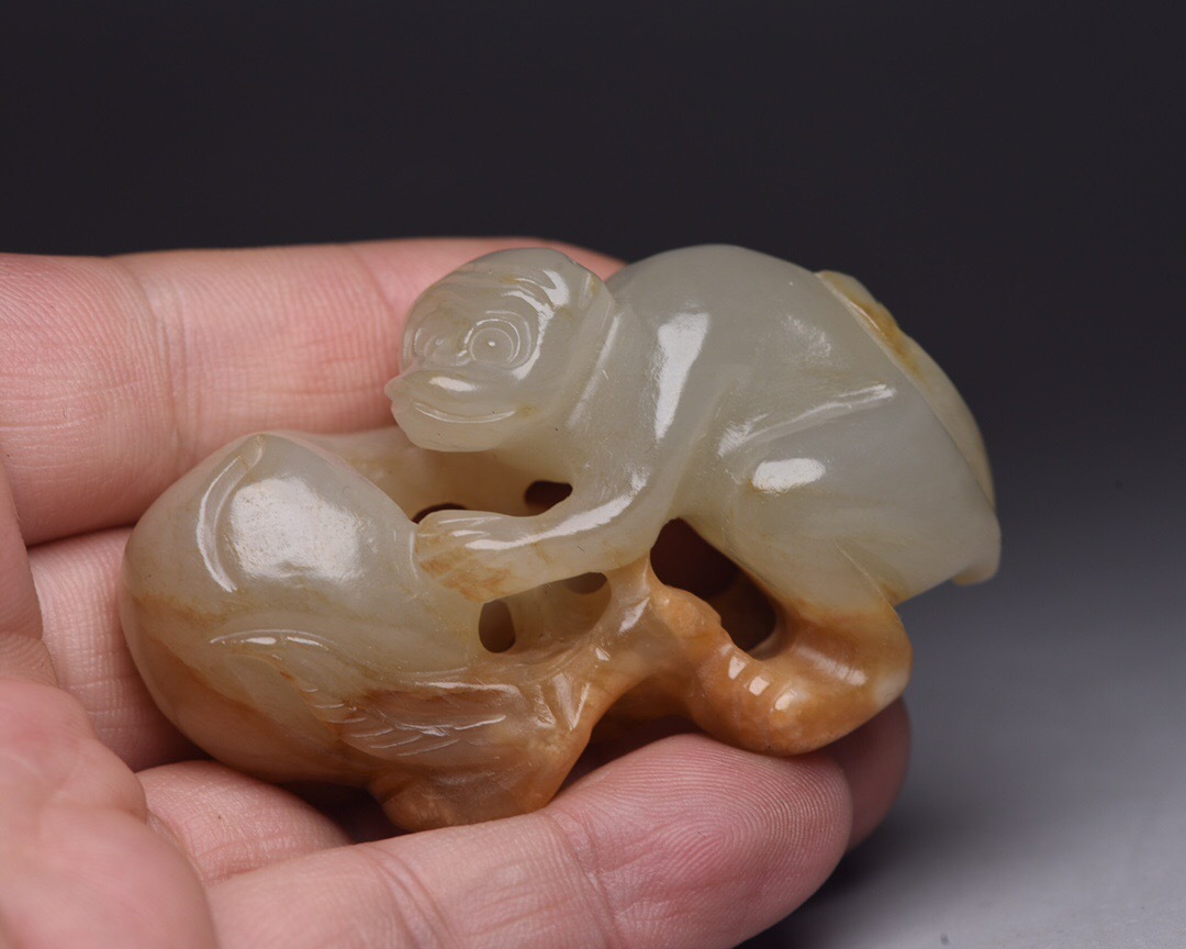 【超珍館蔵】和田玉製 細密彫 靈猴獻寿 置物 賞物 古賞物 古董品 古美術品 時代物 旧家蔵出 稀少珍蔵品