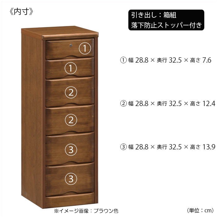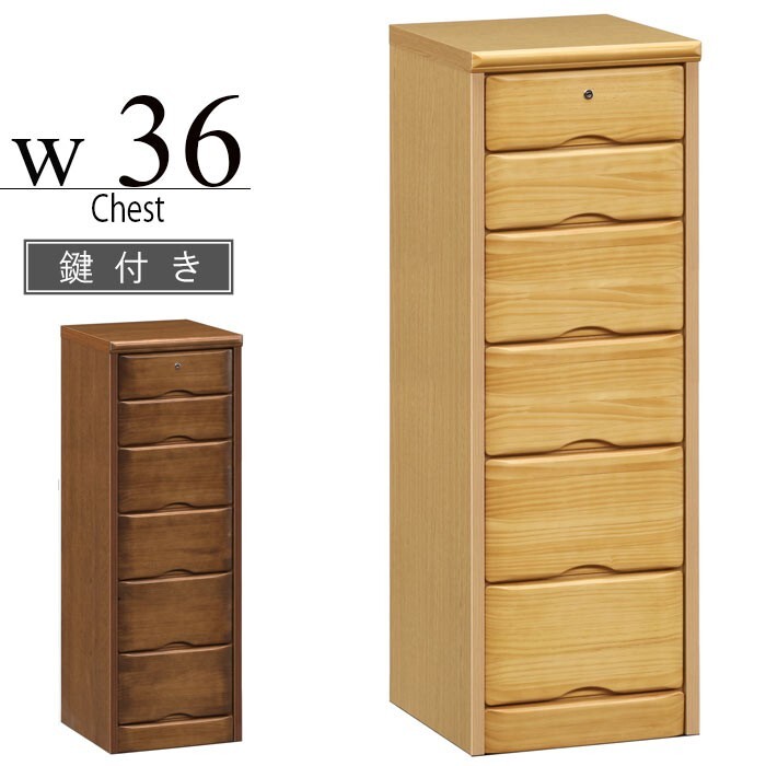 特  徴パイン材を表面材に採用したチェストです。最上部引き出しには防犯上安心な鍵付き。引き出しは落下防止ストッパー付き。ナチュラル・ブラウンの2色から選べます。