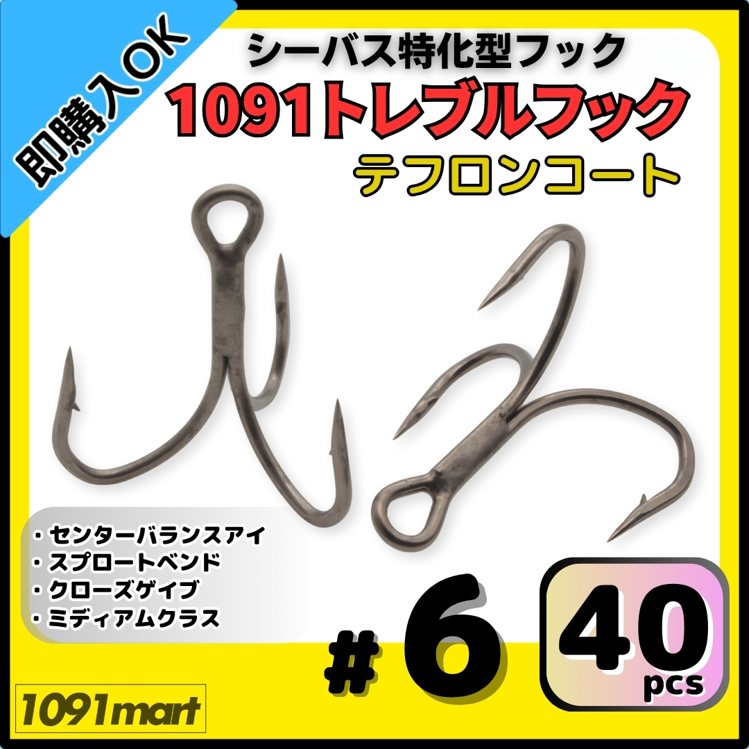 【送料無料】1091トレブルフック テフロンコート #6 40本セット 刺さり重視 バラしにくい シーバス特化型 トリプルフック ルアーフック