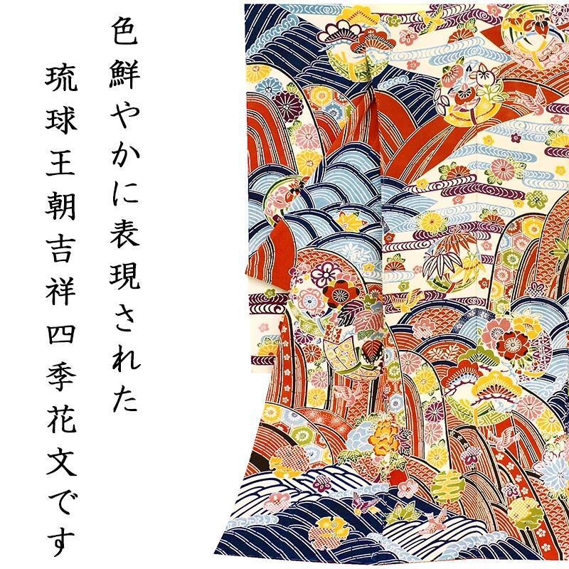 | ※記念感謝祭【仕立無料】京友禅工芸手染本加工振袖☆特撰紅型琉球王朝吉祥四季花文☆別誂シボちりめん生地使用 |