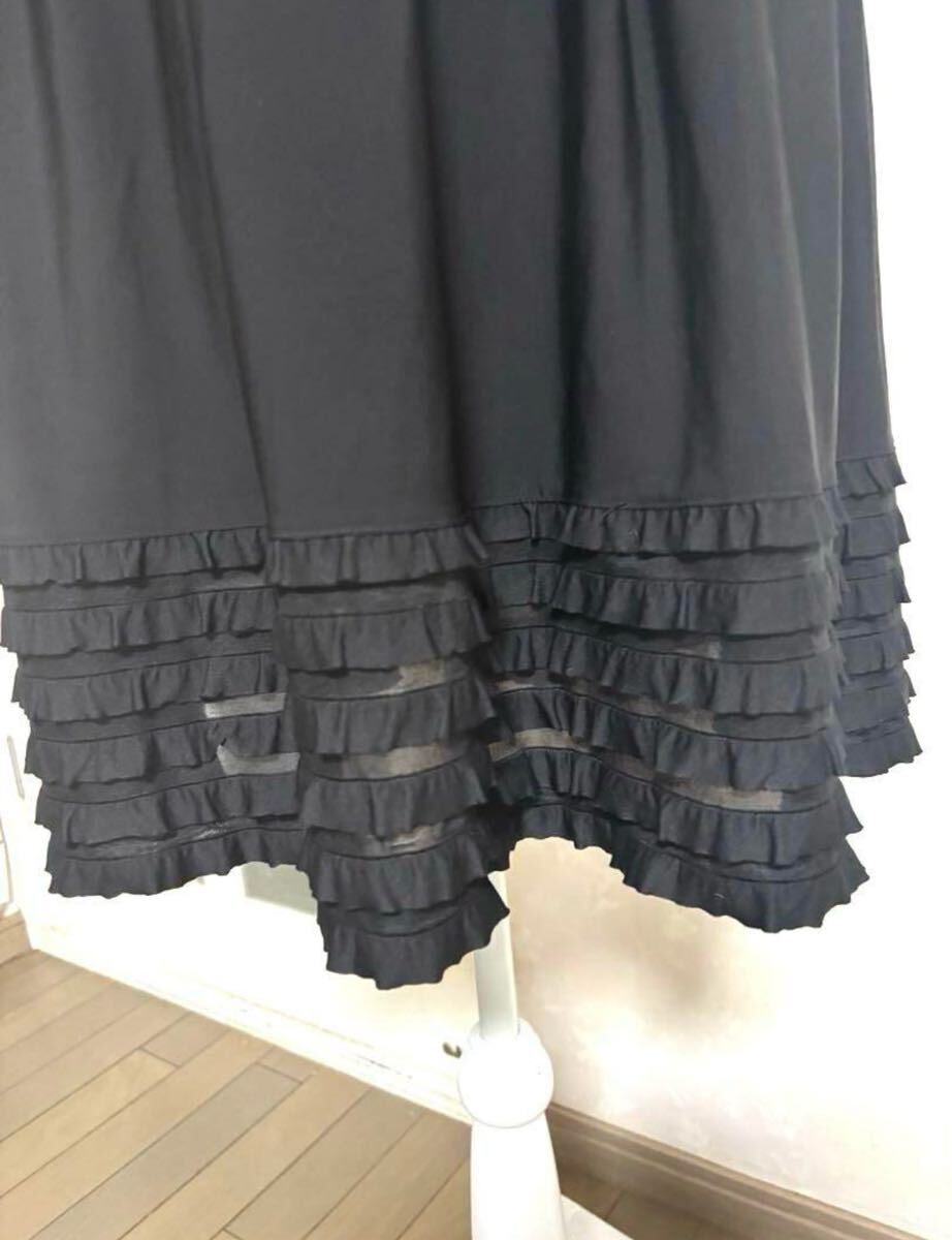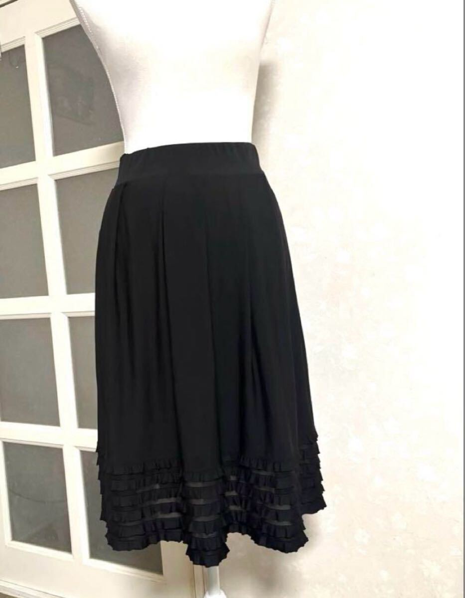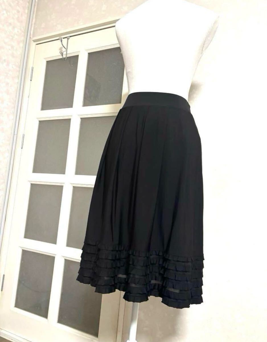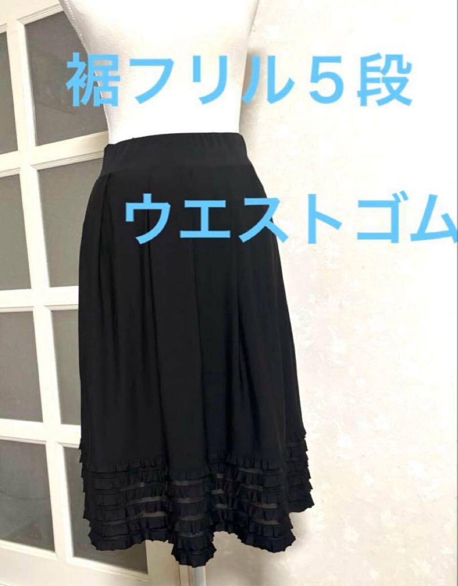 五段フリルデザインのブラックでしなやかなひざ丈フレアスカートです。
