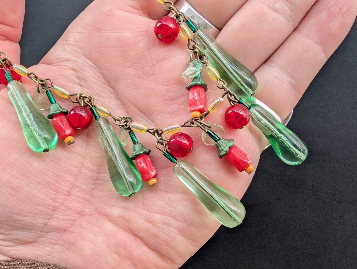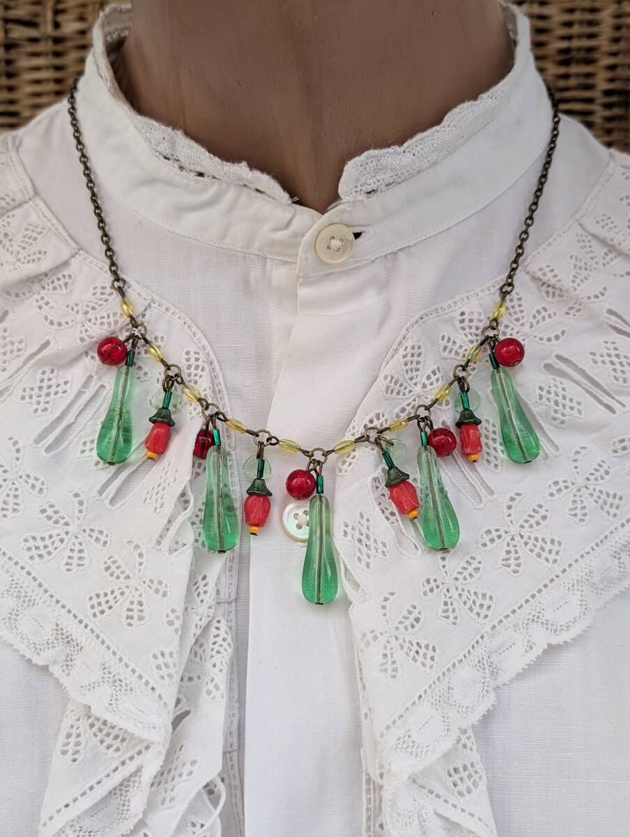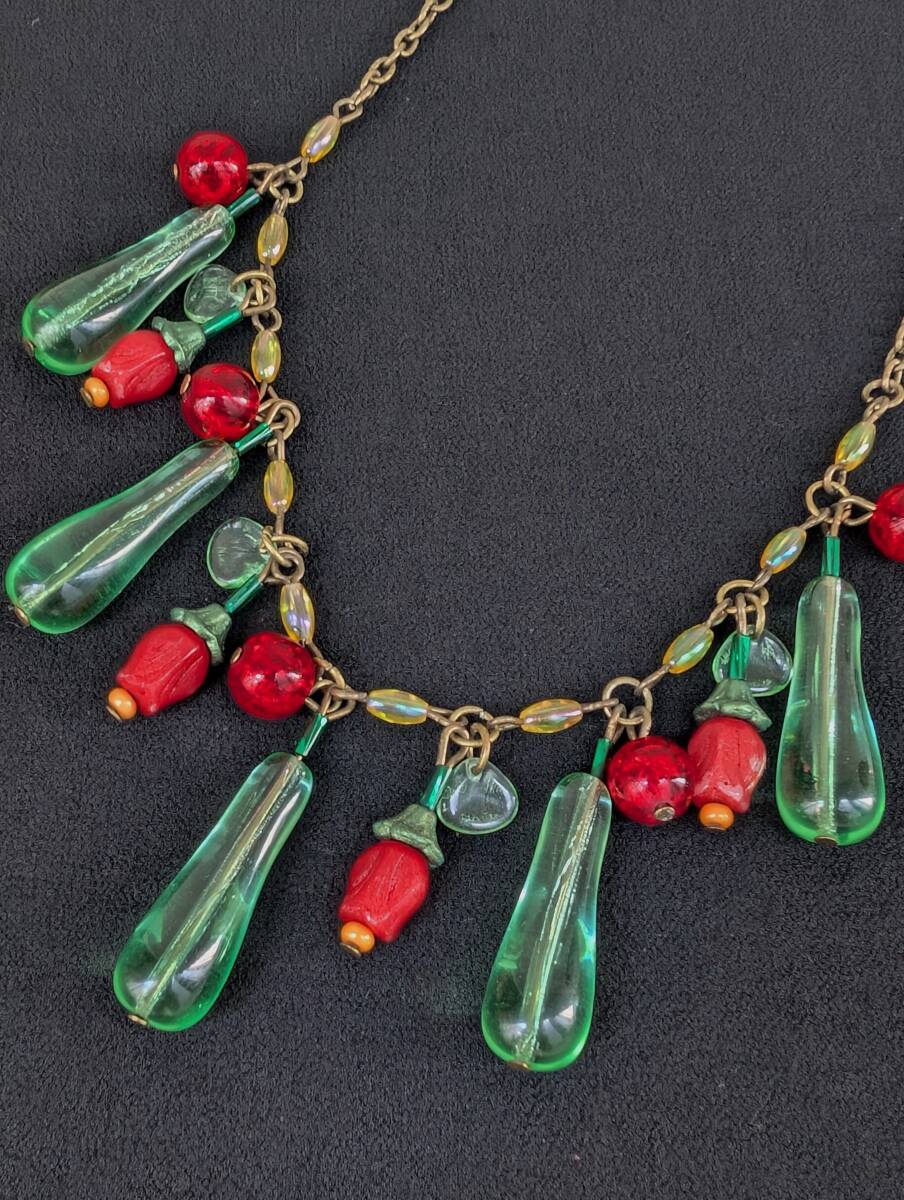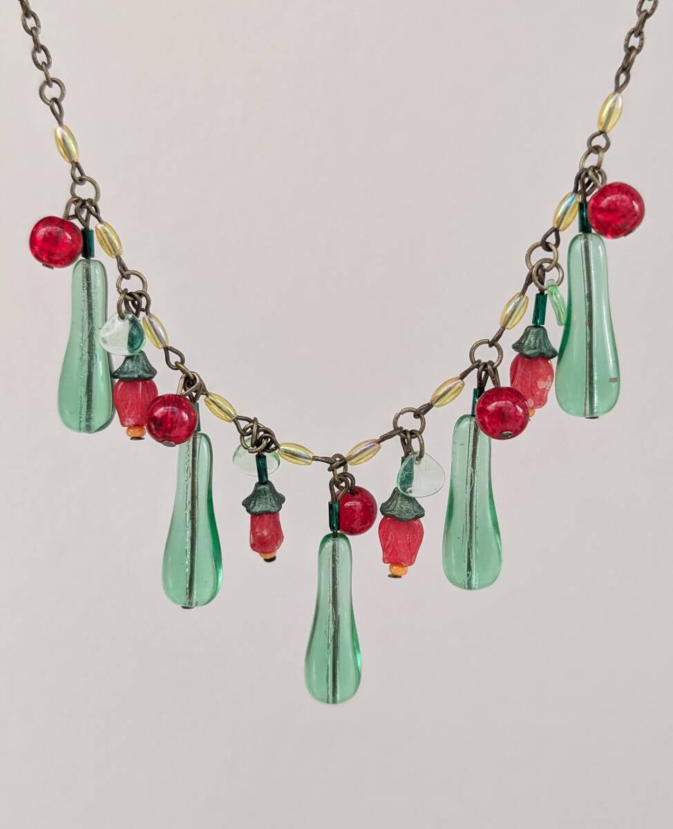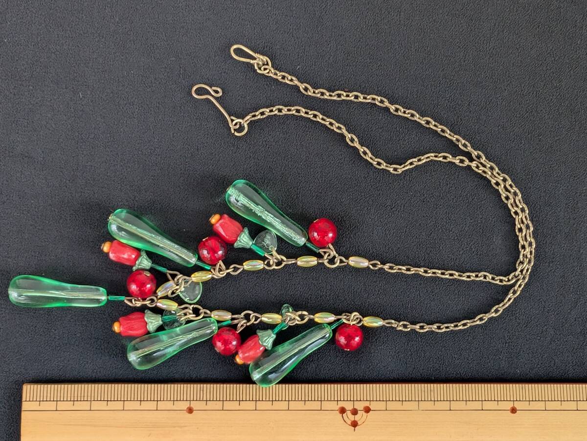 イギリスヴィンテージ ティアードロップネックレス 70’s80’sフルーツフラワーつぼみ/20’s30’sアンティークチェコガラス使用ΓOT