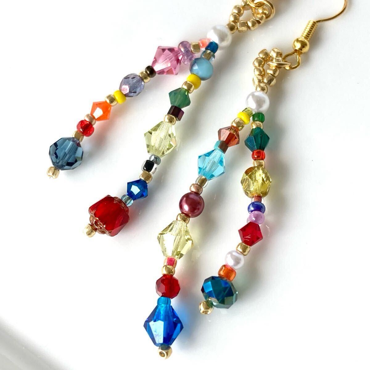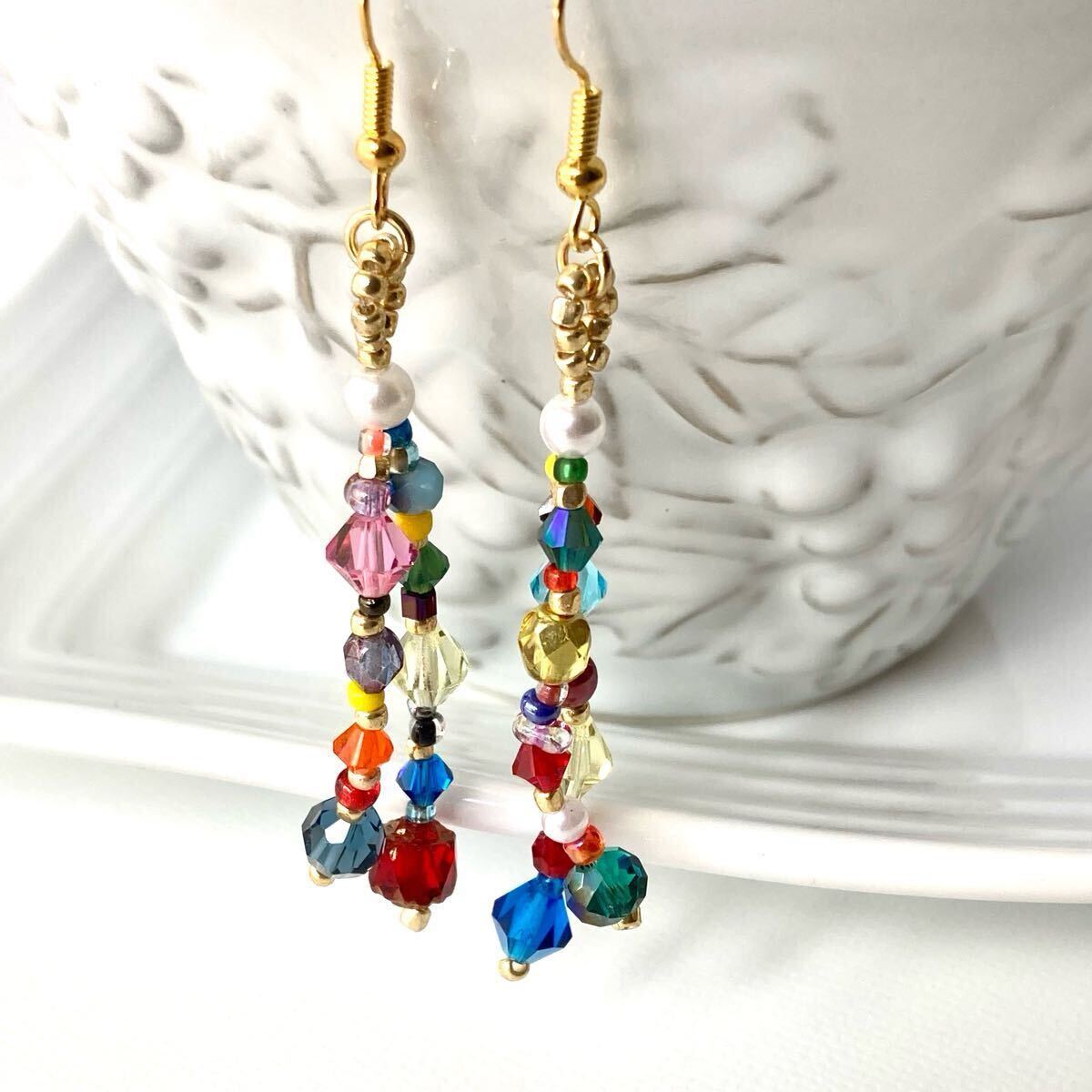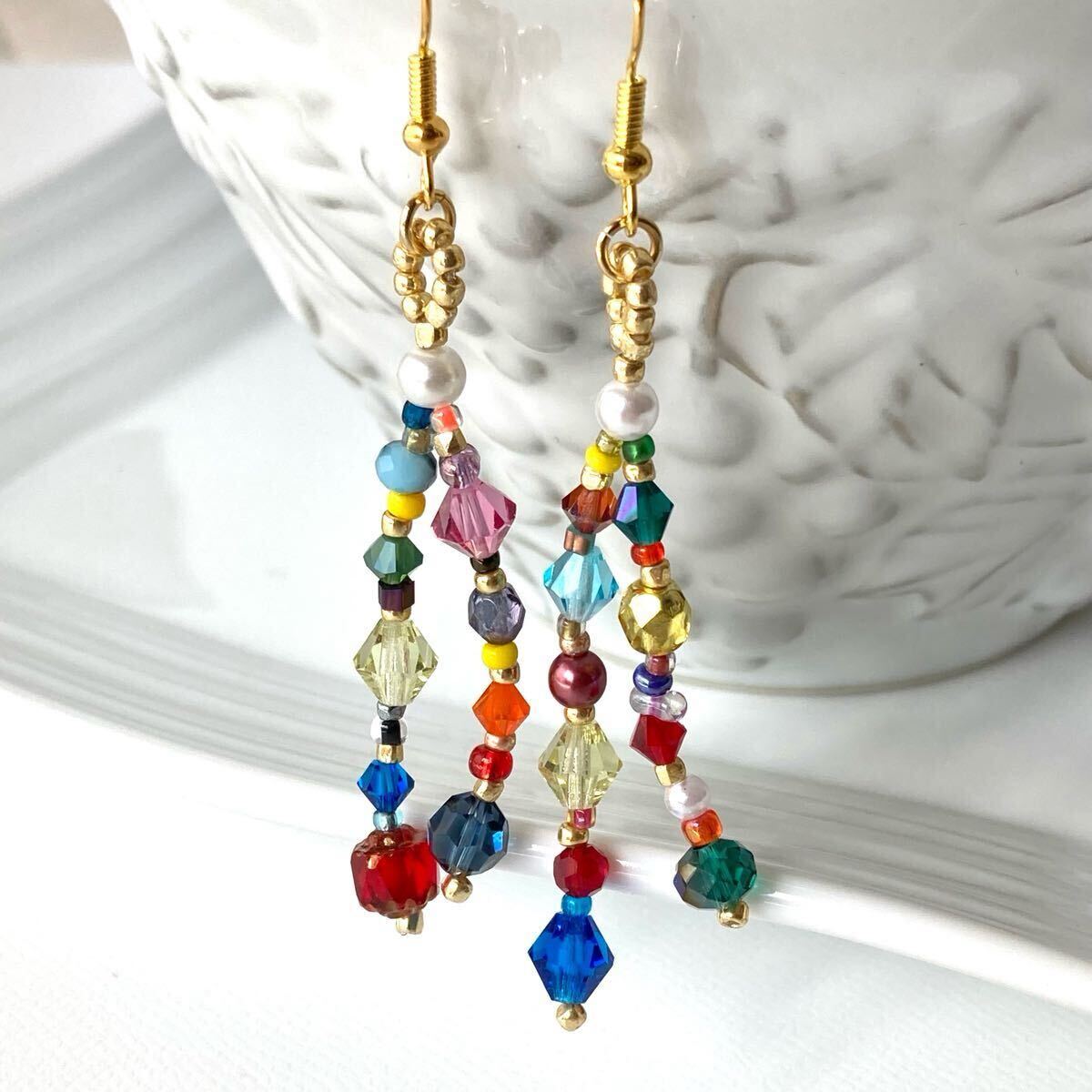 ビーズ ピアス ハンドメイド いろいろビーズのカラフルなゆれるピアス です。