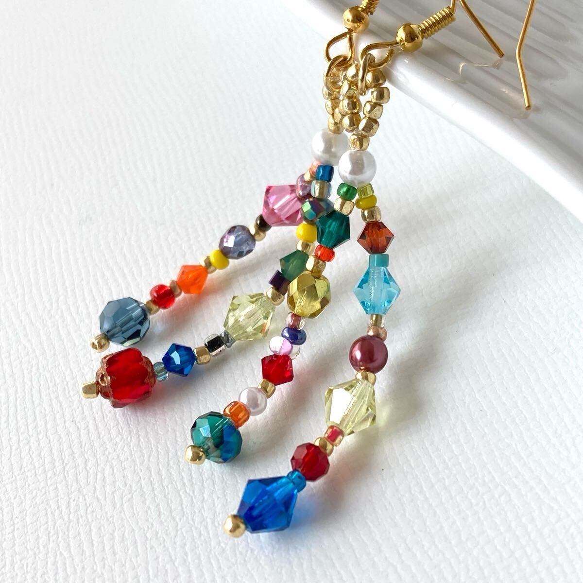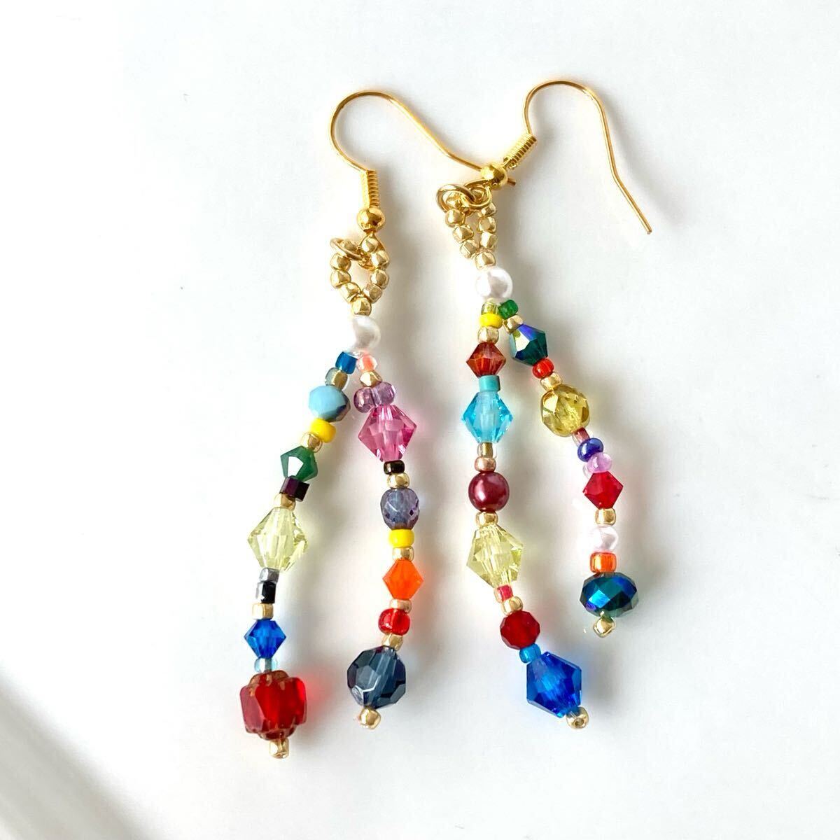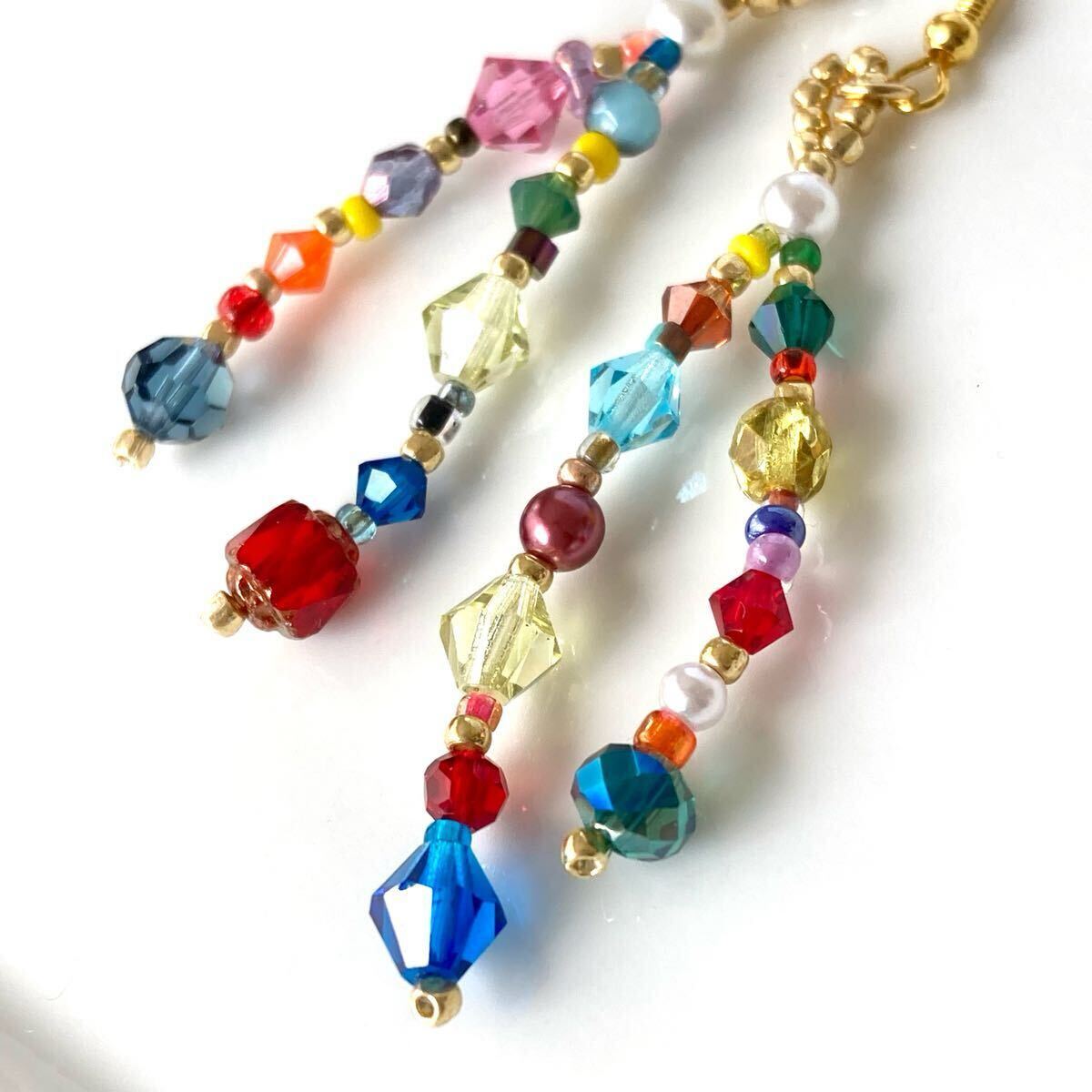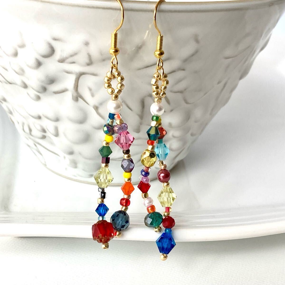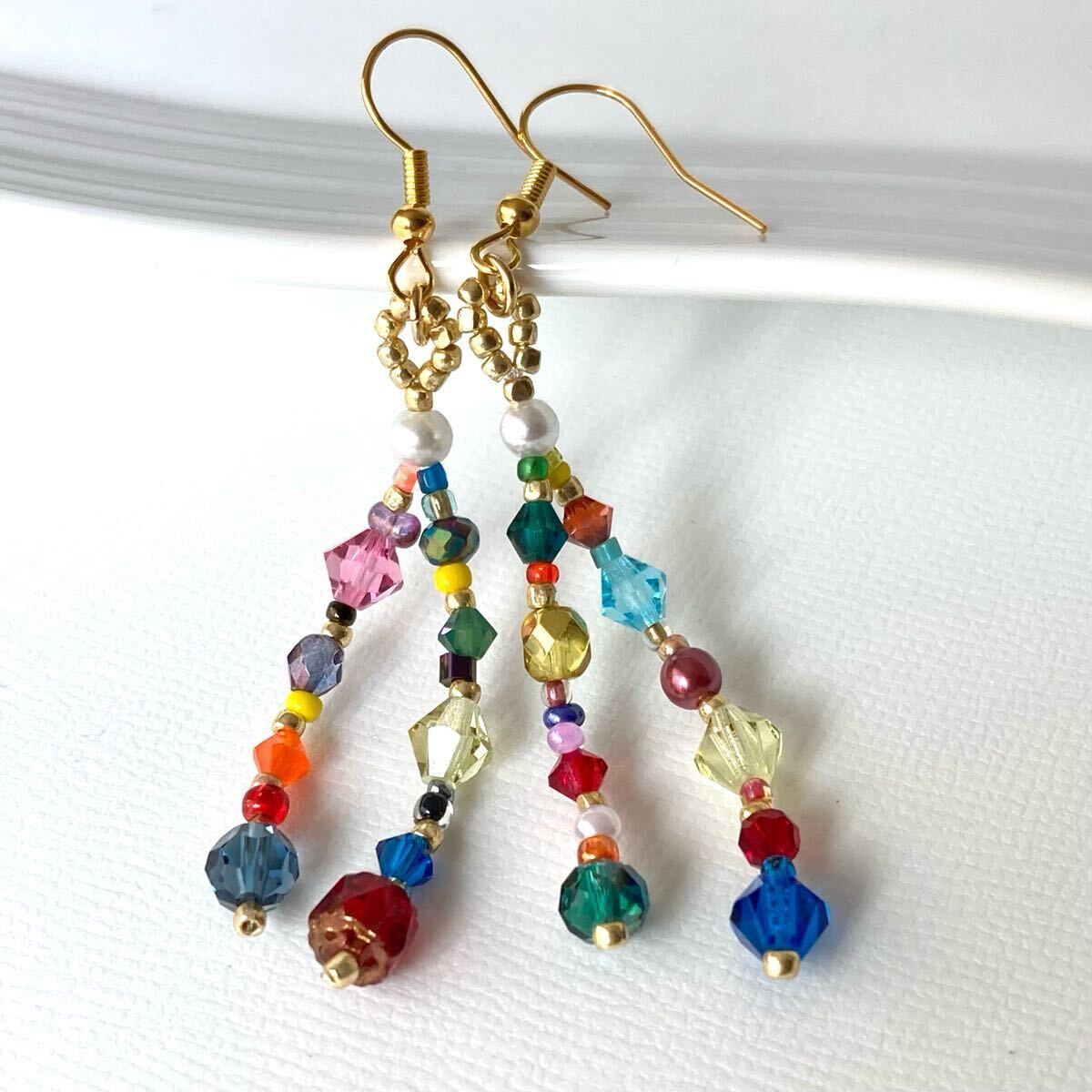 色々な色と形のビーズで作ったカラフルなゆれるピアスです。