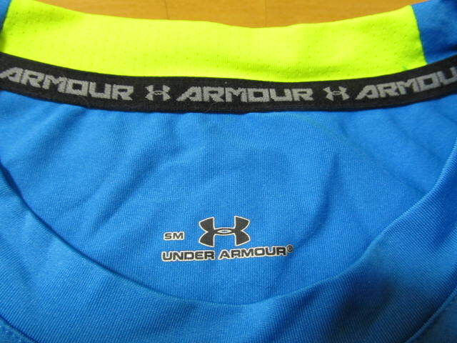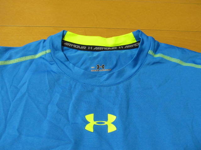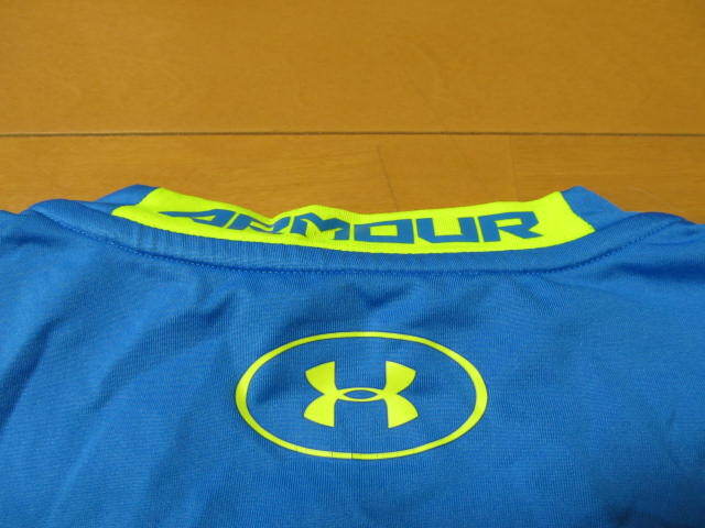 良品【UNDER ARMOUR】アンダーアーマー ヒートギア コンプレッション ノースリブモック 青×蛍光黄 SM スポーツインナー