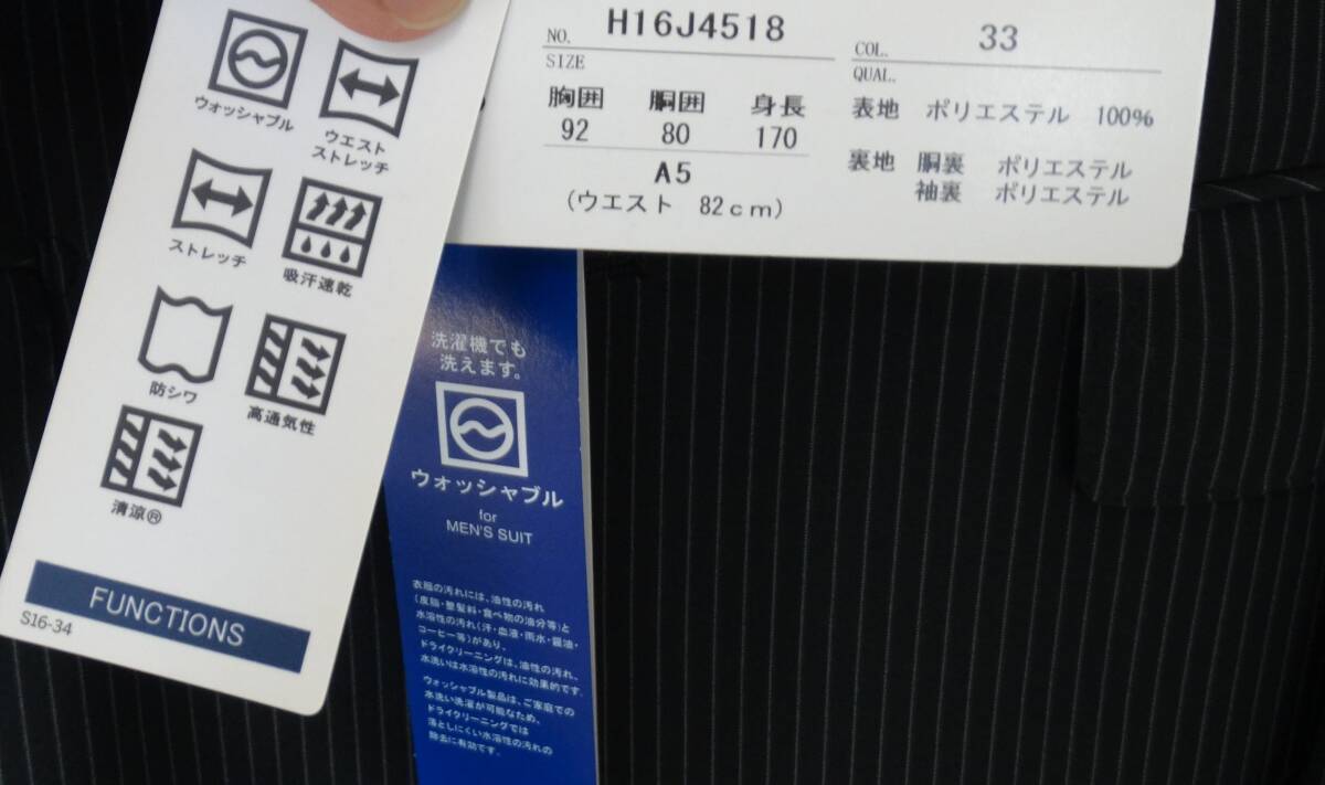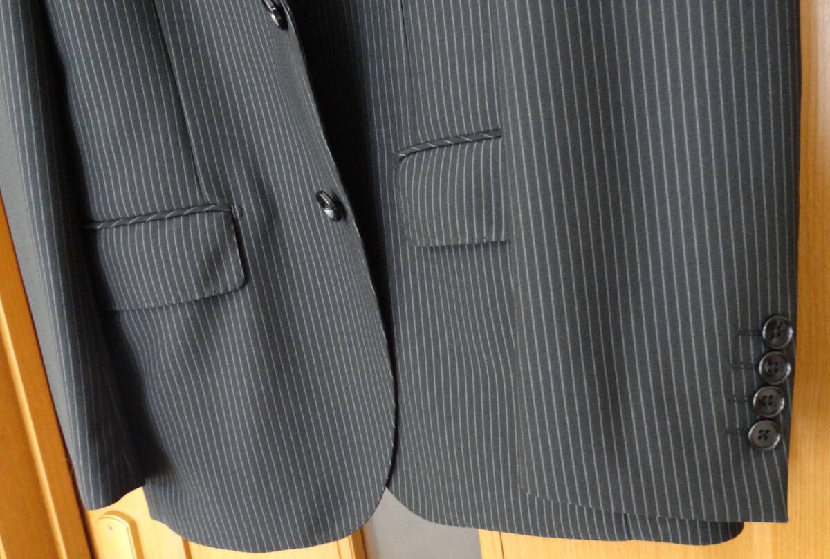 Mr.JYUKOのチャコールグレーストライプでサイズはA5のセンターベントのスタイリッシュスーツです。タグには身長170胴囲80胸囲92素材は表地ポリエステル100%裏地ポリエステルと書いてます。