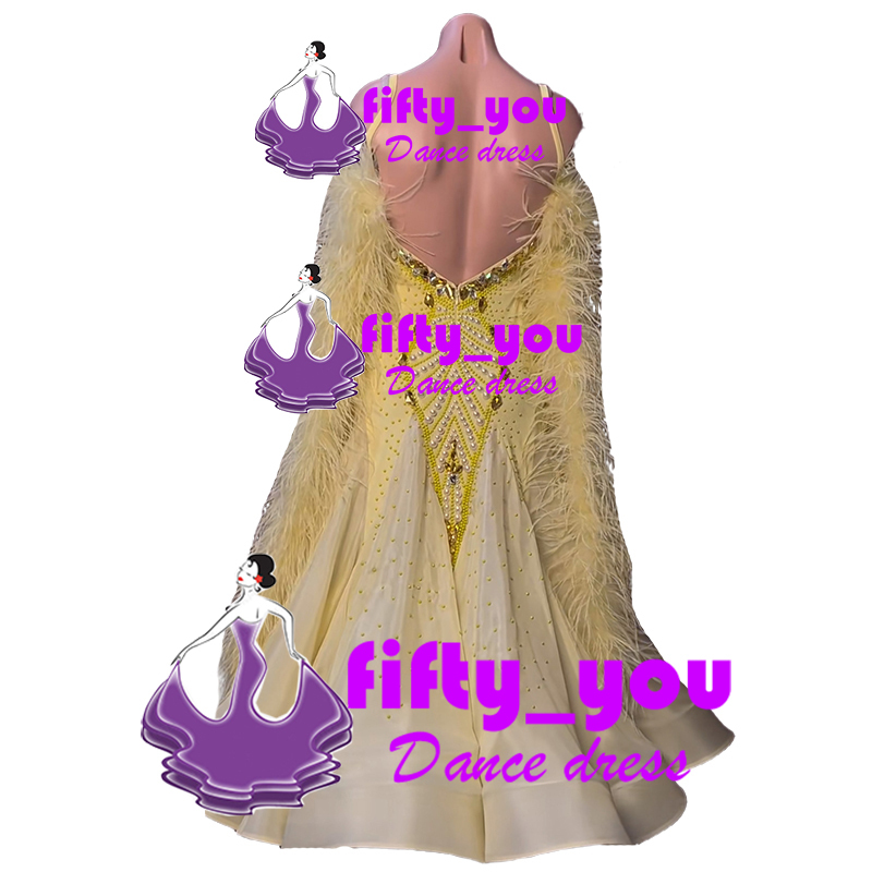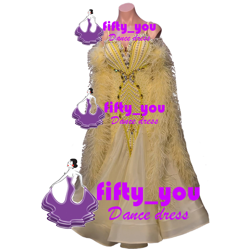 新品fifty_you 競技パーティー用素敵ドレス  レディース社交ダンス衣装  セミオーダー スタンダードドレス ボリューム羽飾り 黄色