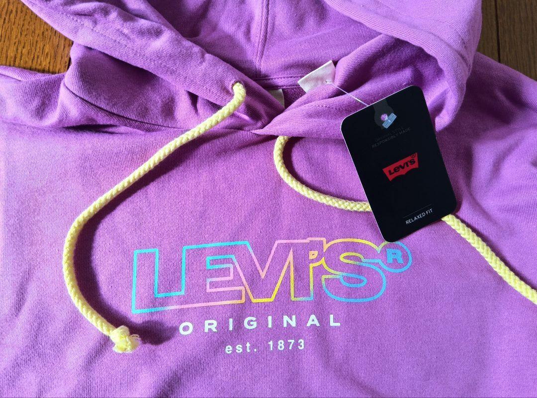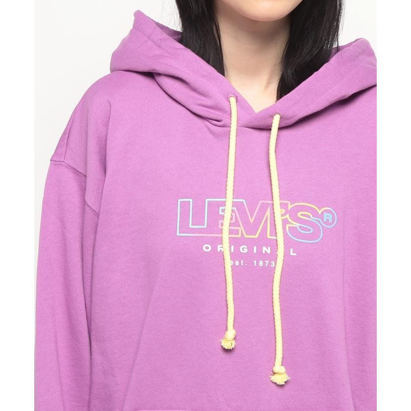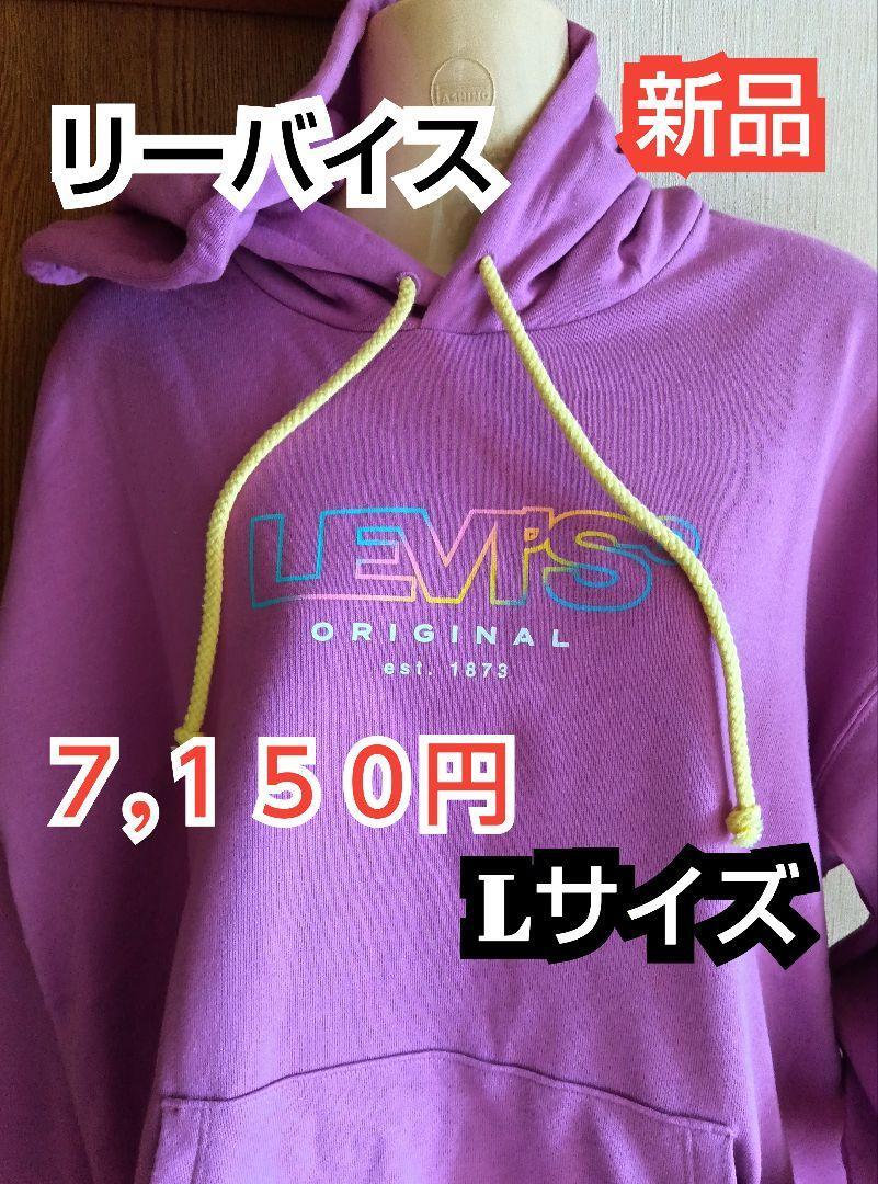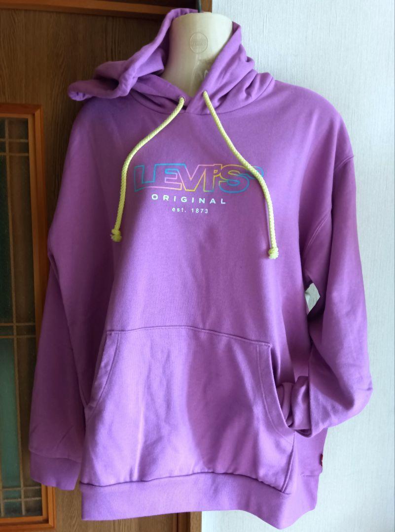 フード付きの紫色パーカー、リーバイスのロゴ入りで新しいスタイルを楽しめます。