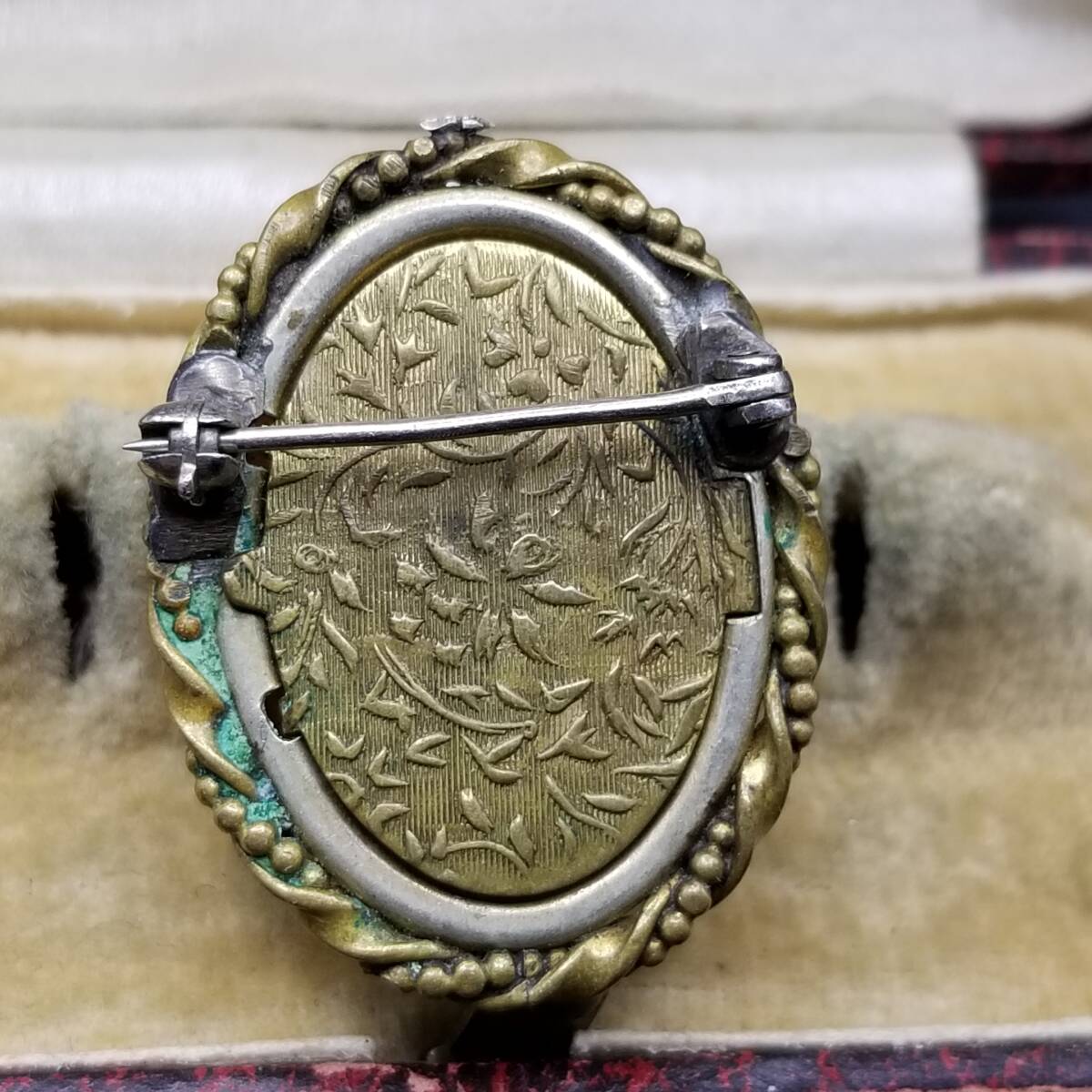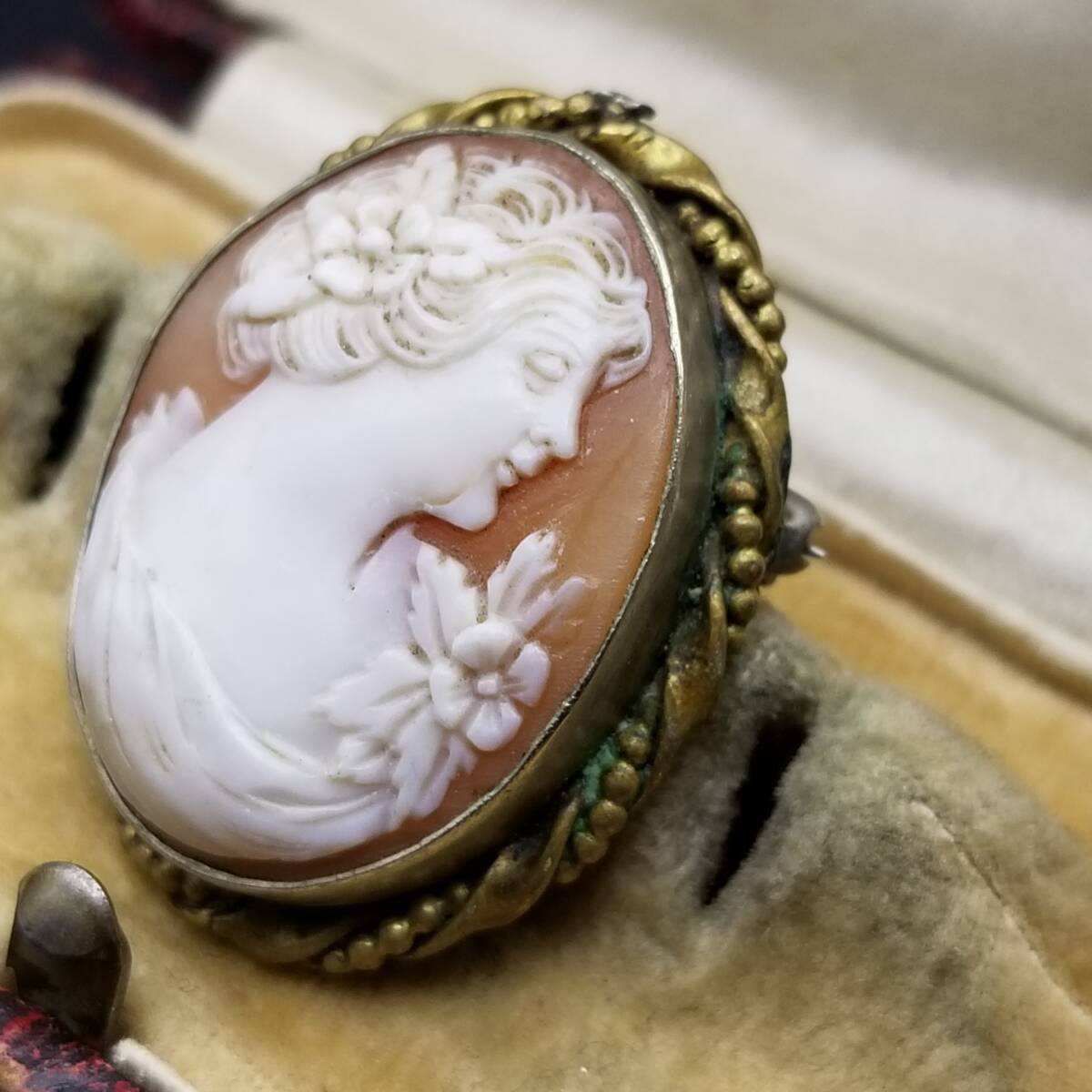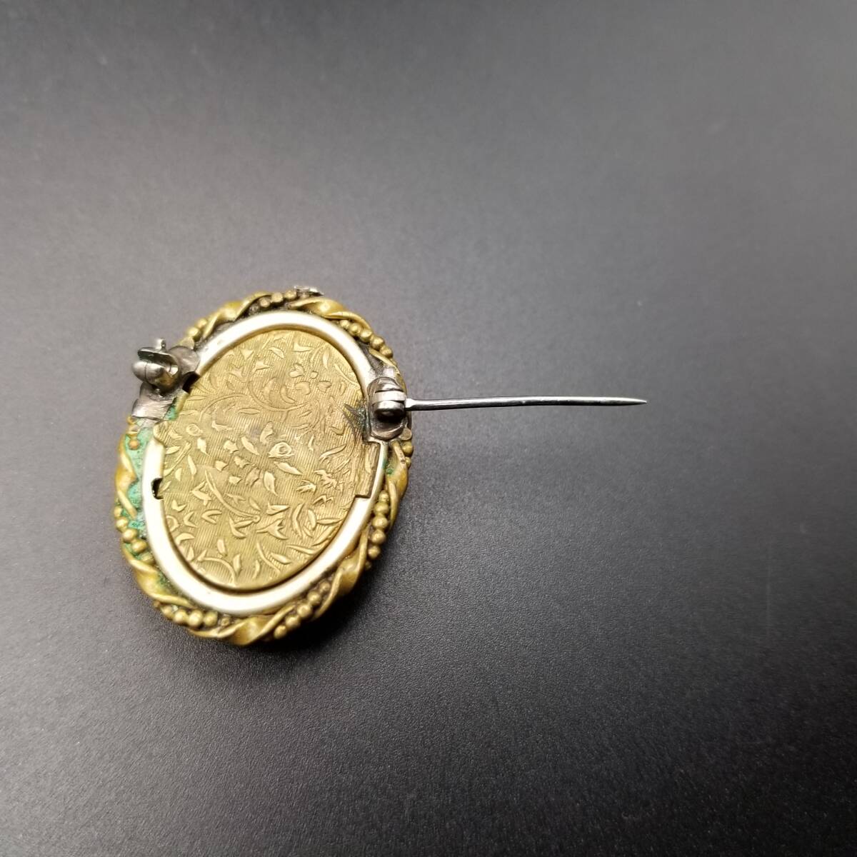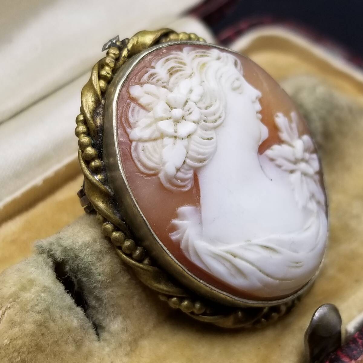 ドレスを着た女性の横顔 シェルカメオ ヴィンテージ ブローチ ケーブルリム 装飾美 オーバルフレーム レトロ エレガント ロケット調 Y22-G